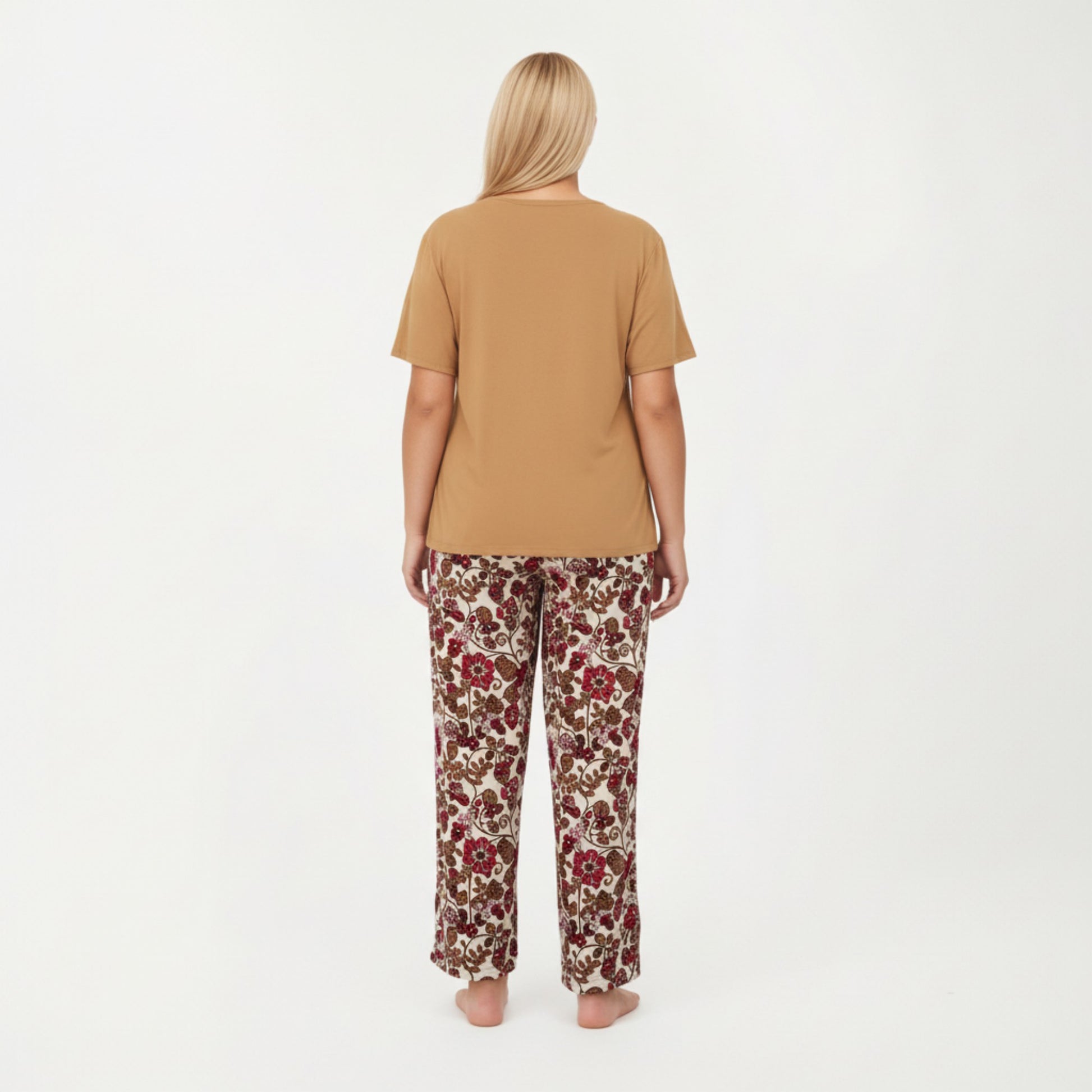This Anna-Kaci Women's 2-Piece Set features a soft stretch knit top paired with printed wide-leg pajama pants for a comfortable, coordinated look. The short sleeve top drapes smoothly with a lightweight feel, while the pants offer a relaxed silhouette enhanced by an intricate floral print. Together, they create a breathable, easy-to-wear pajama set designed for gentle movement, softness, and all-night comfort.