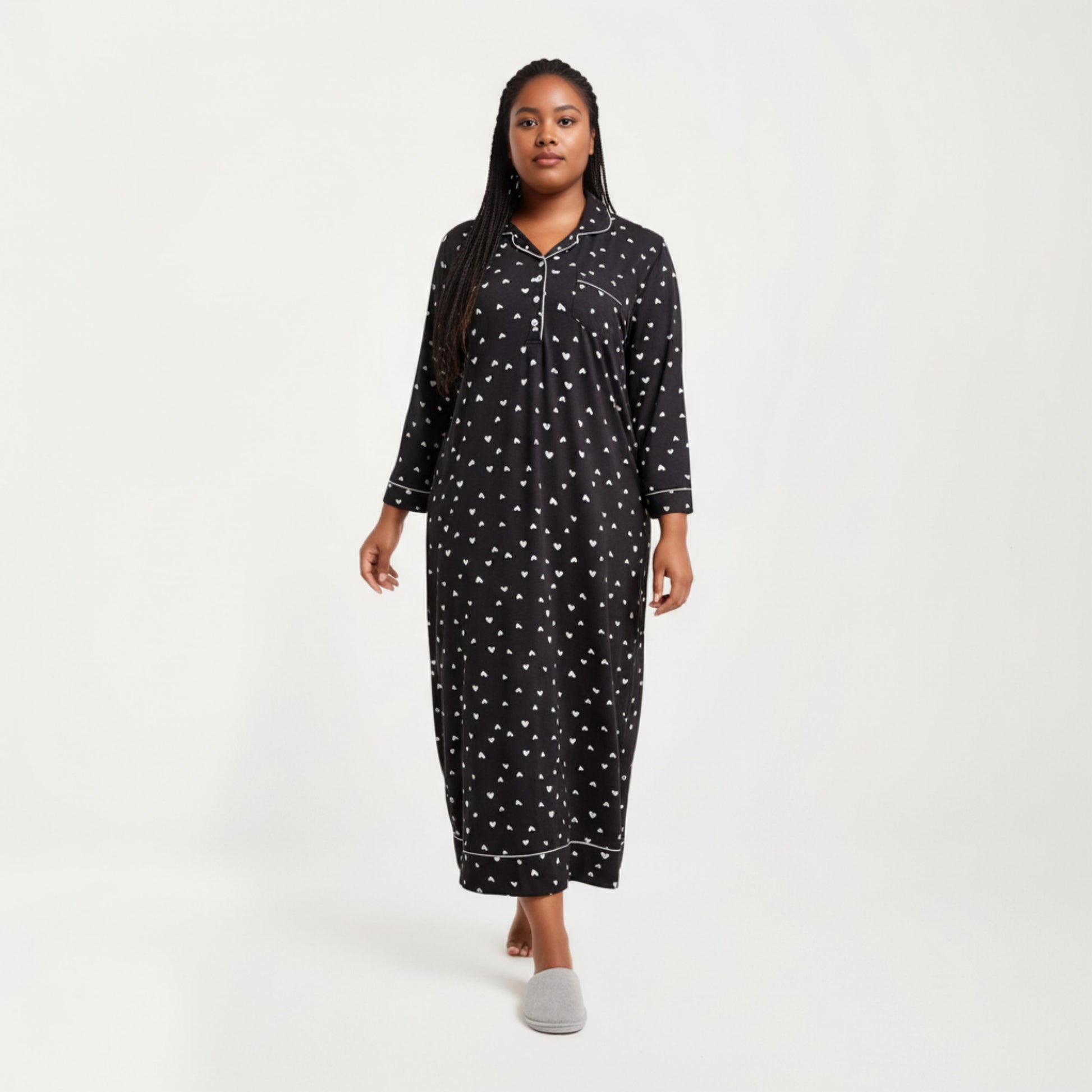 Heart Print Long Sleeve Maxi Nightgown with Soft Stretch Fabric, Classic Piped Collar Detail