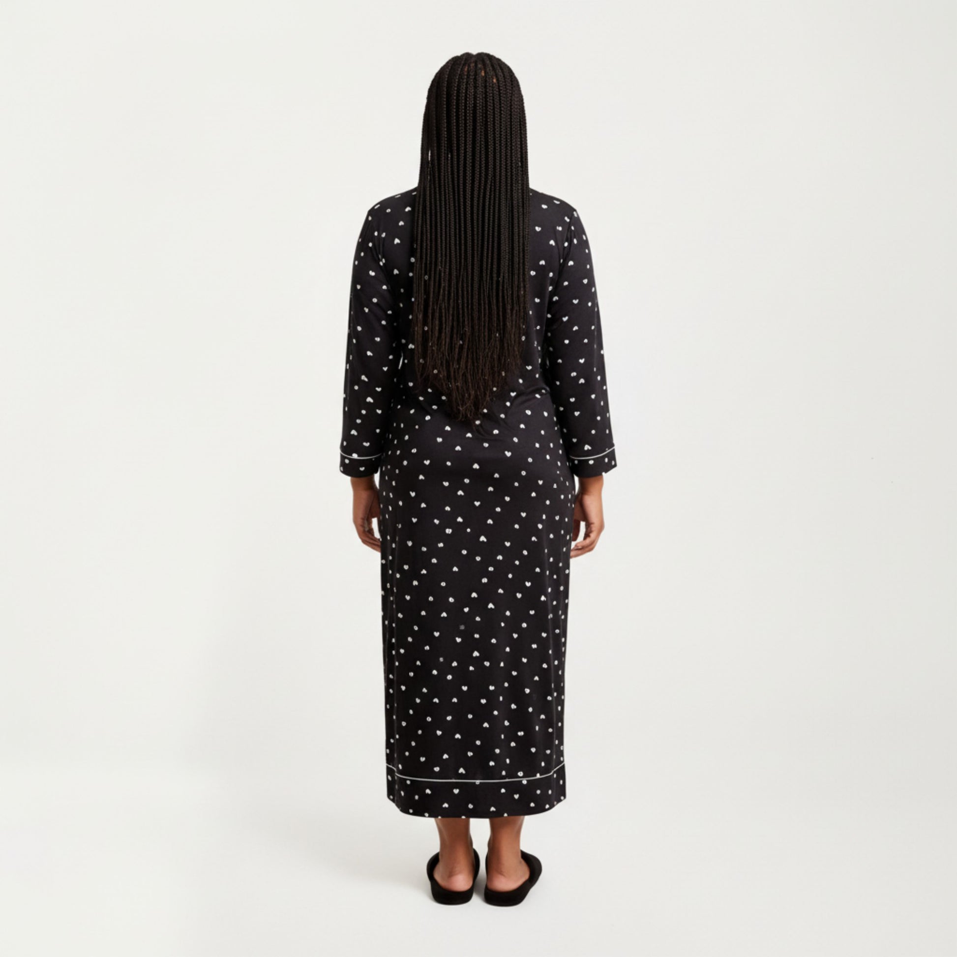 This Anna-Kaci Women's maxi nightgown features a soft stretch fabric printed with delicate heart motifs that create a charming, cohesive look. The long sleeves and piped collar add classic sleepwear detailing, while the relaxed flowing silhouette provides ease and comfort. A chest pocket and partial button placket enhance the design with subtle structure. Crafted for softness and movement, this nightgown offers a smooth, breathable feel.