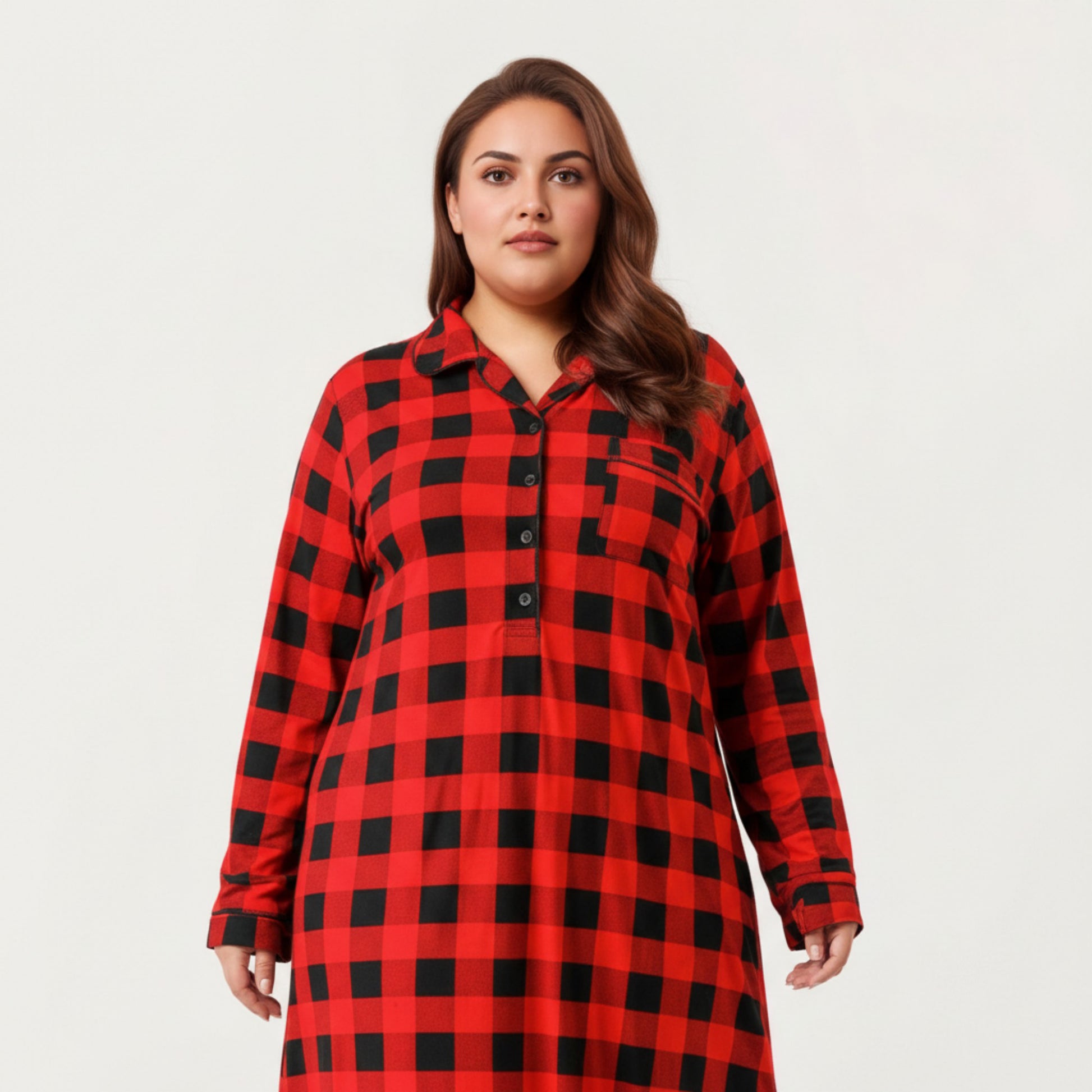 Plaid Long Sleeve Midi Sleep Shirt with Soft Brushed Texture, Button-Front Detail and Relaxed Loose-Fit Silhouette