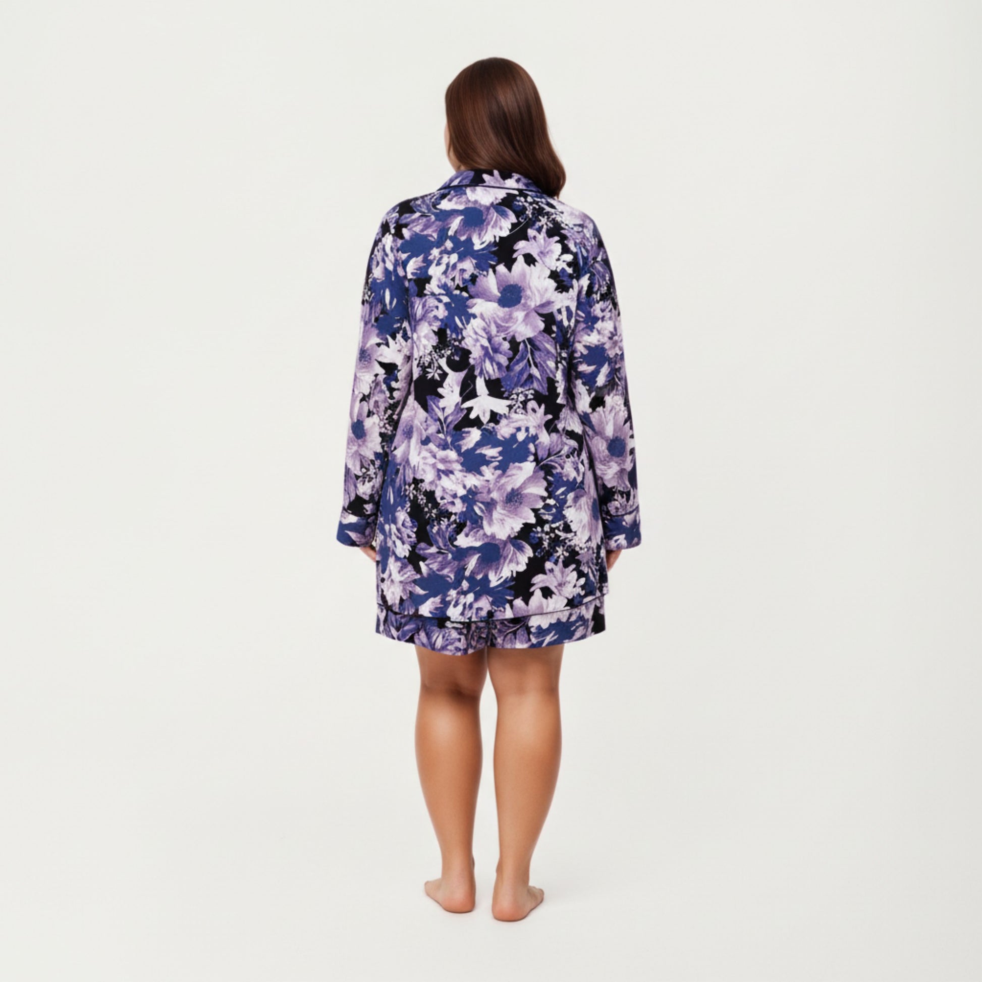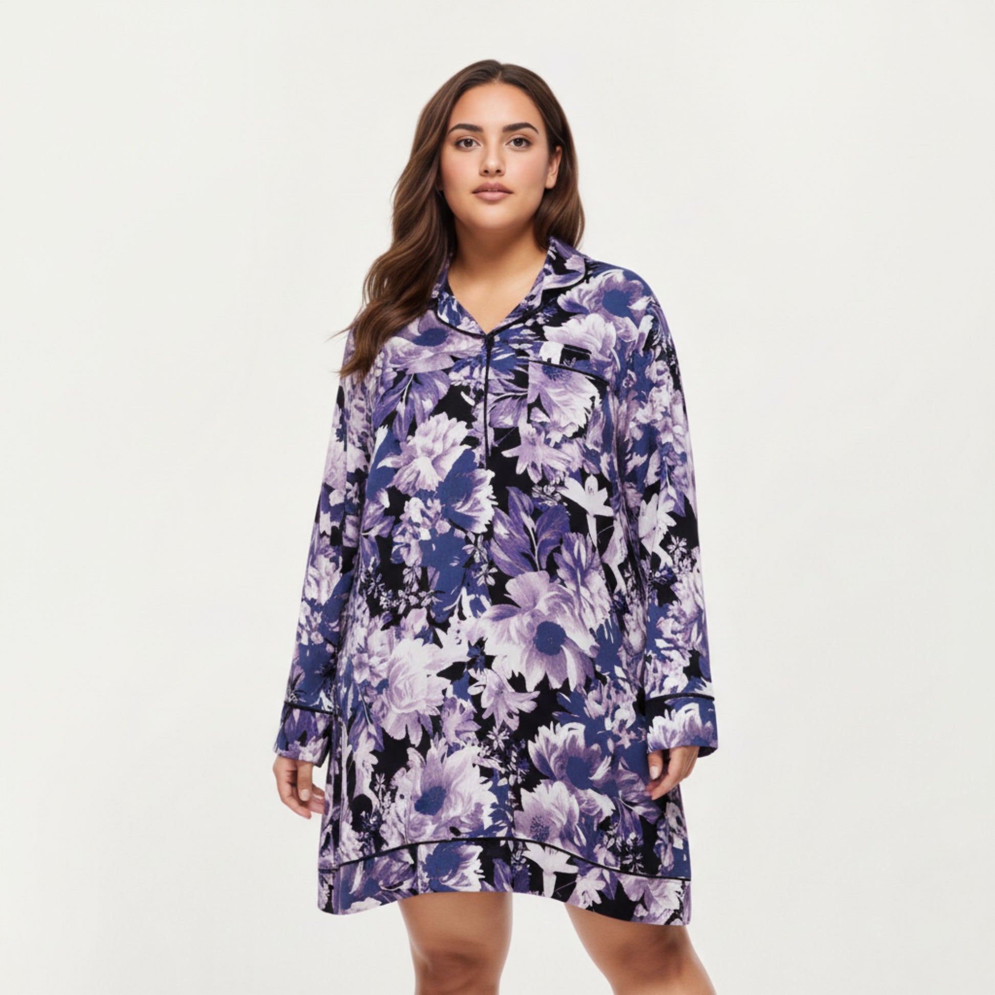 Floral Print Long Sleeve Sleep Shirt with Soft Fabric, Notched Collar Detail and Relaxed Above-Knee Silhouette
