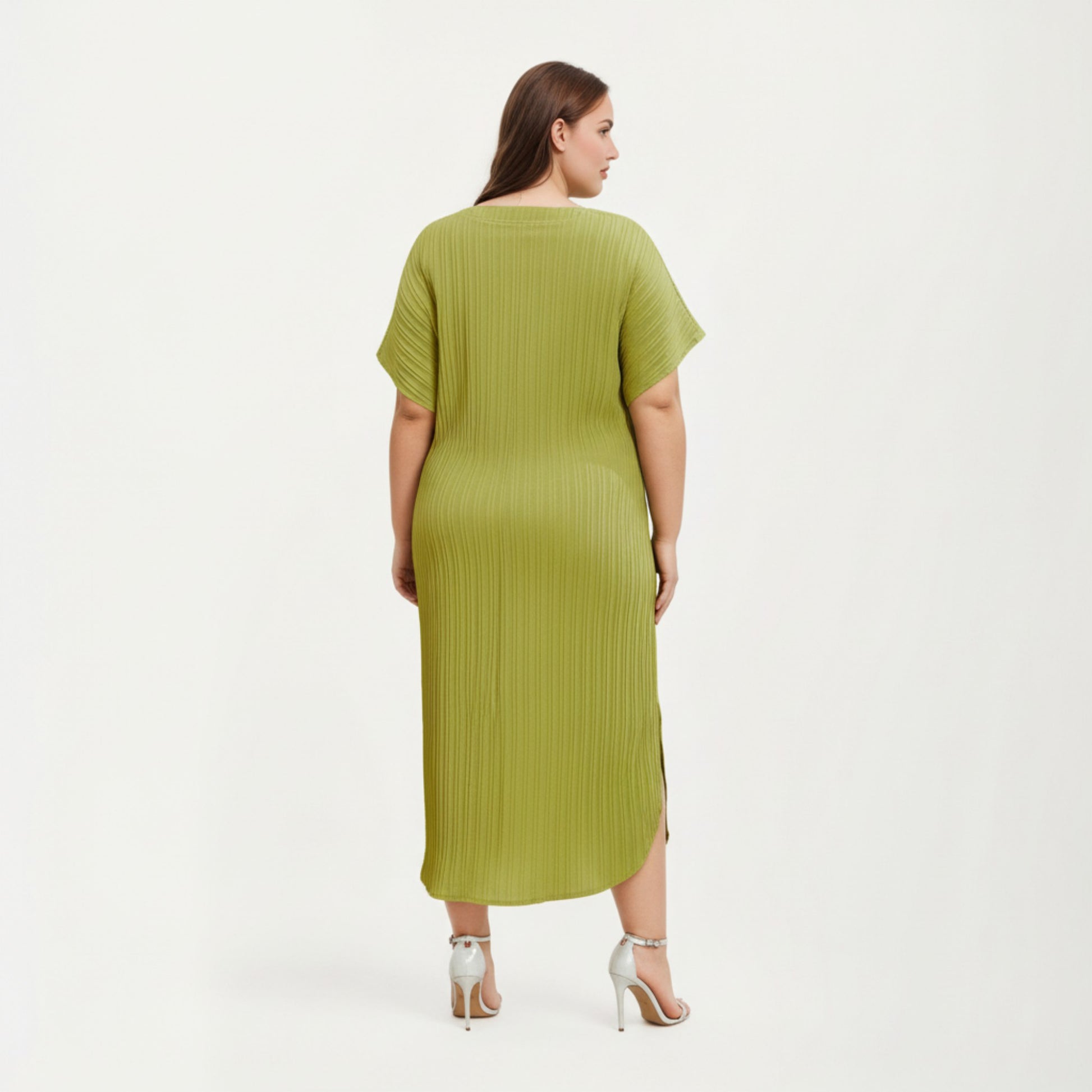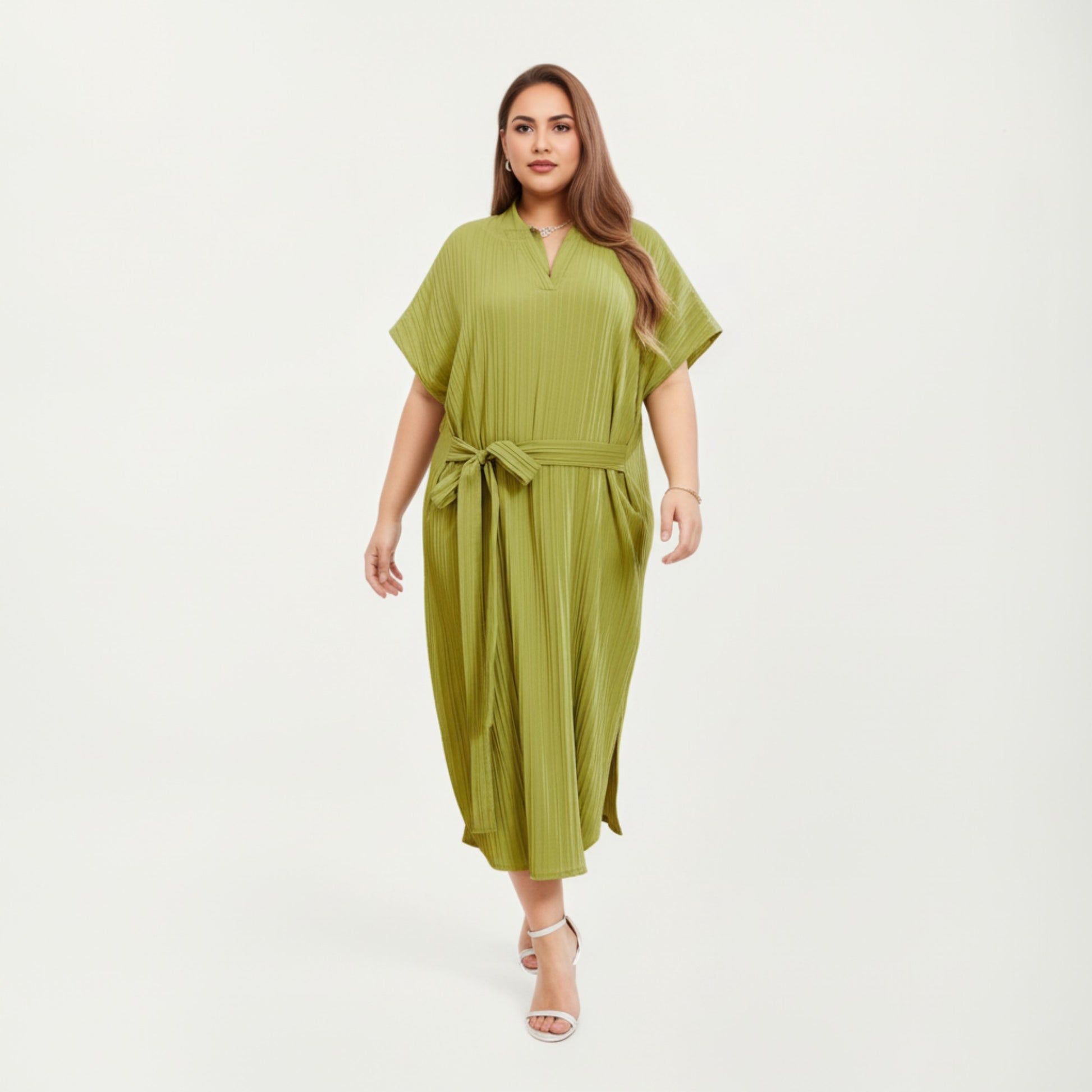 This Anna-Kaci Women's pleated midi dress features a soft, flowing texture that moves beautifully with each step. The relaxed drop-shoulder sleeves create an easy drape, while the adjustable fabric tie belt defines the waist for a flattering silhouette. A subtle split neckline adds gentle structure, and the long midi length offers smooth, graceful coverage. Crafted for comfort, this dress delivers effortless style and refined movement.