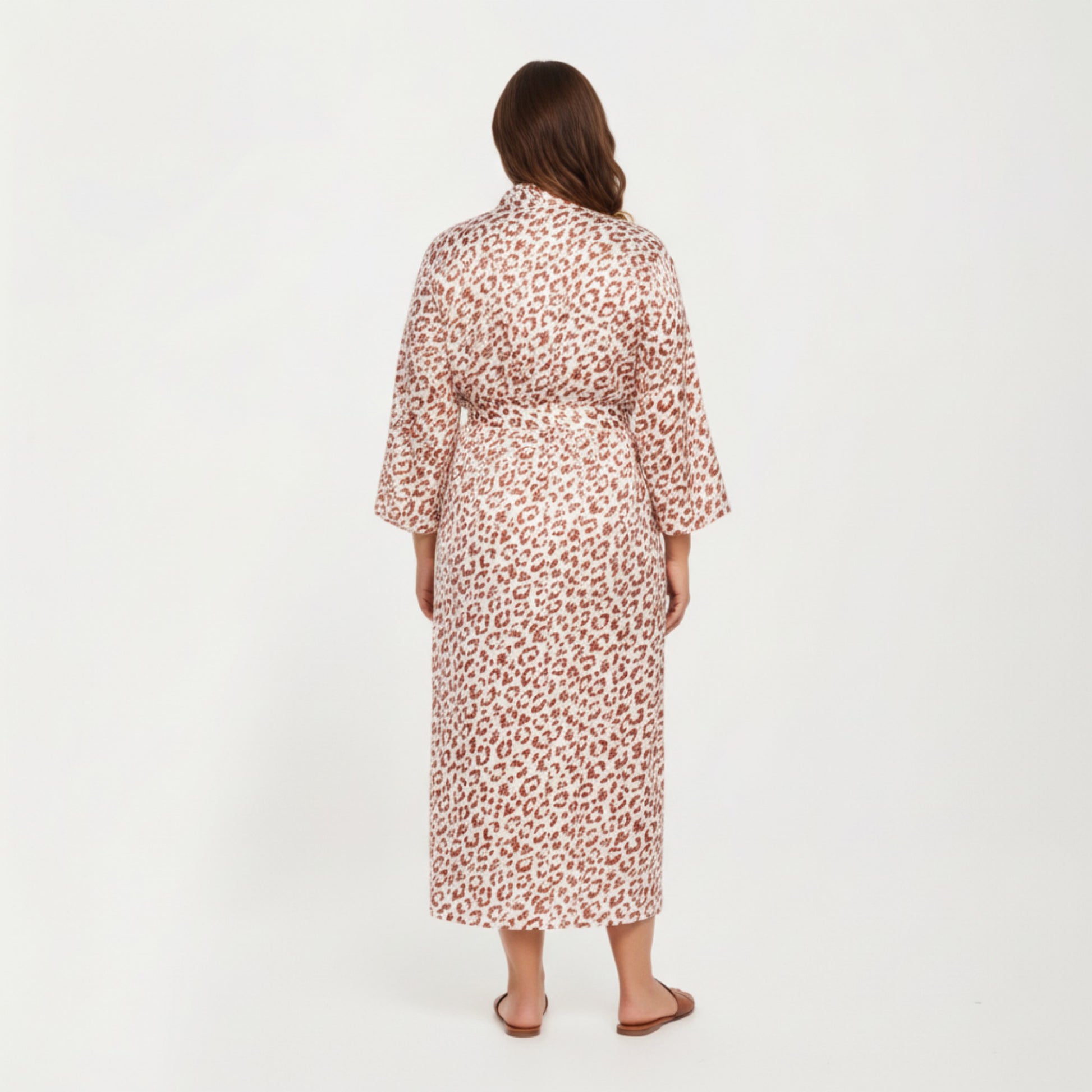 Satin Leopard Print Robe with Waist Tie Soft Silky Fabric Wide Sleeves and Flowing Longline Silhouette