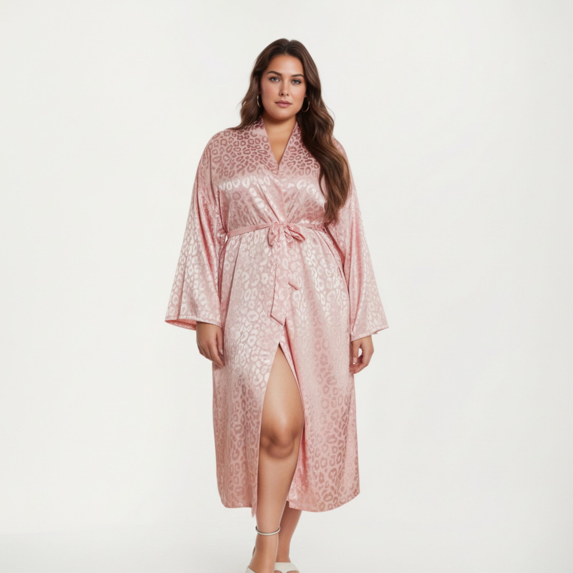 This Anna-Kaci Women's robe features a subtle jacquard leopard pattern woven into smooth satin fabric for a refined, textured finish. The waist tie allows a customizable fit, while the longline silhouette and wide sleeves create soft, graceful movement. Crafted from lightweight, silky material that feels gentle on the skin, this robe delivers an elevated layering option with a polished, luxurious feel.
