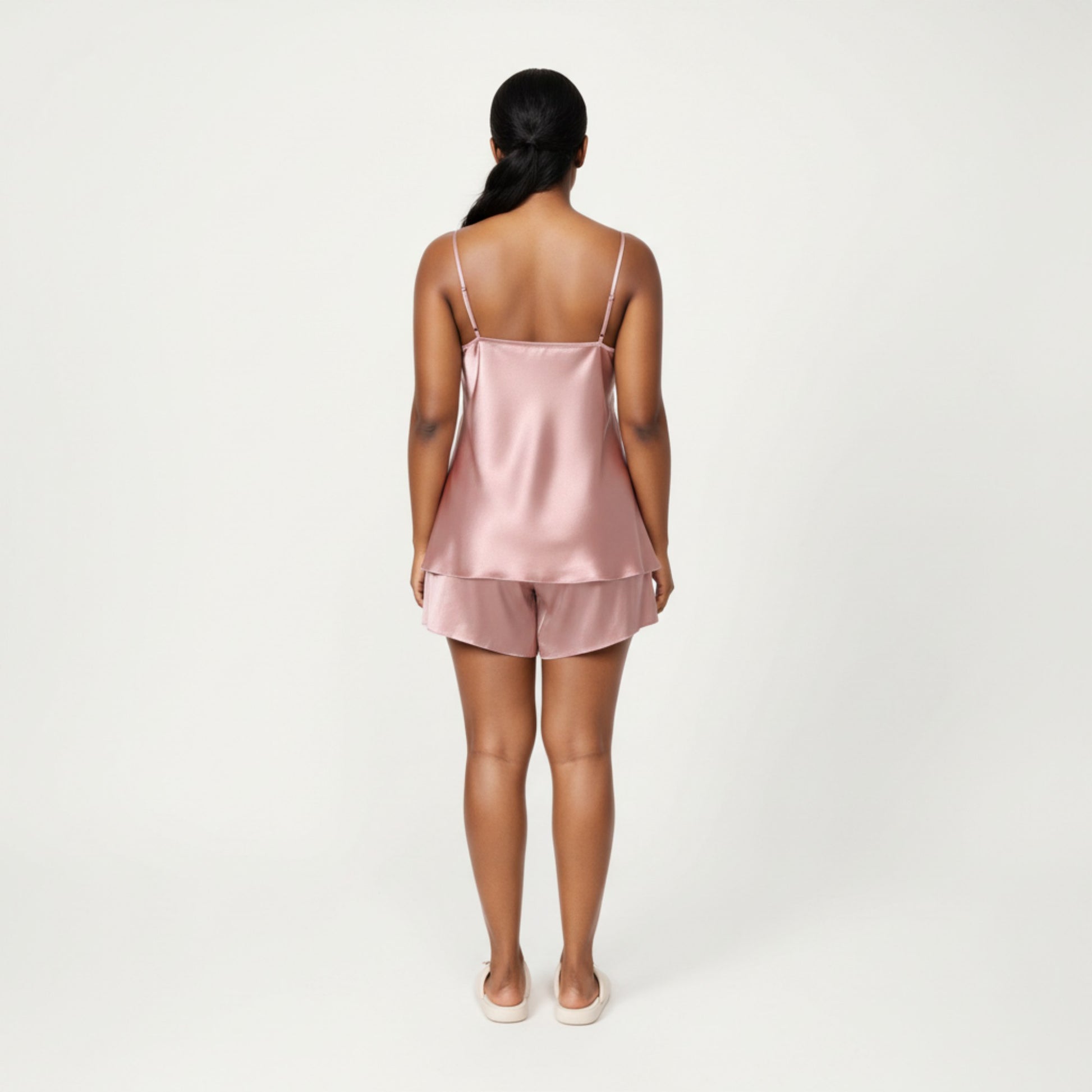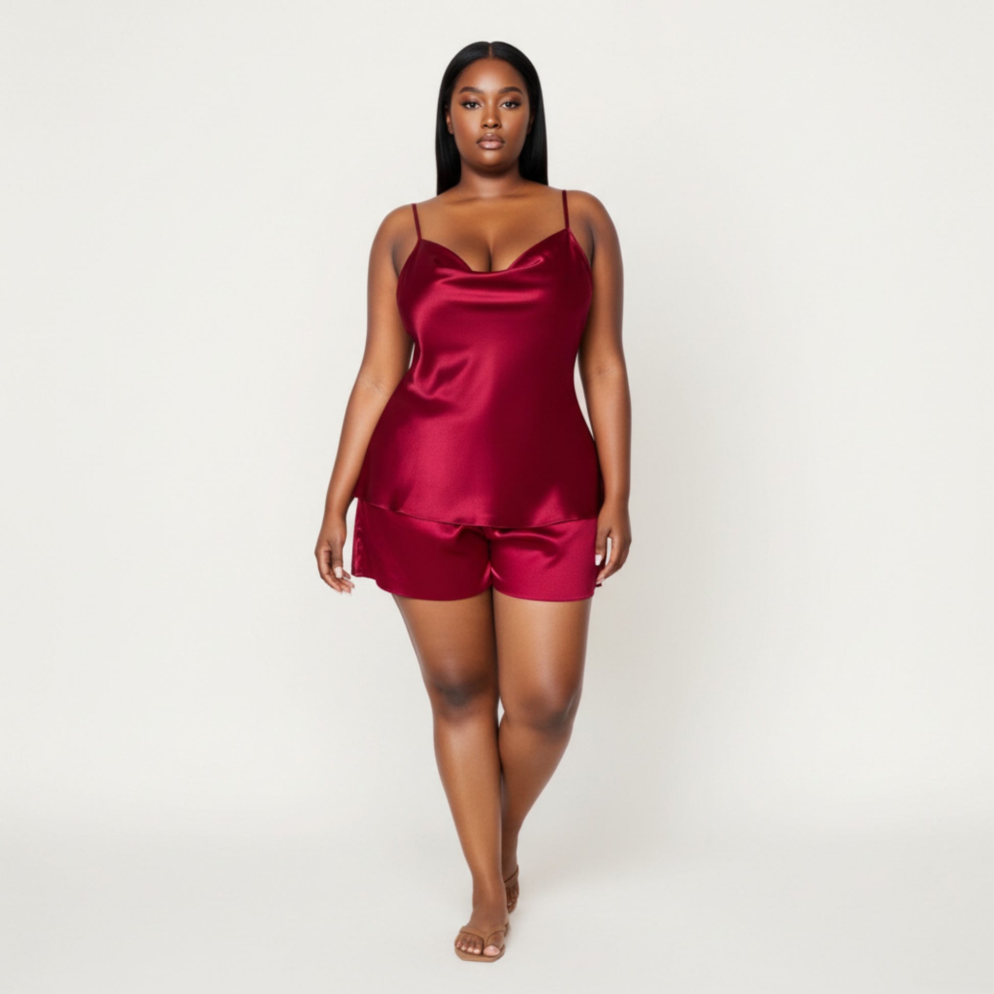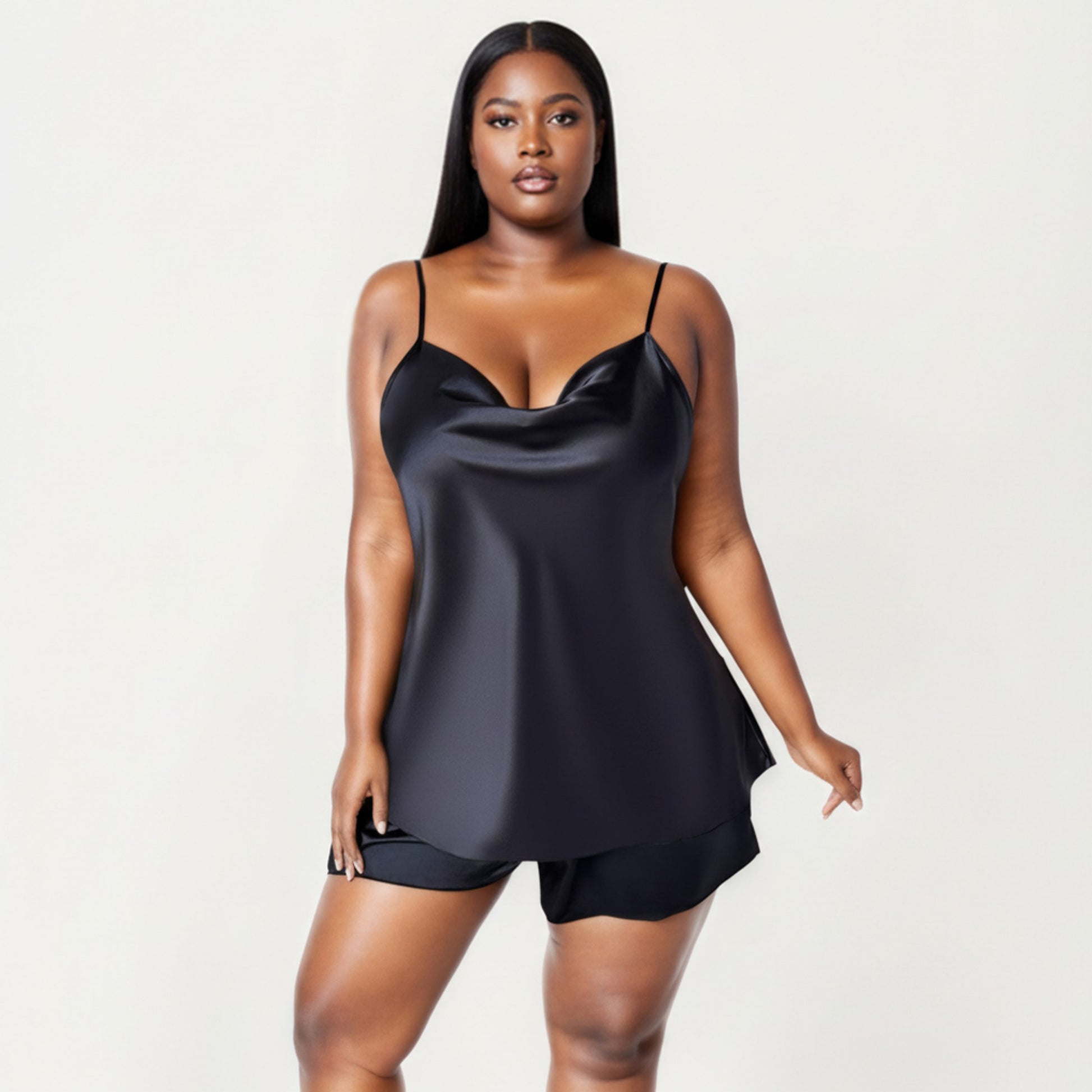 2-Piece Satin Cami and Shorts Set with Draped Neckline Silky Fabric and Lightweight Relaxed Fit