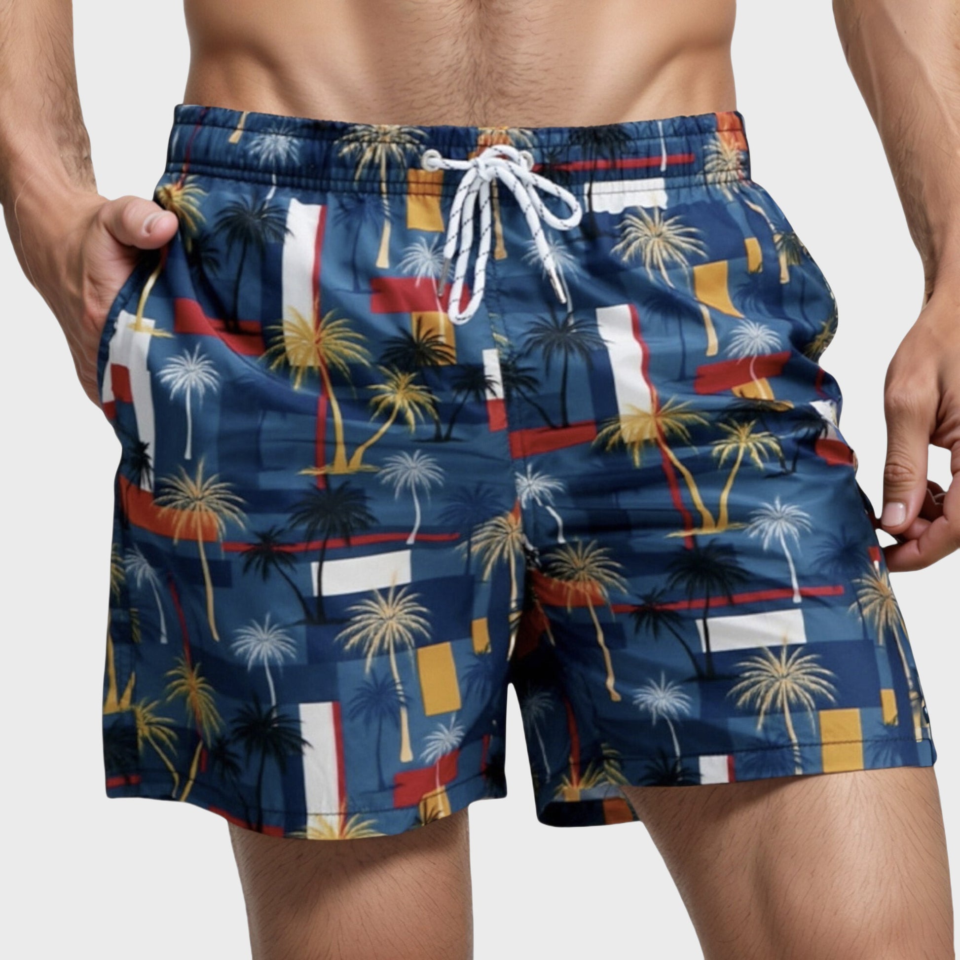 Men's Geometric Palm Tree Swim Trunks with Quick-Dry Fabric and Adjustable Drawstring Waist for Bold Summer Style