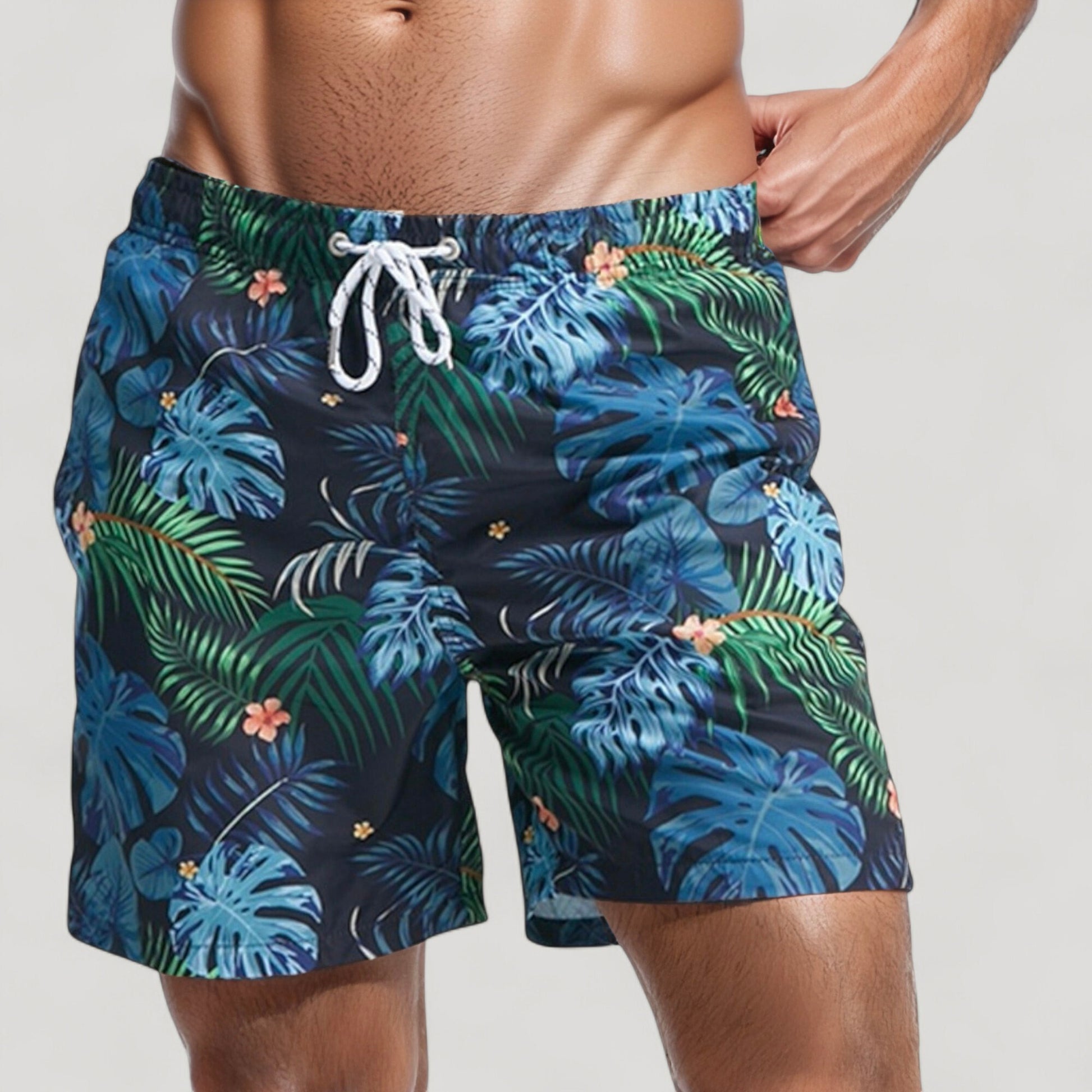 Men's Tropical Leaf Print Swim Trunks with Quick-Dry Fabric and Drawstring Waistband for Beach and Pool Comfort