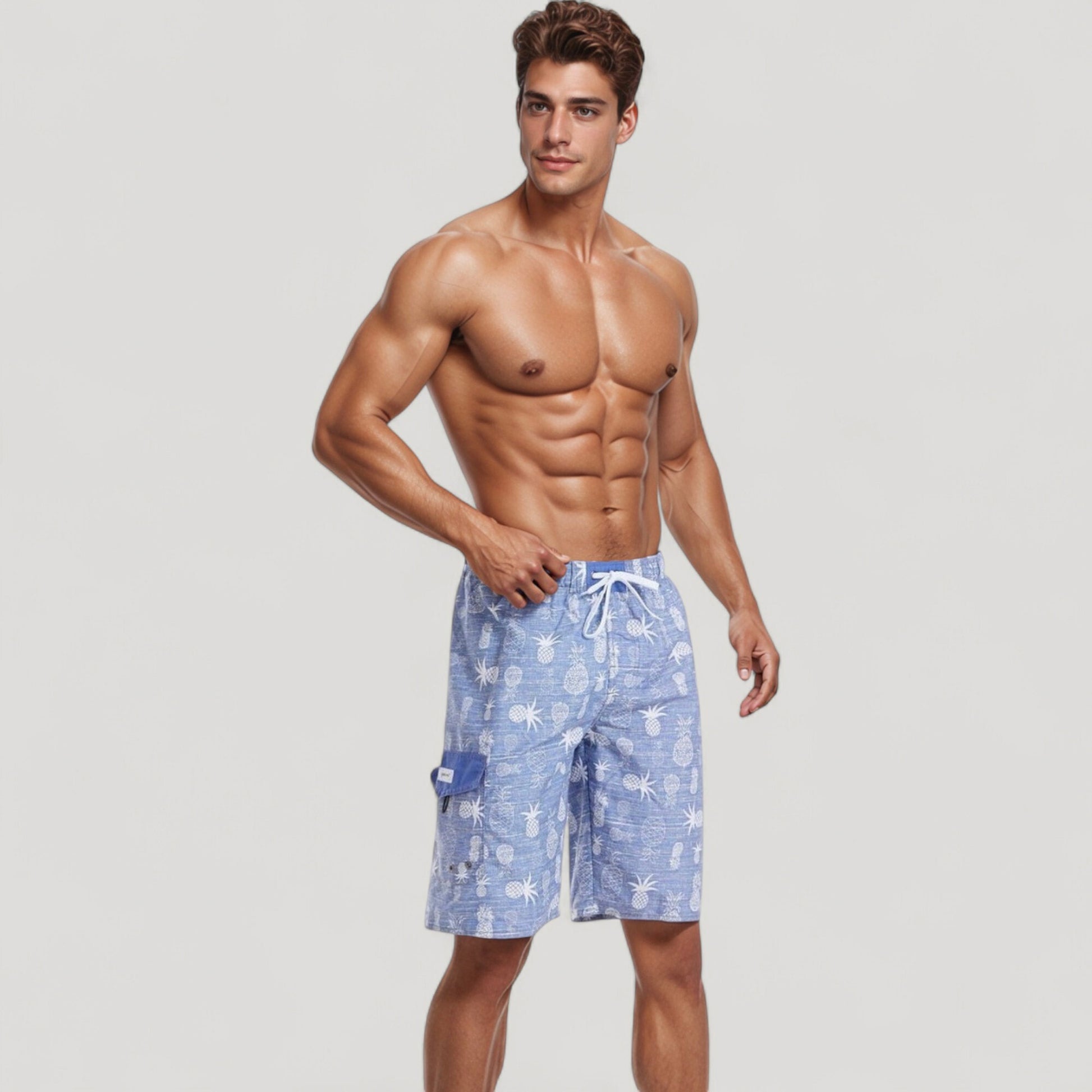 These men's swim trunks showcase a playful allover pineapple print, blending fun tropical style with everyday practicality. The elastic waistband with a drawstring ensures a secure, personalized fit, while the lightweight fabric dries quickly for all-day comfort. With a knee-length cut and breathable material, these trunks are perfect for beach lounging, pool days, or casual summer activities.
