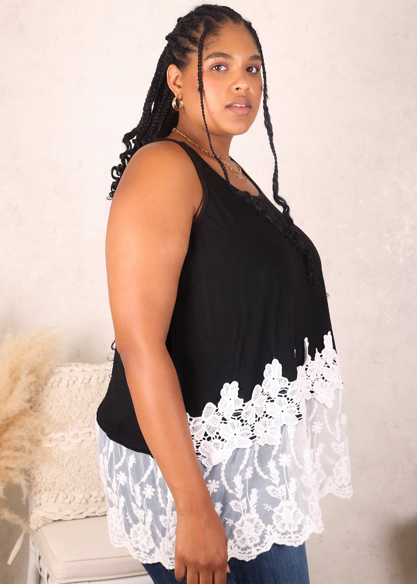 Plus Size Floral Lace Extender Tank Vest Crew Neck Loose Camisole Blouse Tops, Black