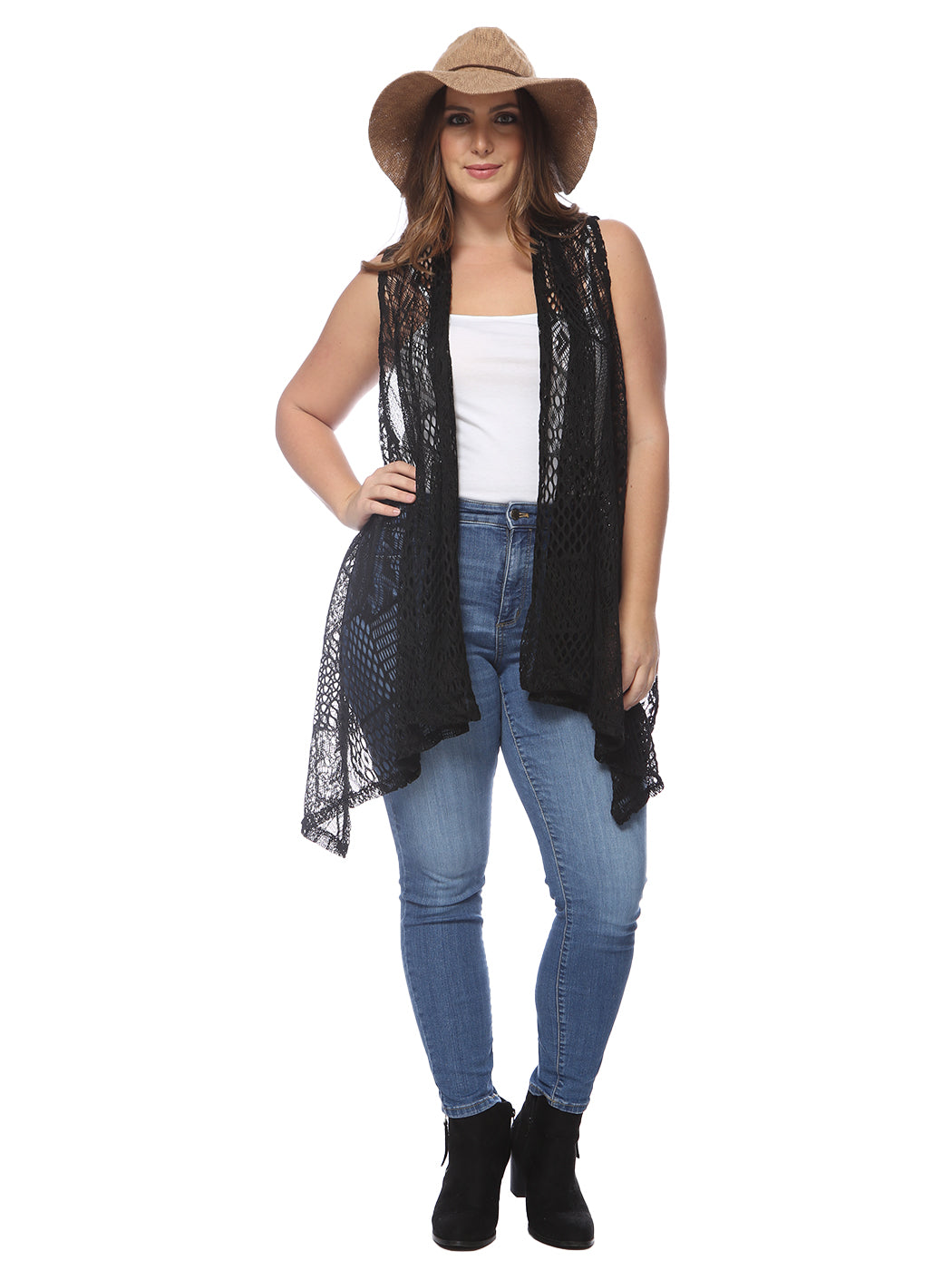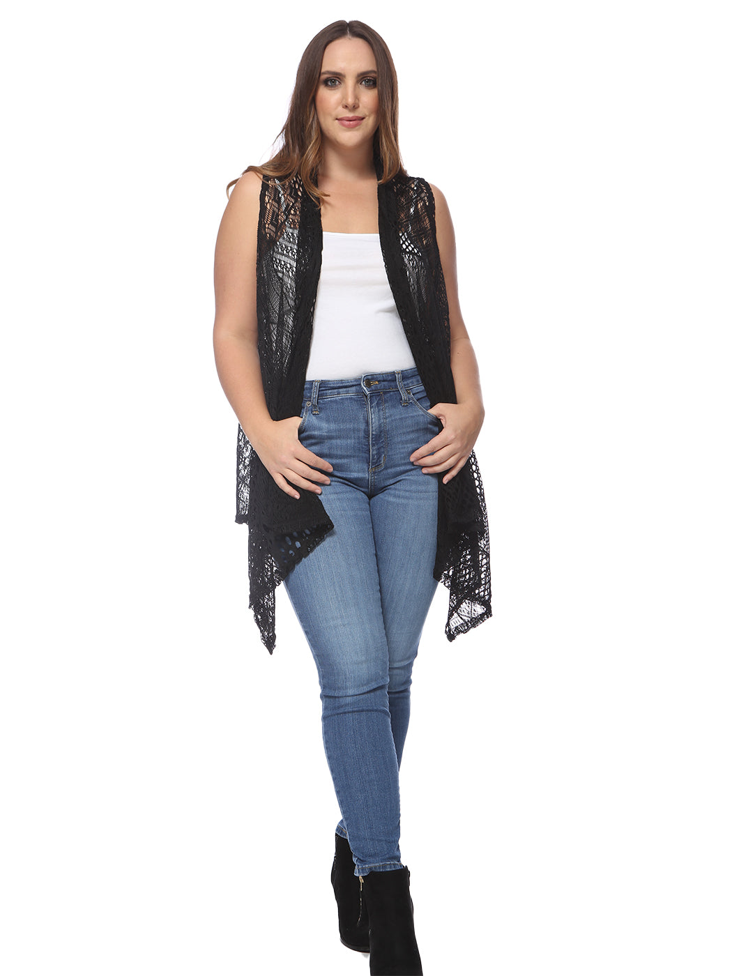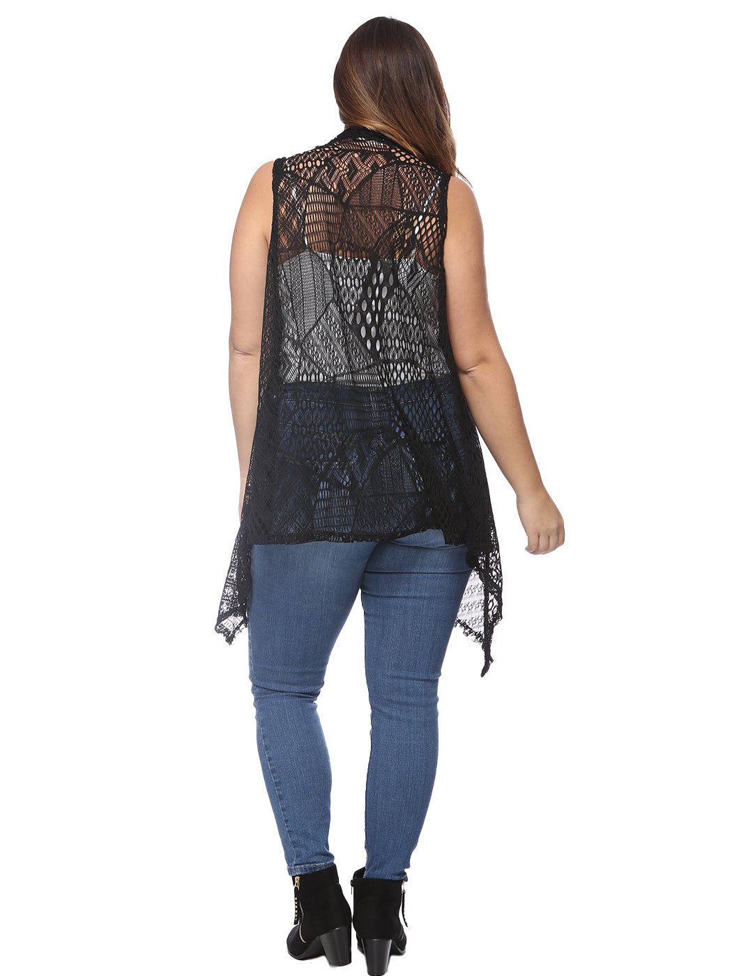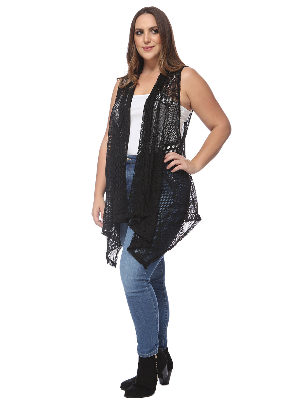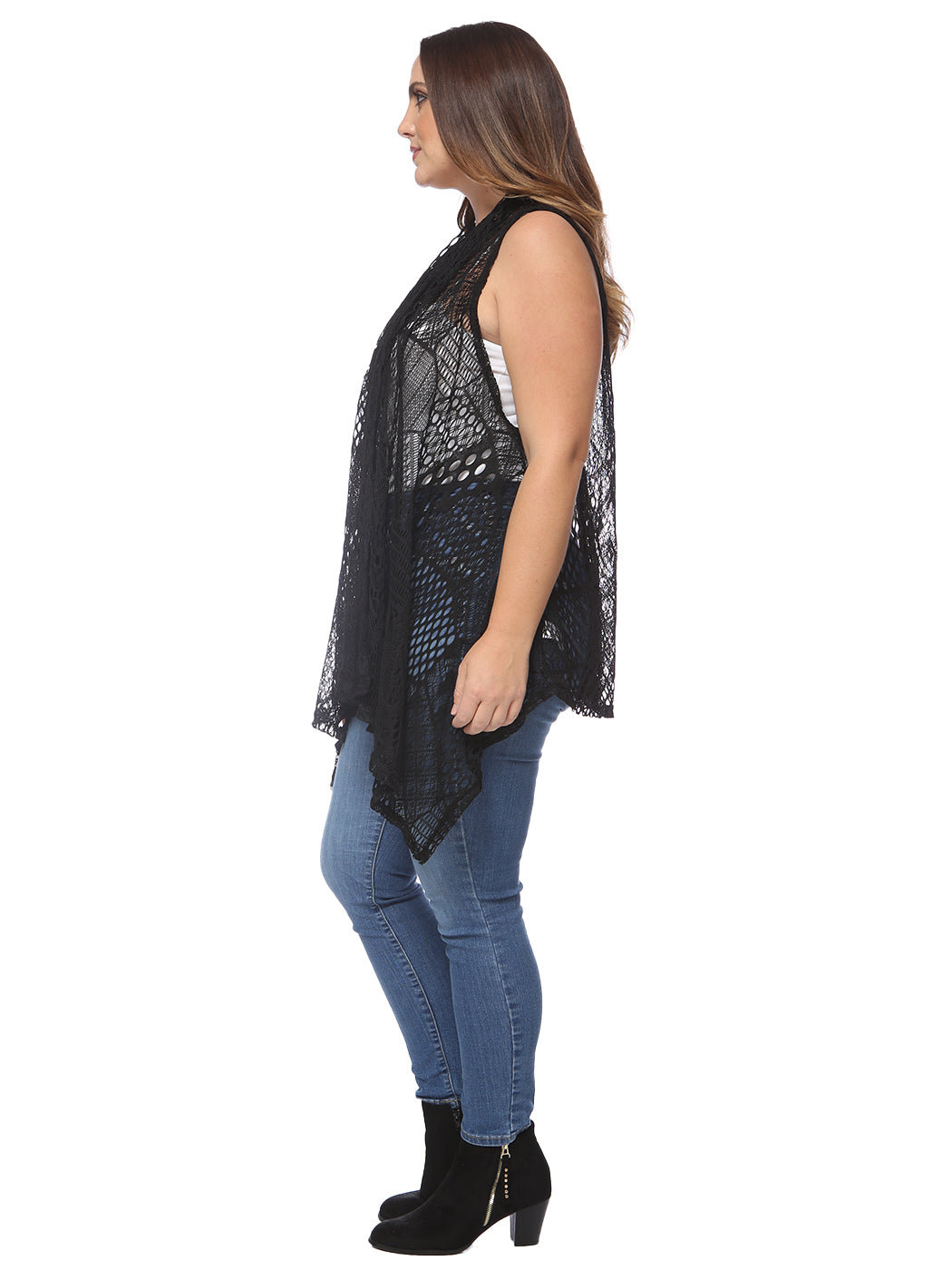 Plus Size Boho Open Front Crochet Cover Up Sleeveless Shawl Cardigan Vest, Black