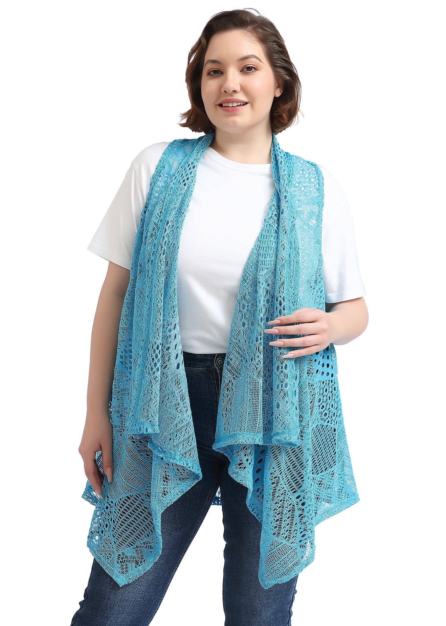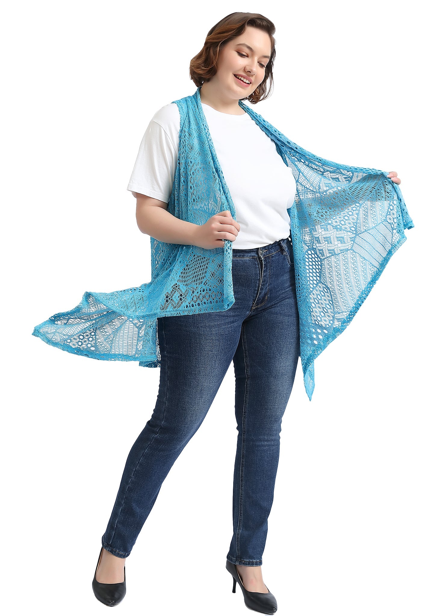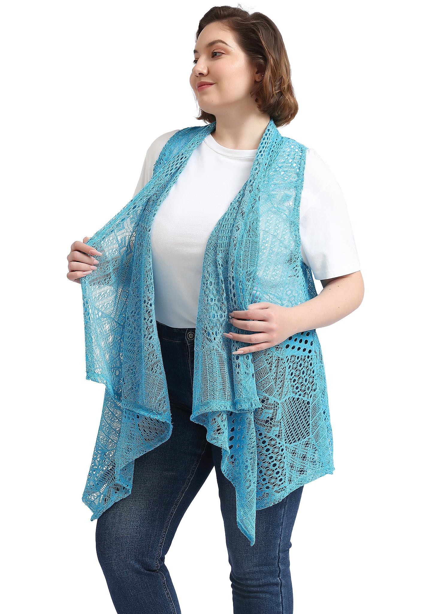 Plus Size Boho Open Front Crochet Cover Up Sleeveless Shawl Cardigan Vest, Blue