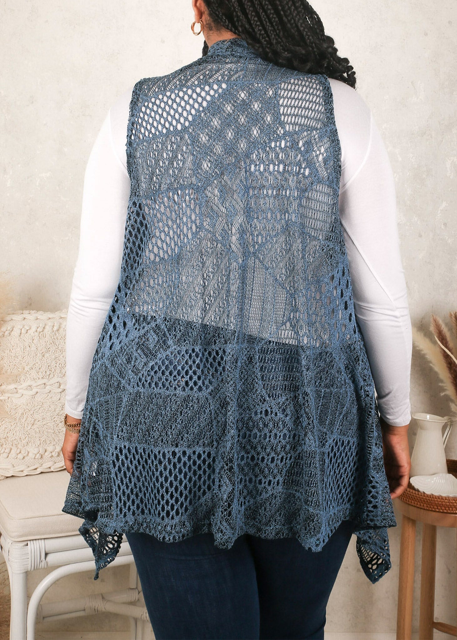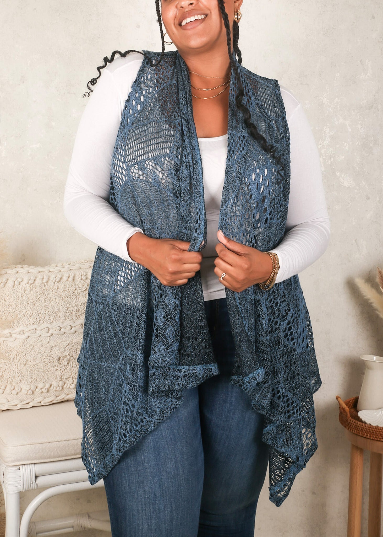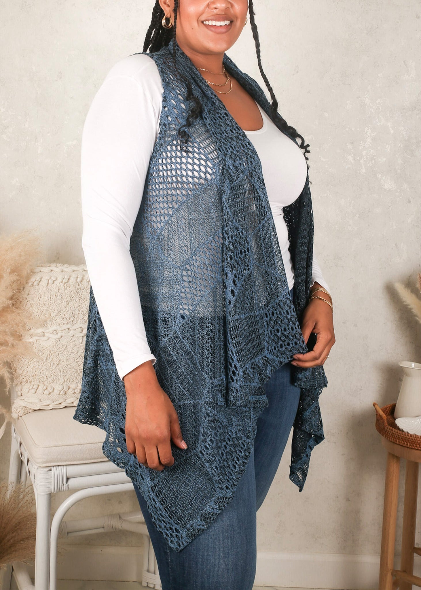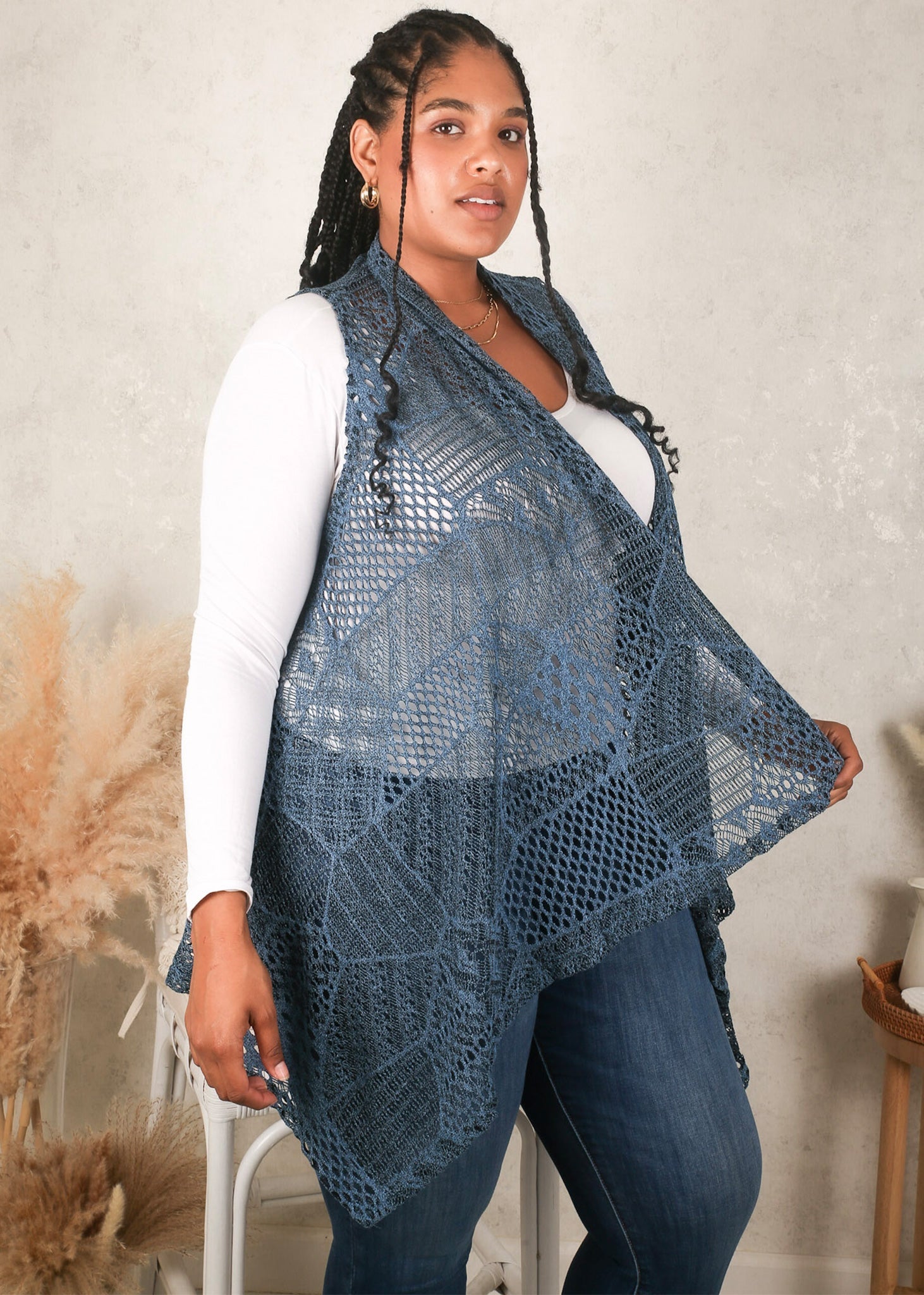 Plus Size Boho Open Front Crochet Cover Up Sleeveless Shawl Cardigan Vest, Navy