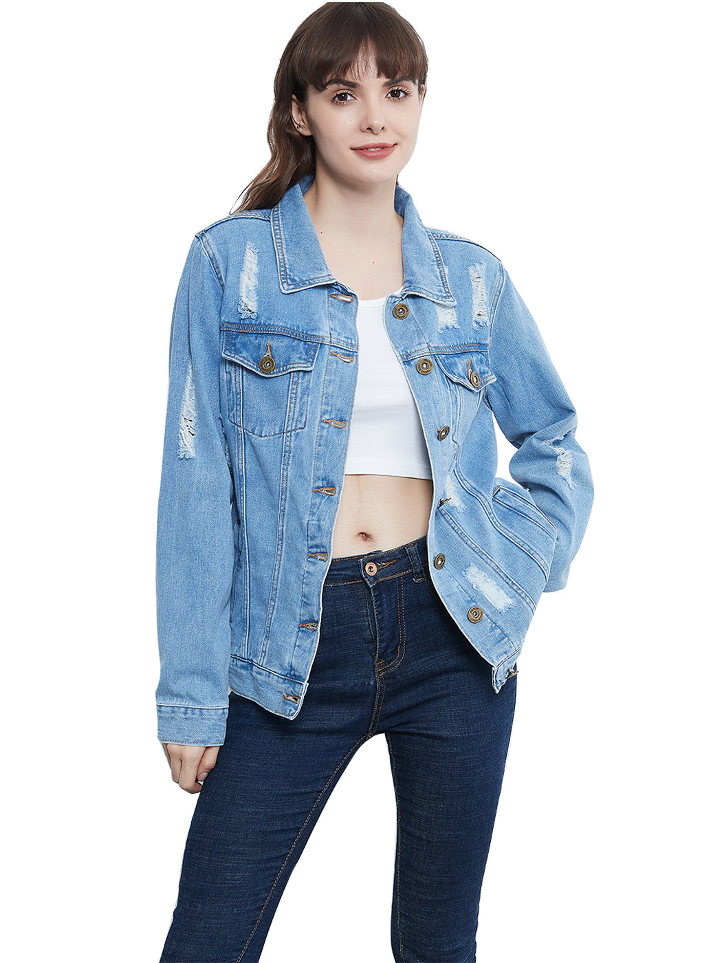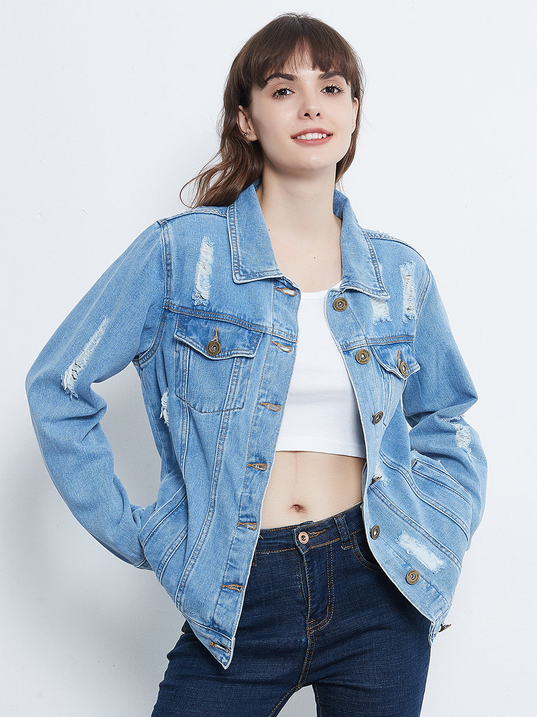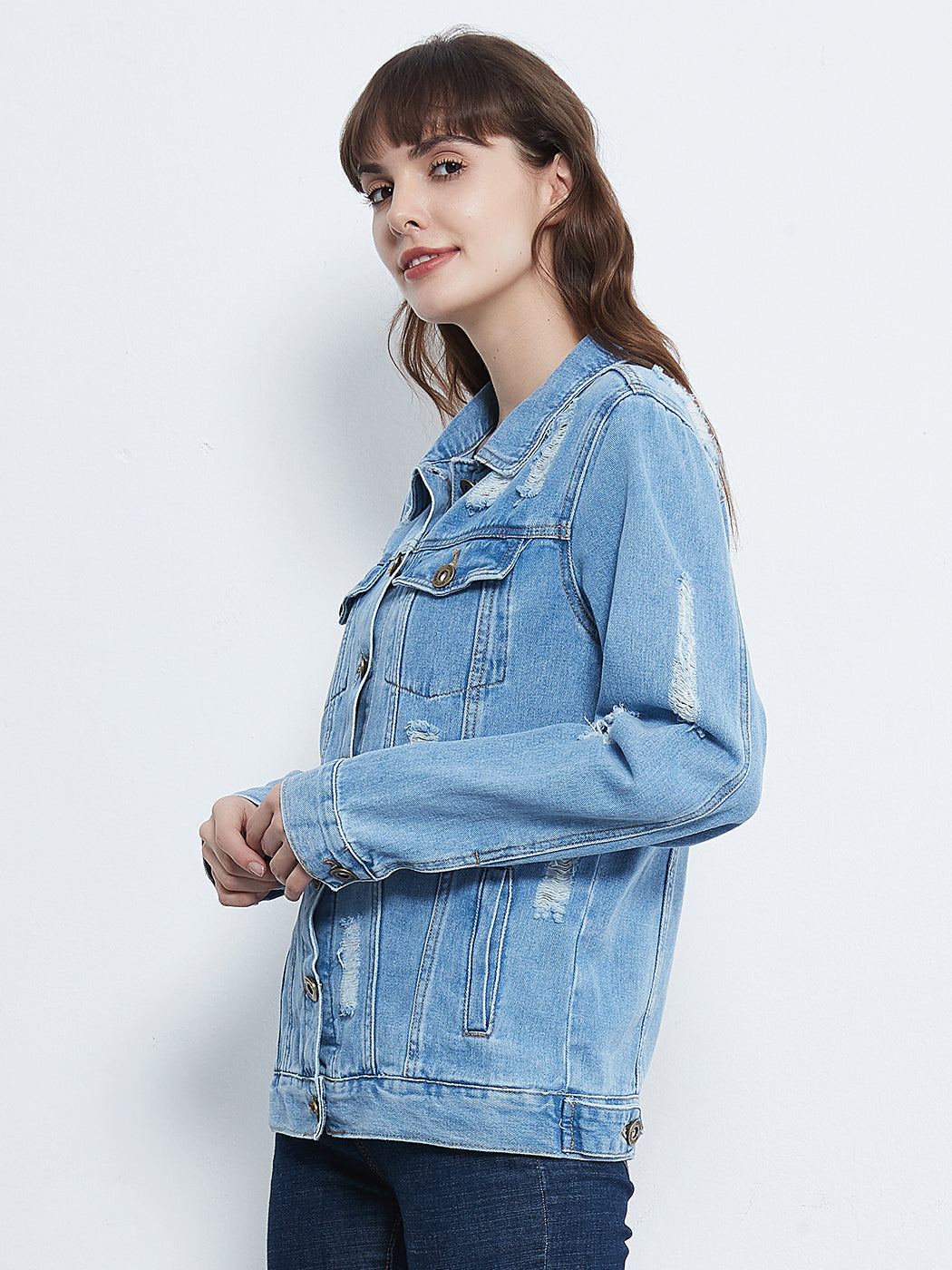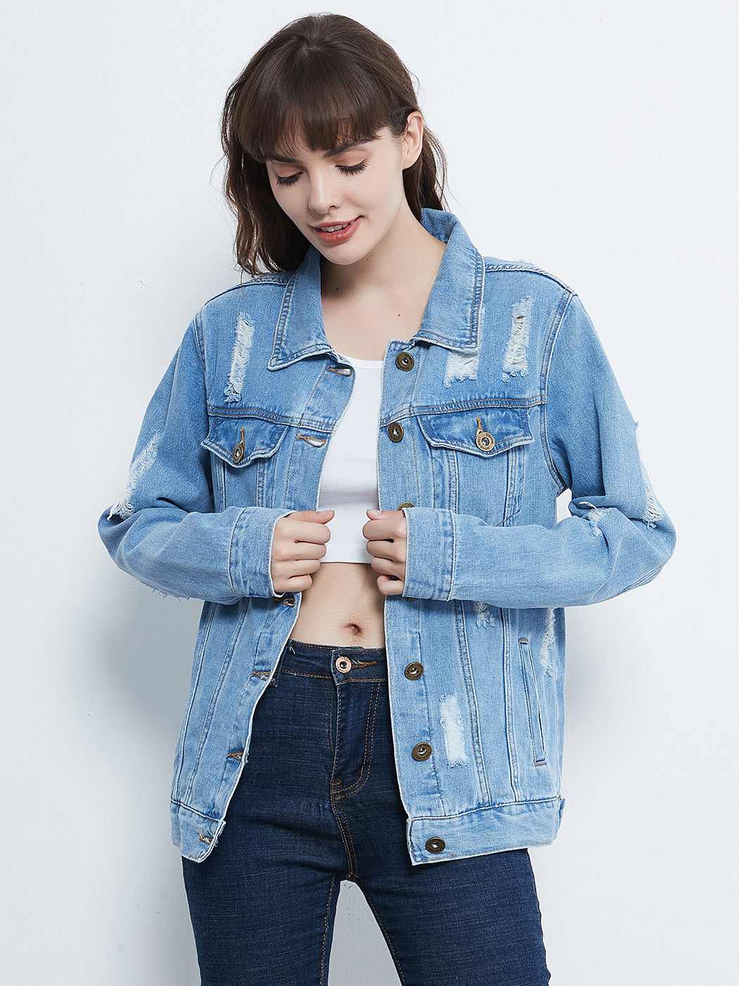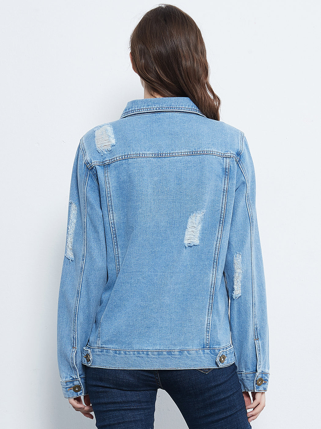 Classic loose fit ripped jeans coats are always staples in every closet! This light wash medium blue faded jean jackets are ideal for all seasons.