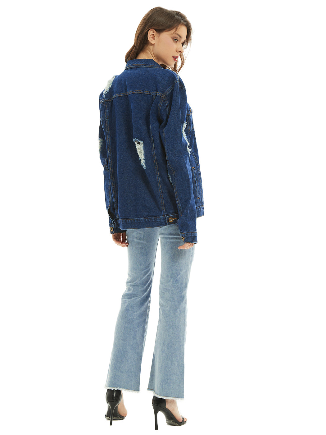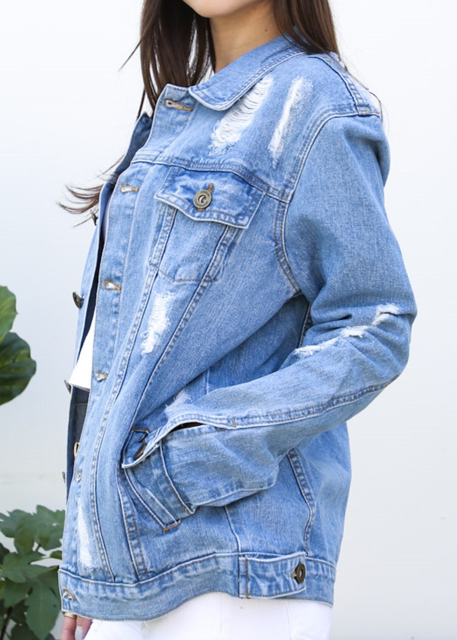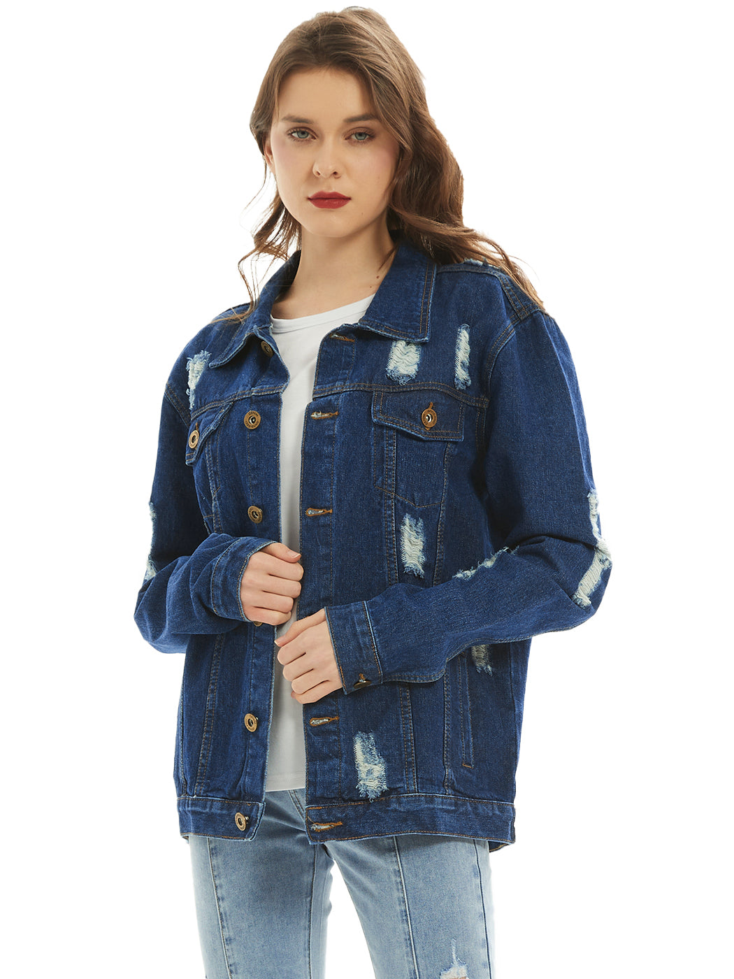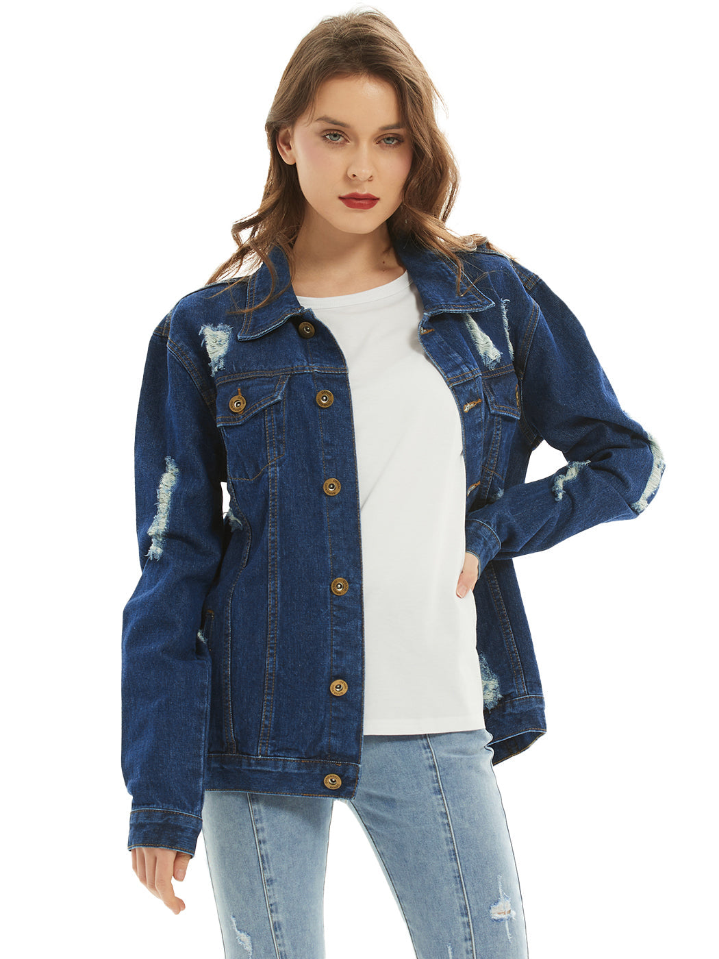 Classic loose fit ripped jeans coats are always staples in every closet! This light wash medium blue faded jean jackets are ideal for all seasons.