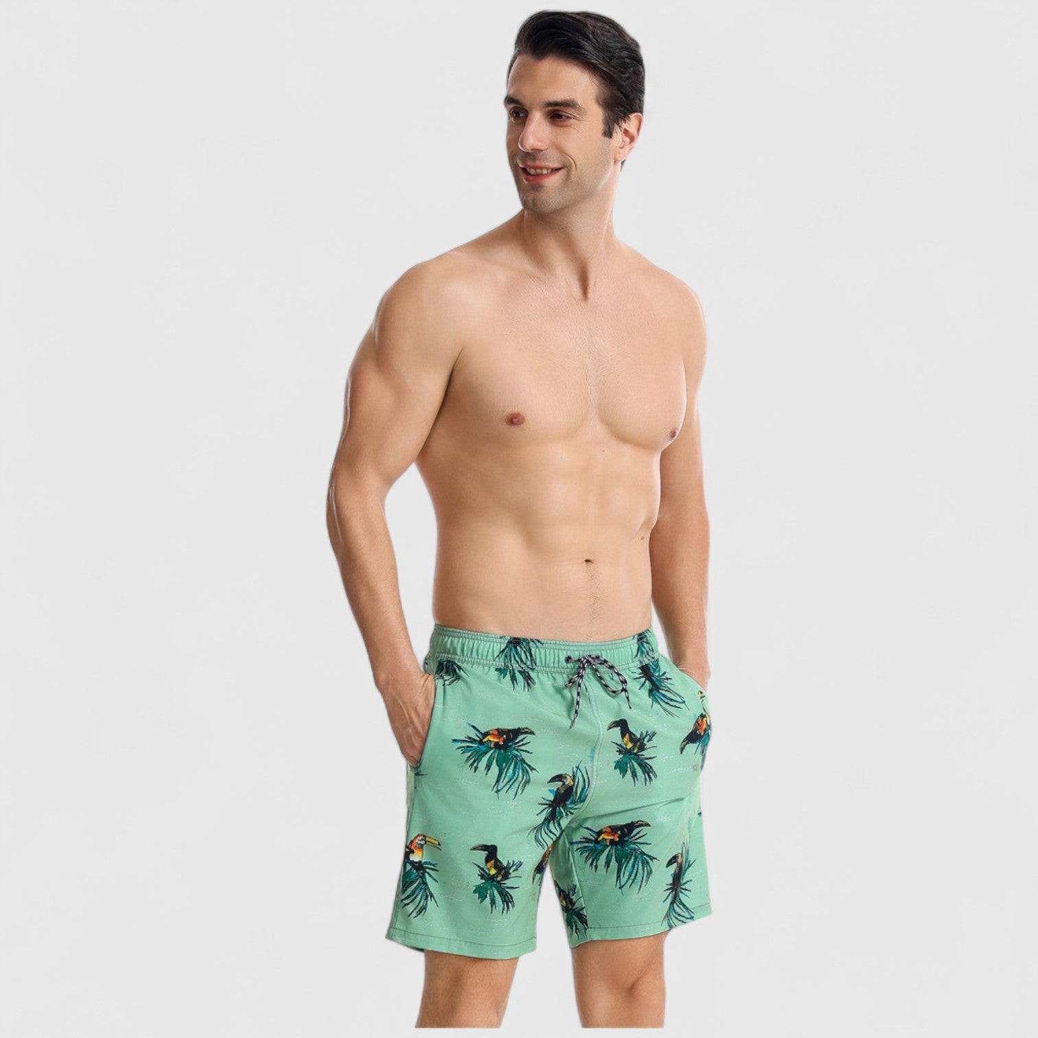 Men's Toucan Print Swim Shorts with Tropical Leaf Pattern and Adjustable Drawstring Waist