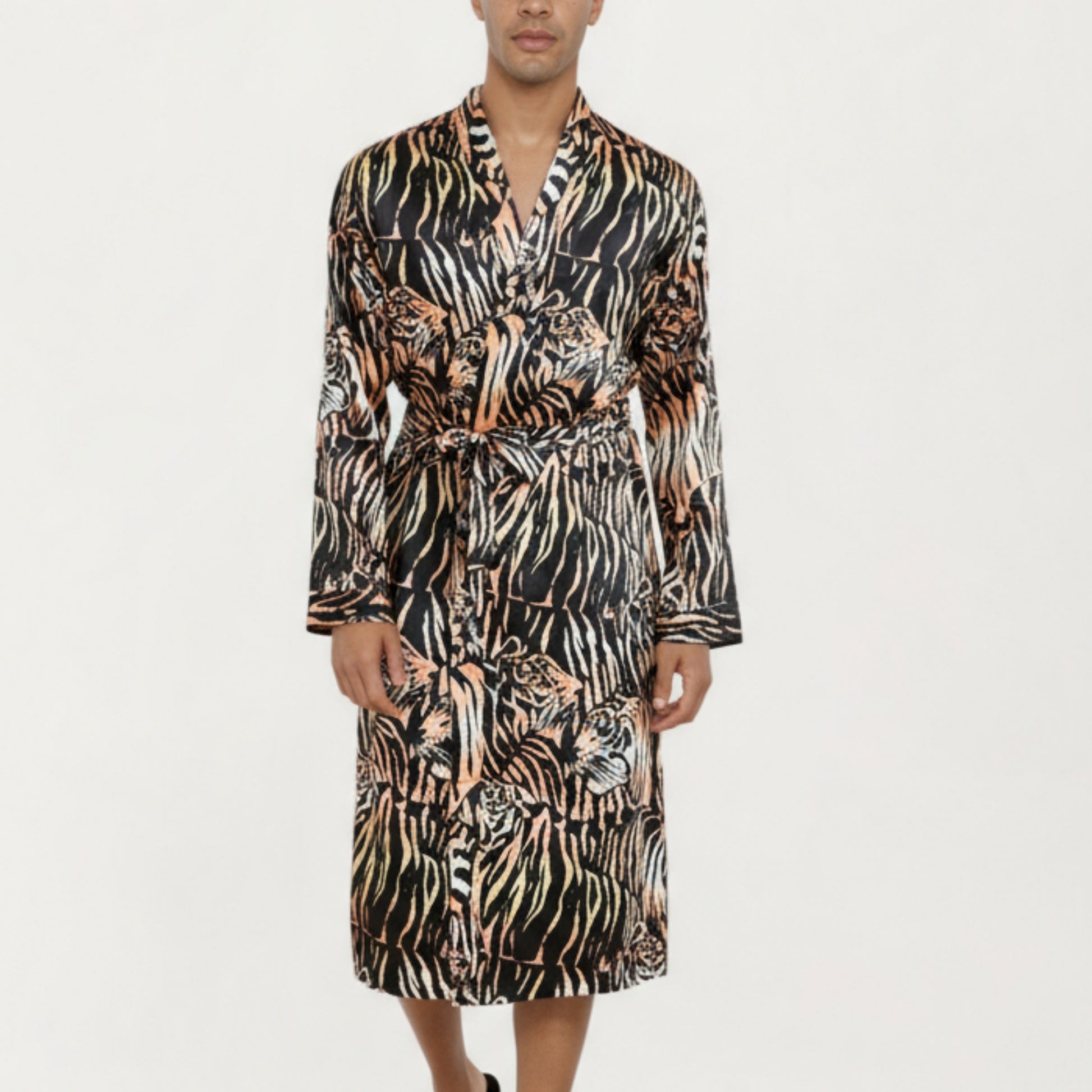 Men's Satin Robe with Tiger Print Design and Adjustable Waist Tie