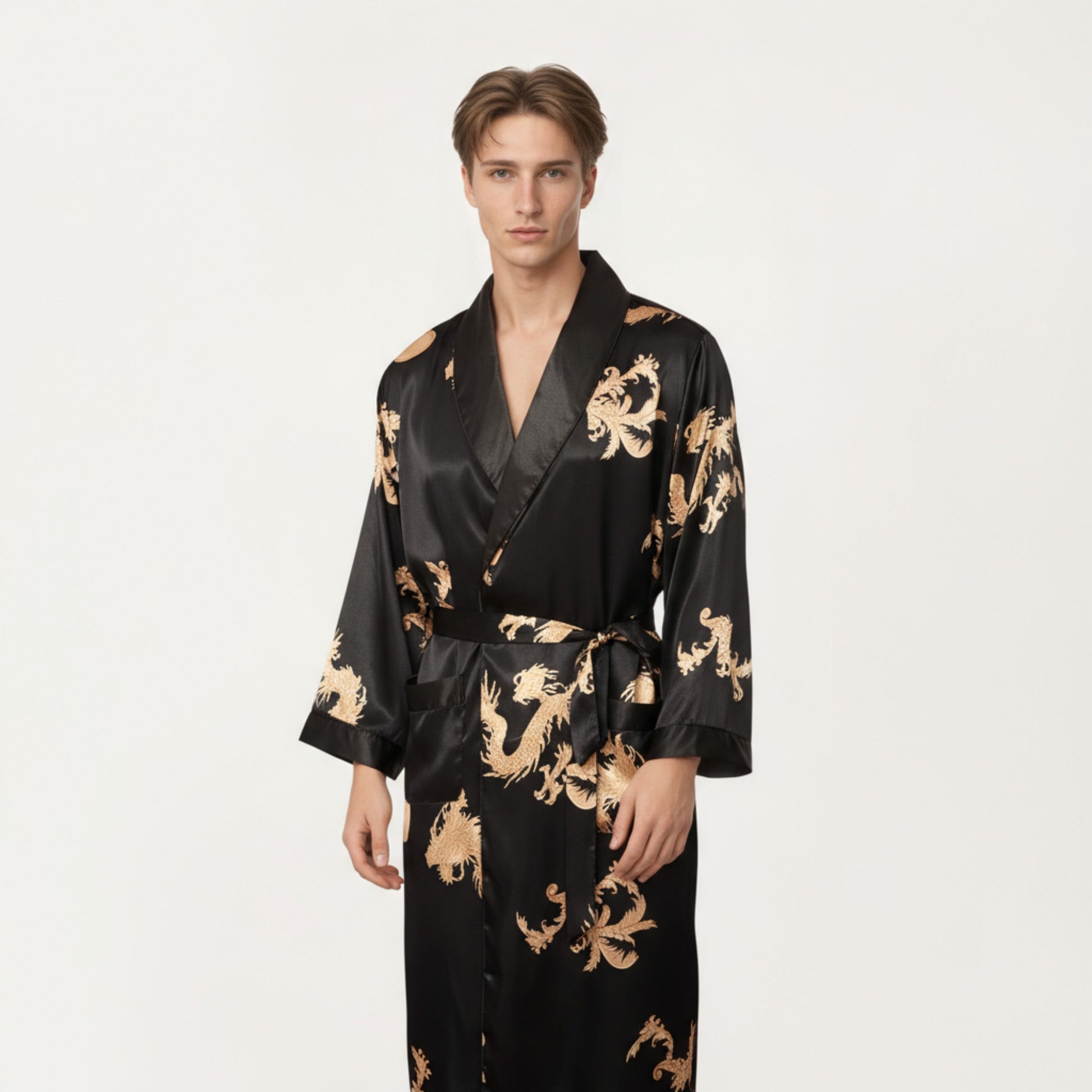 The Anna-Kaci Men's 2-Piece Set Satin Dragon Print Robe and Lounge Pants combine bold design with luxurious comfort. Made from smooth satin fabric, this set features a striking golden dragon print that stands out against its sleek background. The robe includes a classic shawl collar, adjustable self-tie belt, and front pockets for convenience, while the matching pants offer a relaxed fit. This set delivers a stylish fusion of elegance, confidence, and comfort.