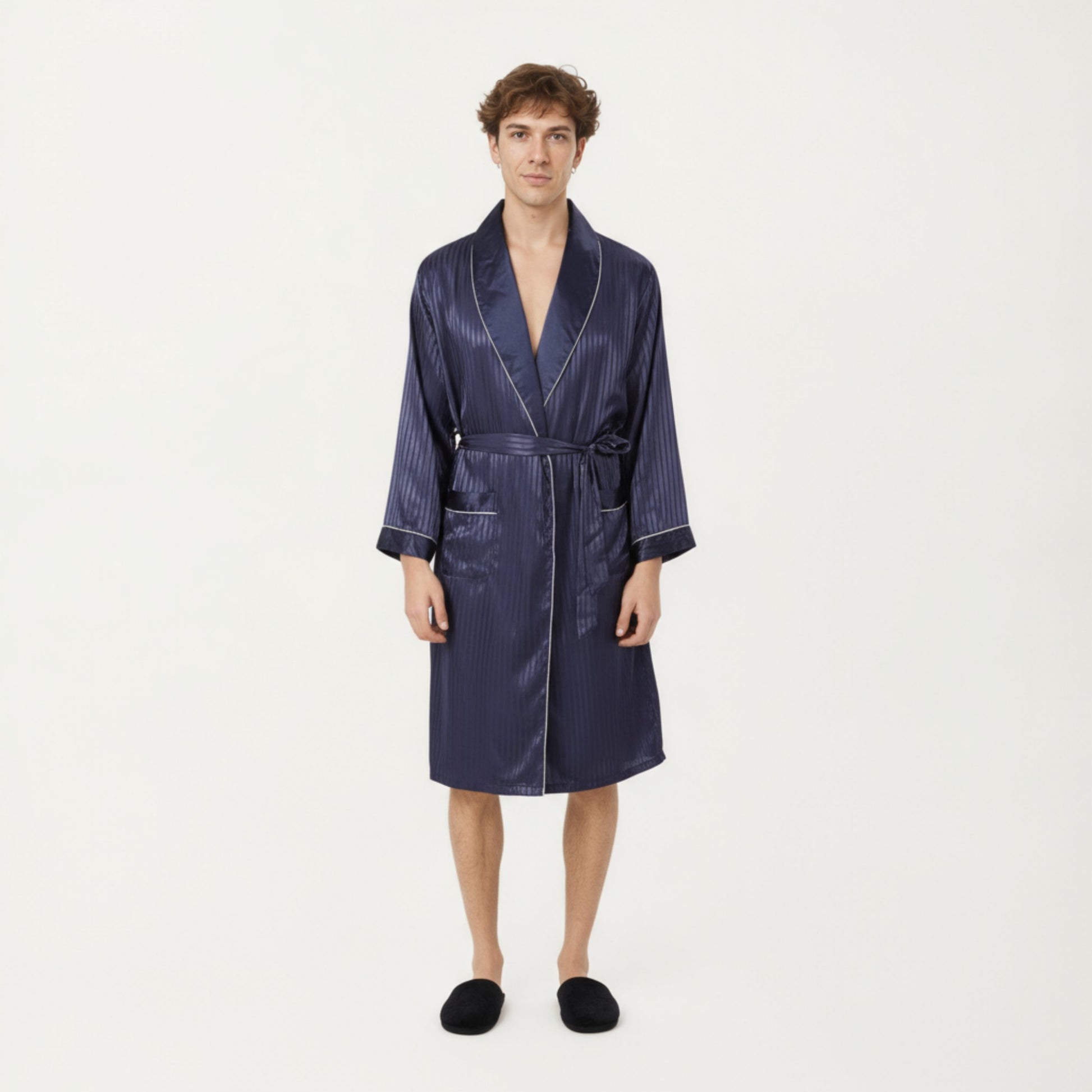 Men's Satin Robe with Subtle Stripe Texture Contrast Trim and Waist Tie