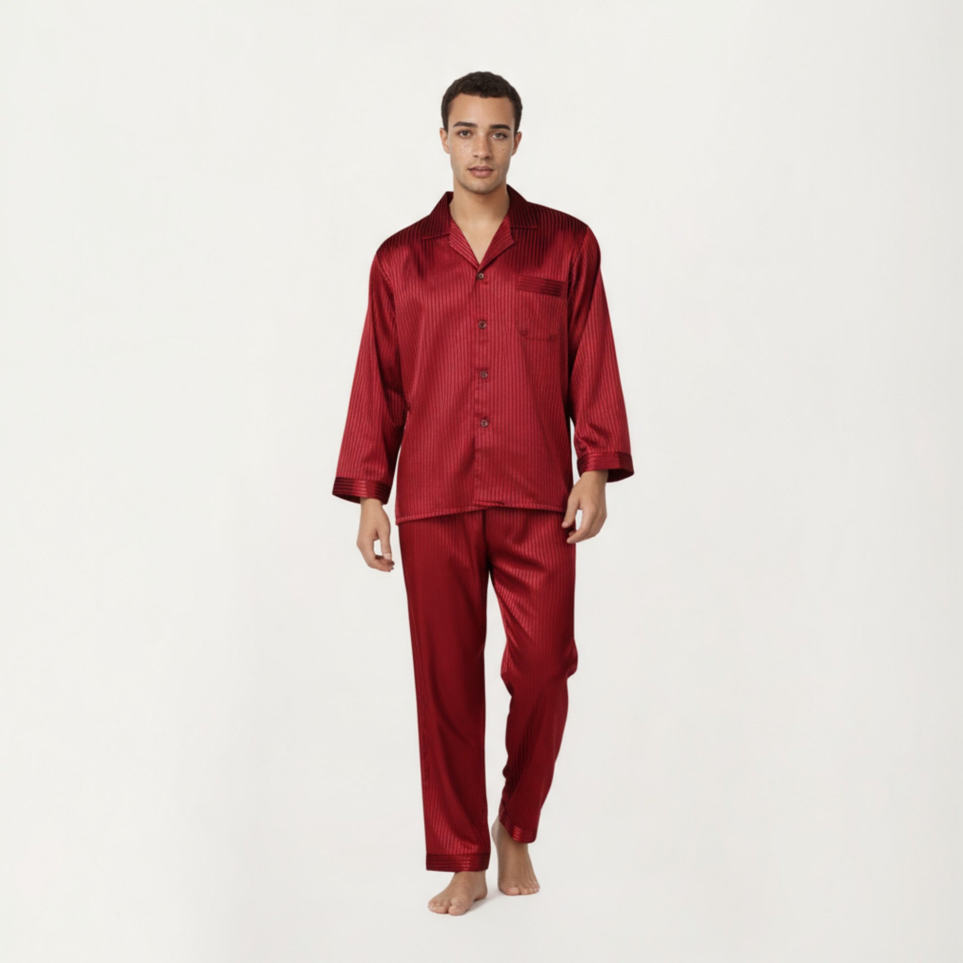 Men's 2-Piece Set Satin Pajamas with Subtle Stripe Pattern and Button-Up Top