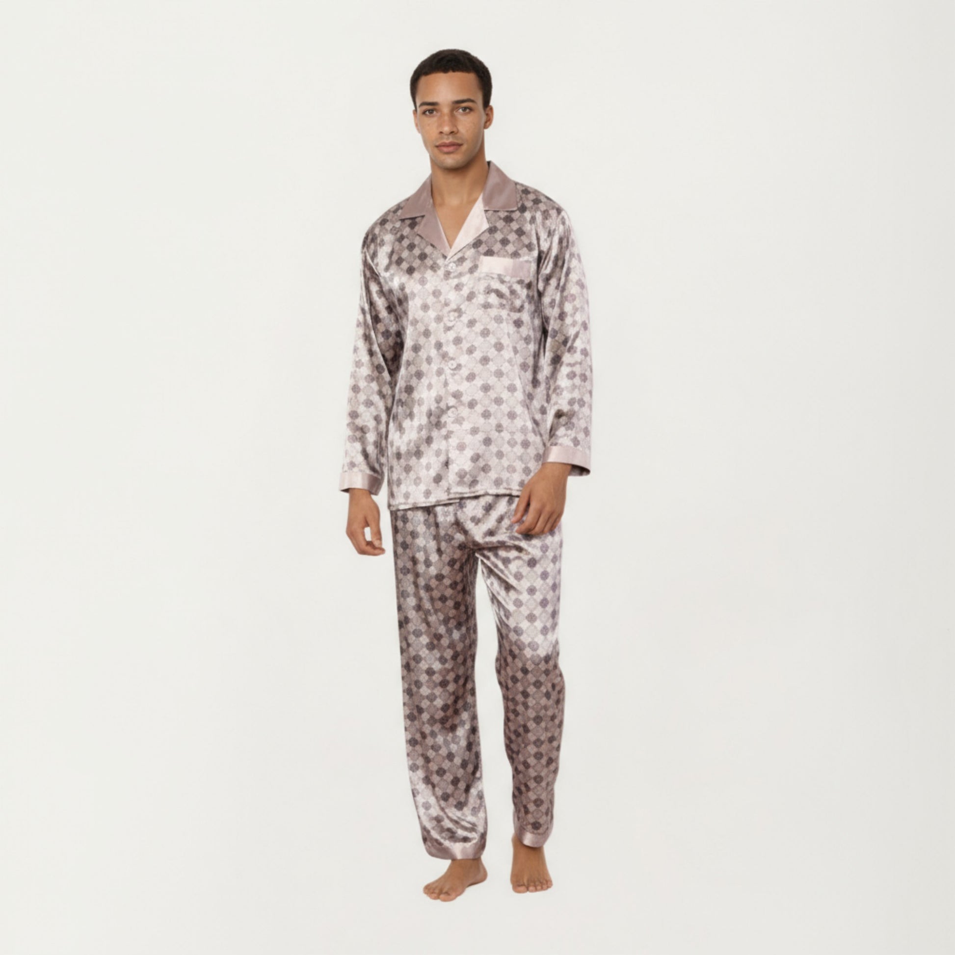 The Anna-Kaci Men's 2-Piece Set Satin Pajamas feature a modern take on timeless sleepwear design. Made from smooth satin fabric, this set includes a long-sleeve button-up shirt and straight-leg pants, both adorned with a stylish geometric check print. The contrasting collar, pocket trim, and cuffs add a polished touch, while the lightweight material ensures comfort and breathability. Sleek, soft, and effortlessly refined, this set elevates your loungewear collection.