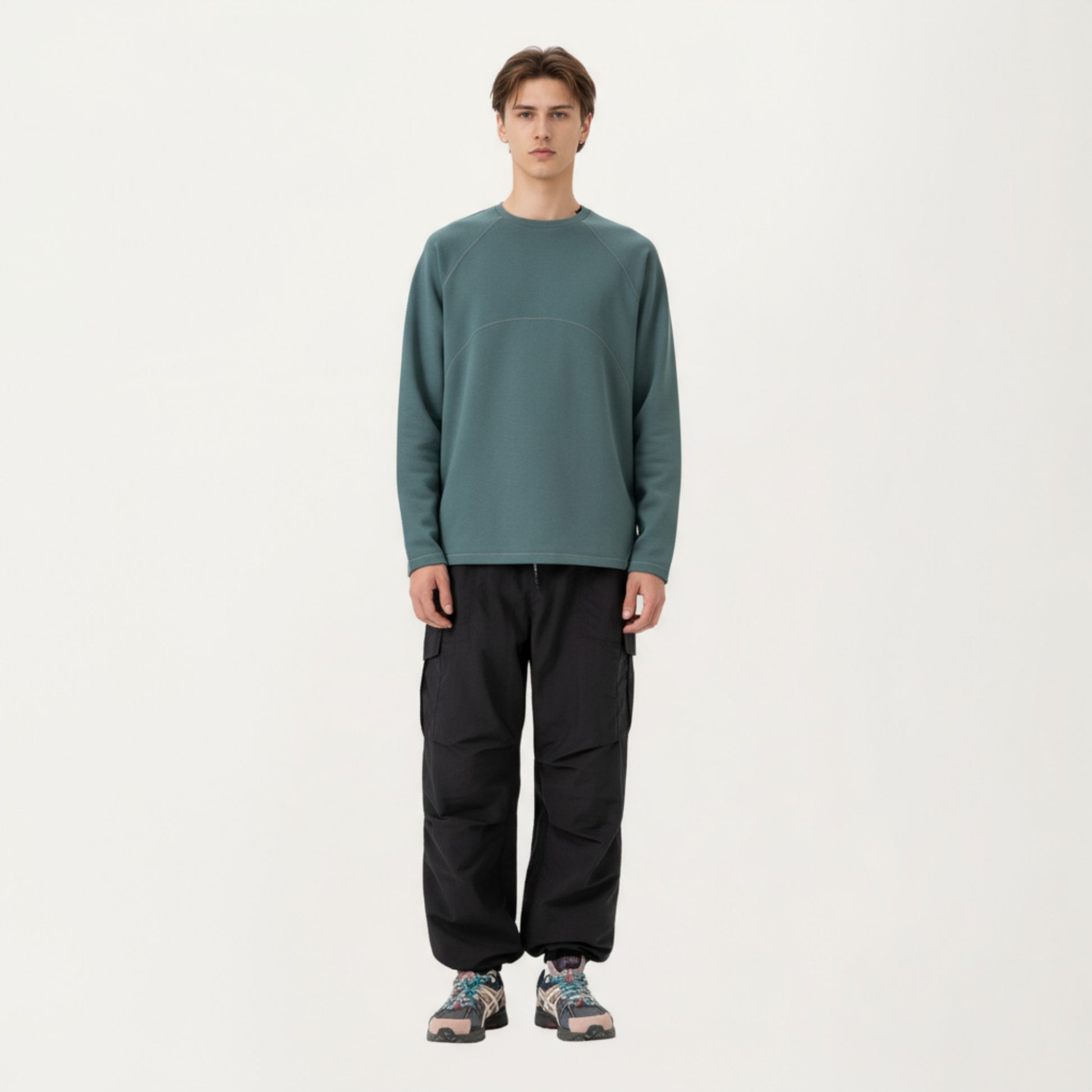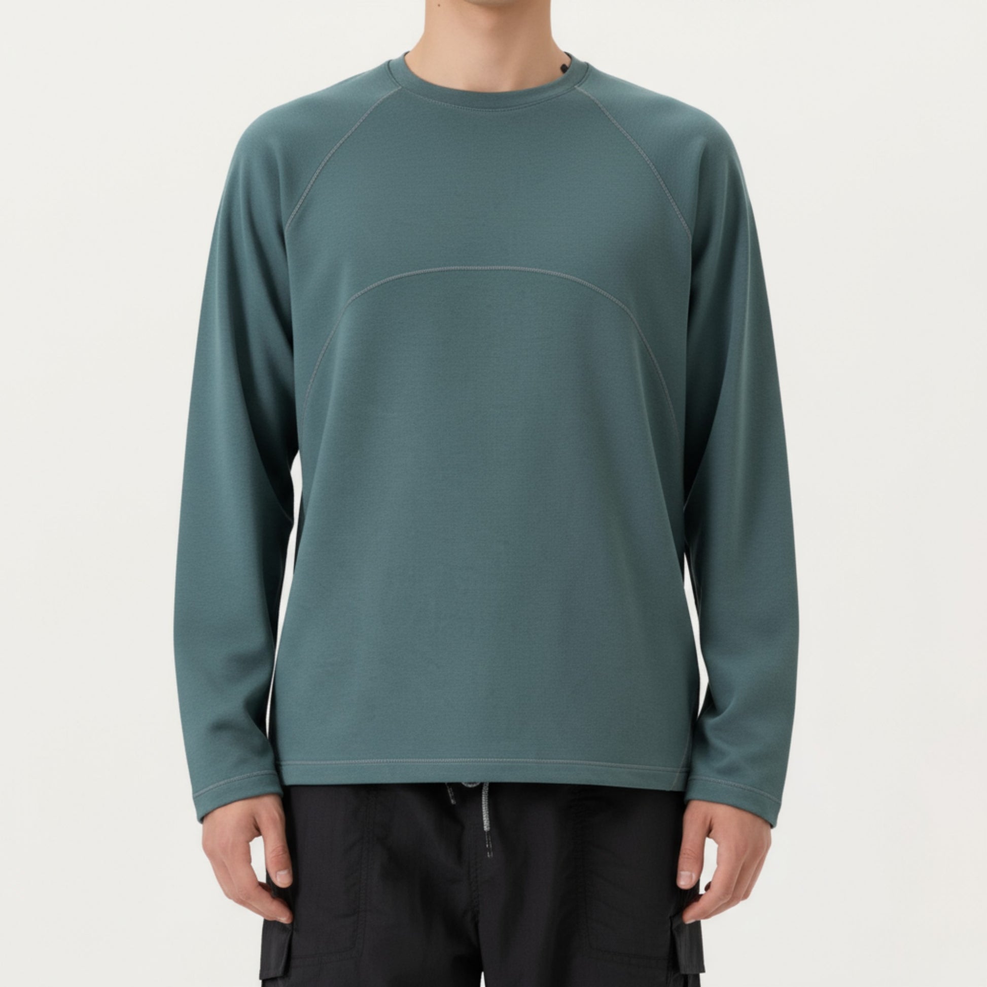 Men's Long Sleeve Crew Neck Pullover with Raglan Seams and Subtle Front Stitch Detail