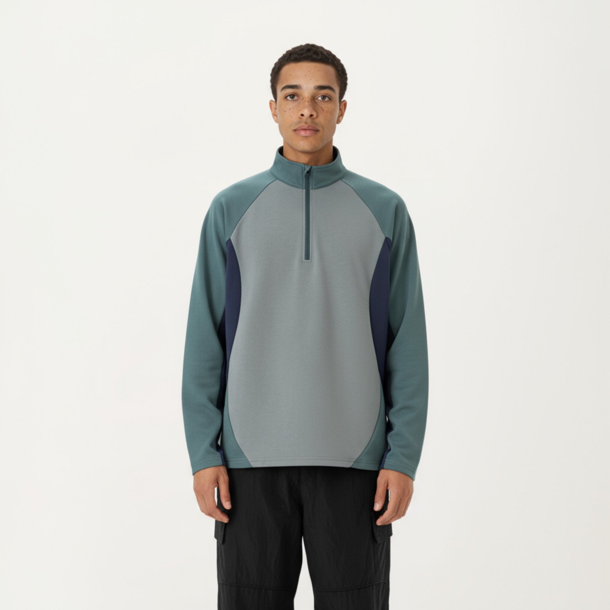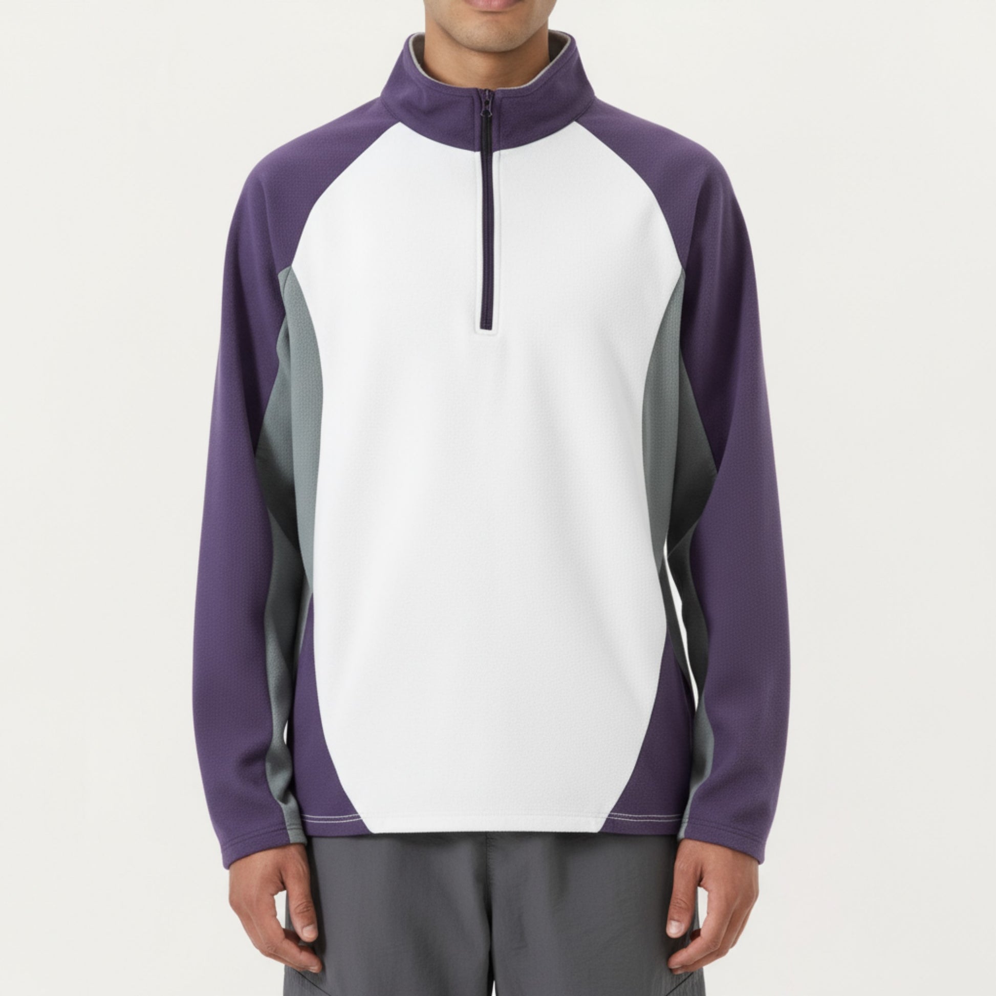 Men's Long Sleeve Quarter Zip Pullover with Color Block Panels and Stand Collar
