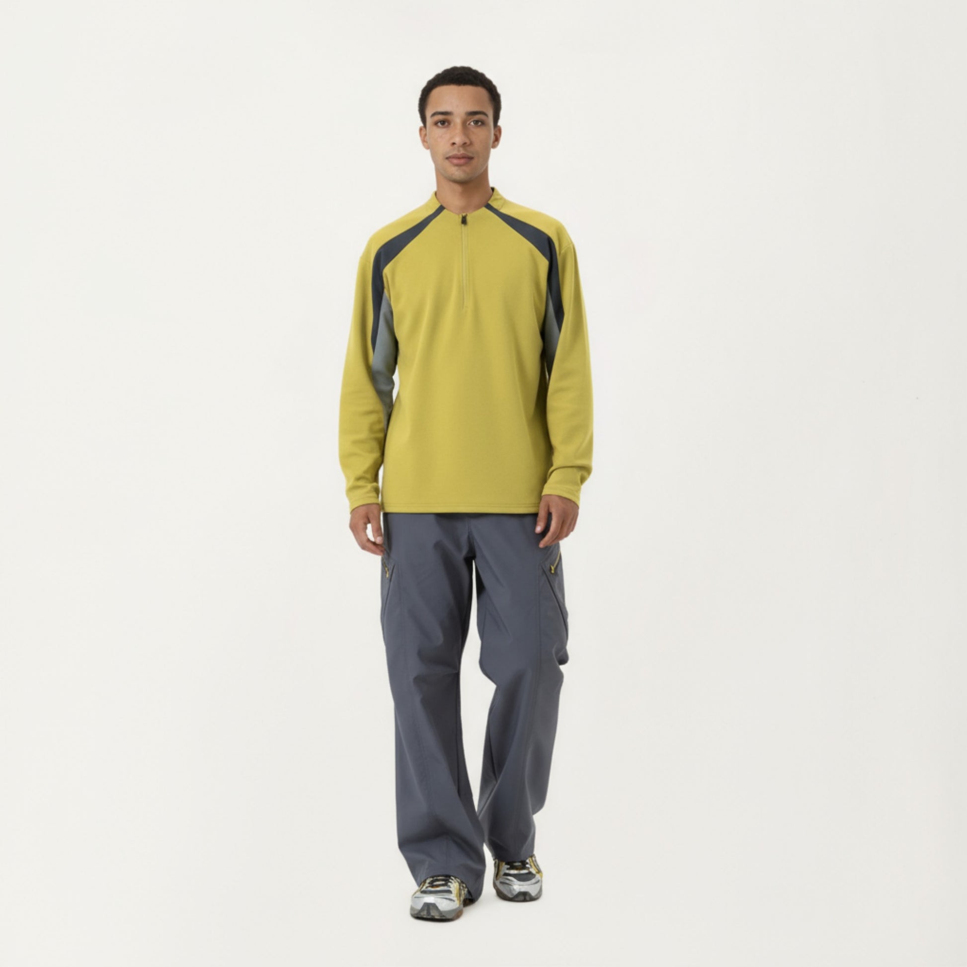 Men's Long Sleeve Quarter Zip Pullover with Contrast Shoulder Panels and Stand Collar