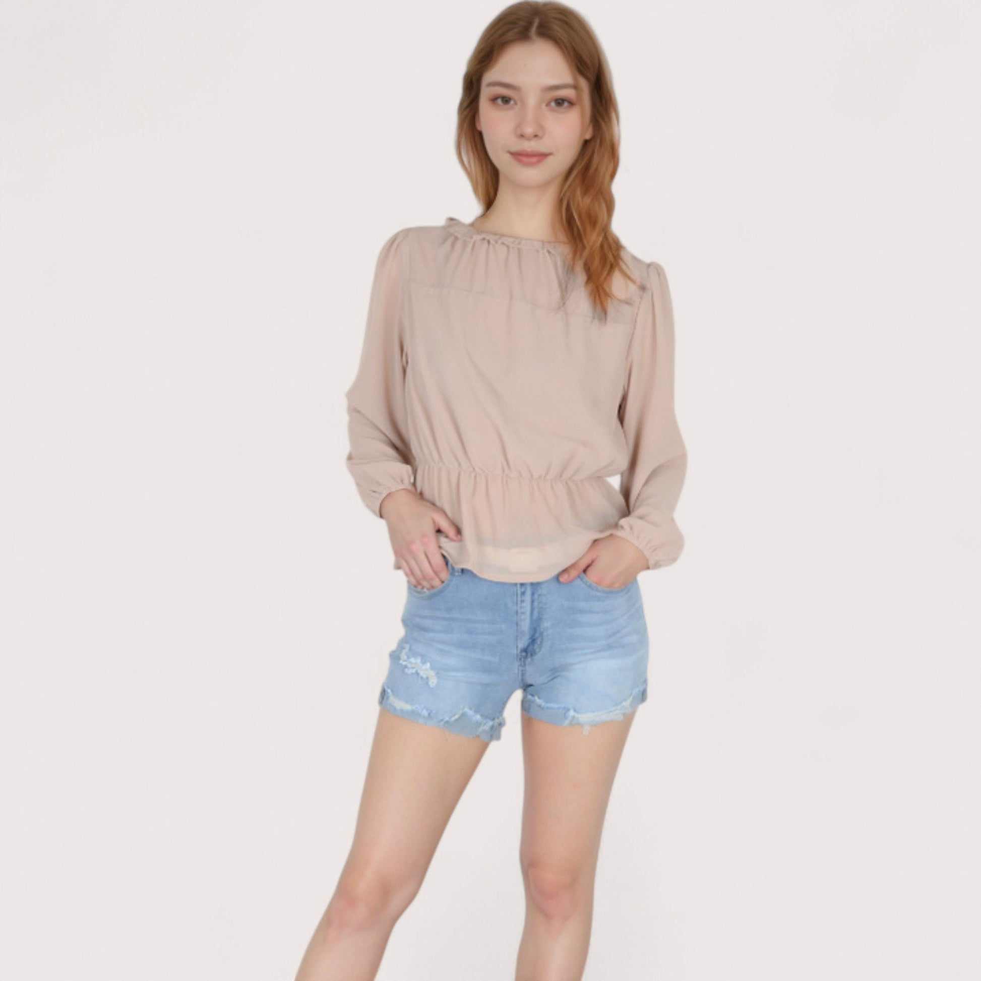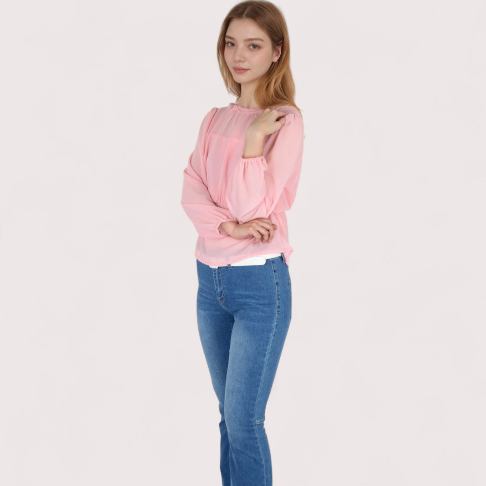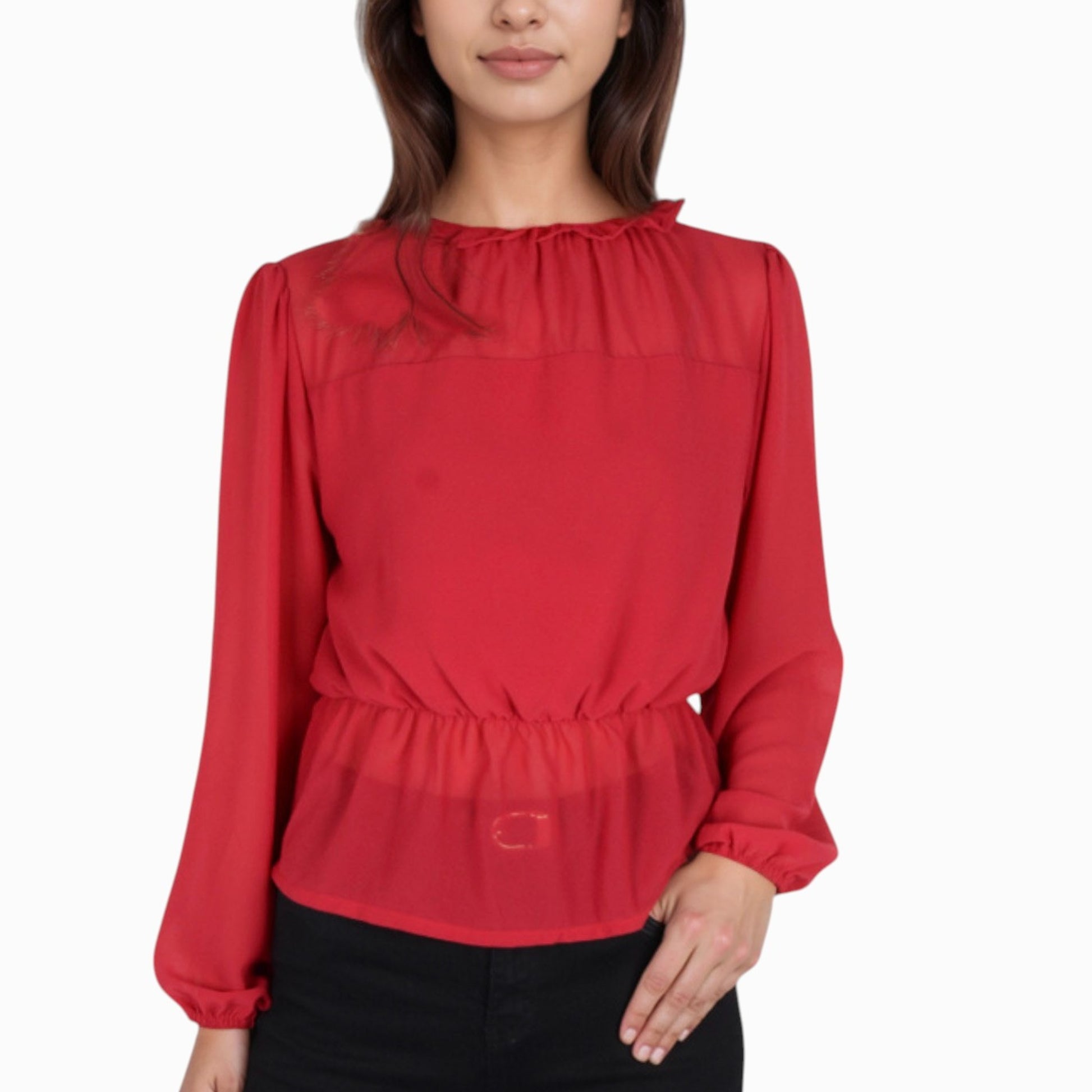 The Anna-Kaci Women's Sheer Yoke Long Sleeve Blouse features delicate design touches that elevate any outfit. The soft ruffle neckline and sheer yoke panel create a light, romantic look, while the cinched waist adds shape and polish. Made from a breezy, semi-sheer fabric, this blouse offers a flattering drape with a refined silhouette. Pair with denim for a balanced casual look or tuck into trousers for a dressier finish.