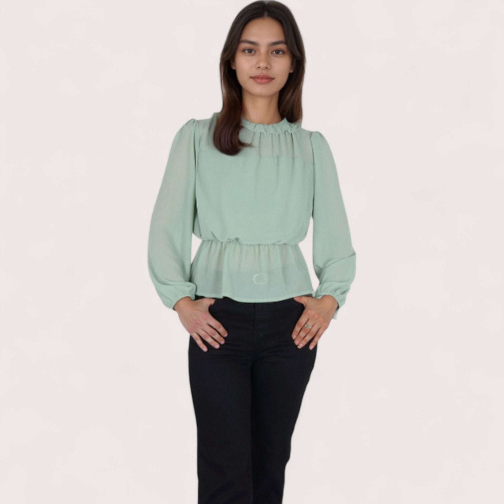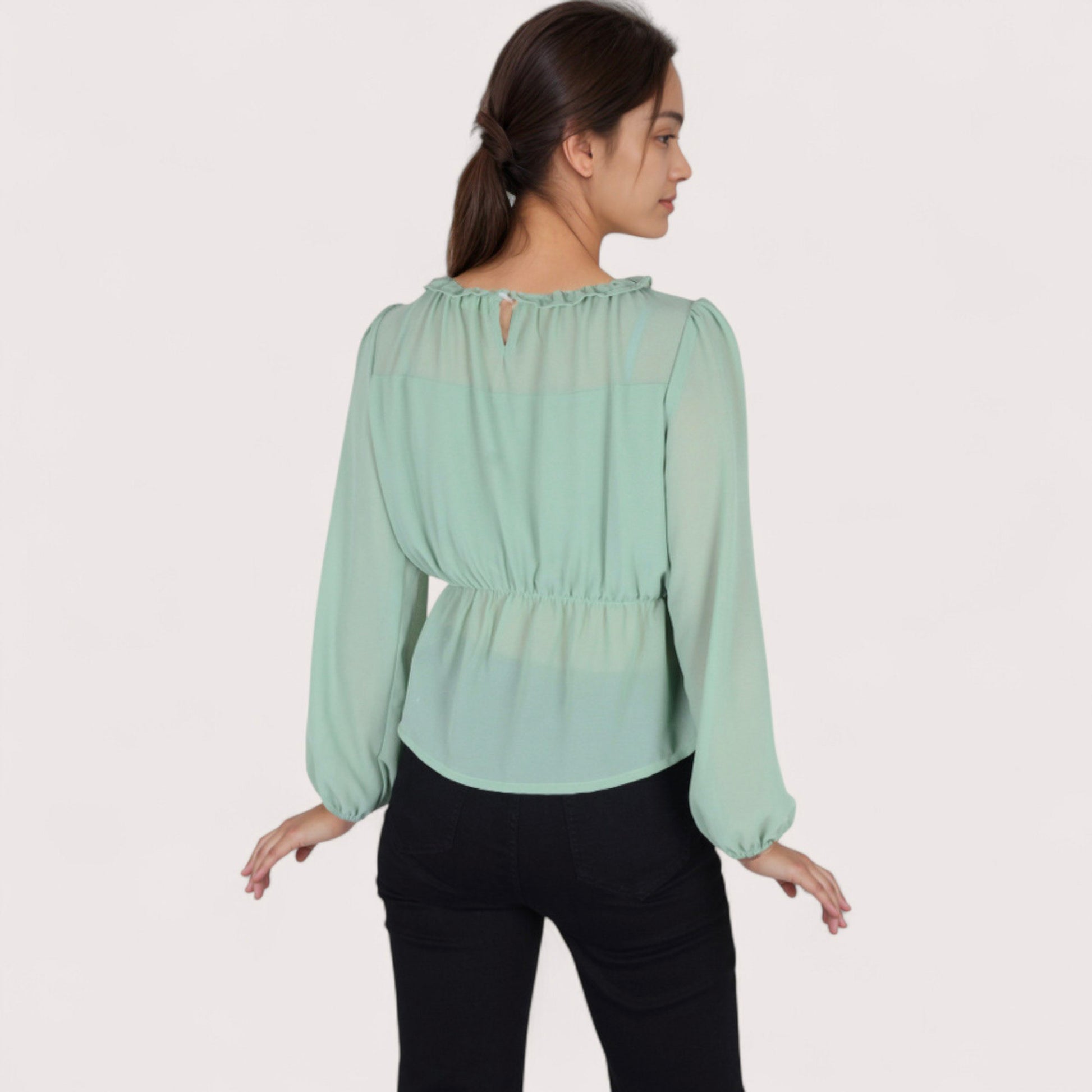 Women's Sheer Yoke Long Sleeve Blouse with Ruffle Neckline and Cinched Waist Detail - Small, Green
