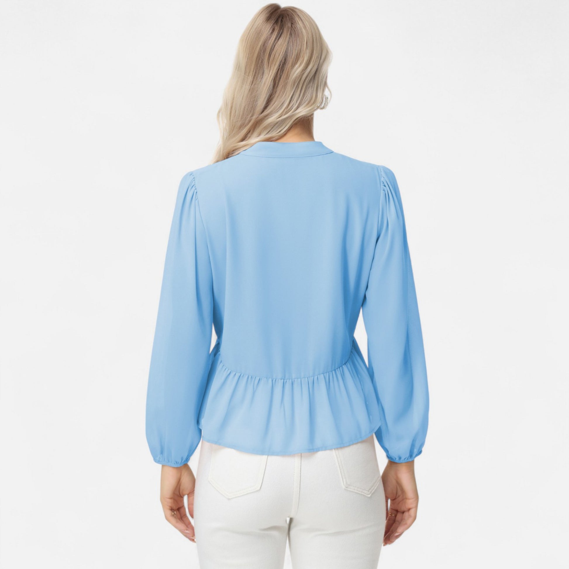 The Anna-Kaci Women's Long Sleeve Peplum Blouse brings a feminine twist to your wardrobe essentials. Featuring a soft V-neckline with button-front accents and a gently gathered peplum waist, this top flatters the figure while maintaining a flowy, comfortable fit. Light, breathable fabric drapes gracefully over the body, making it a versatile choice for dressing up or down. Style it with denim or tailored trousers for an effortlessly polished look.