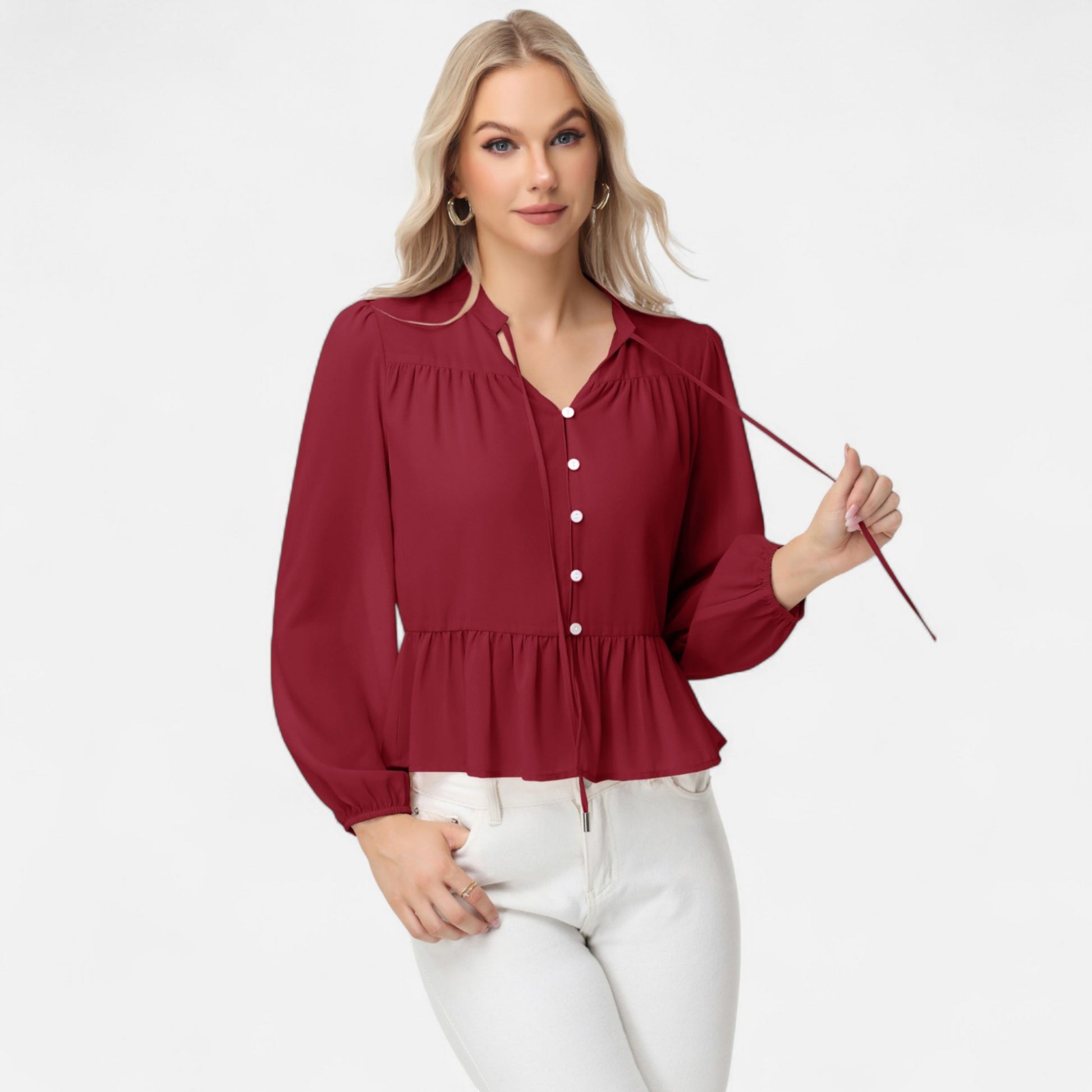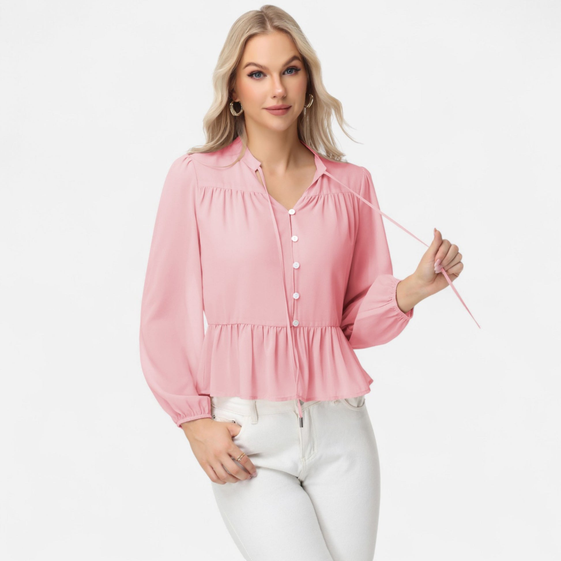Long Sleeve Button Front Peplum Blouse with V-Neckline and Gathered Waist Detail