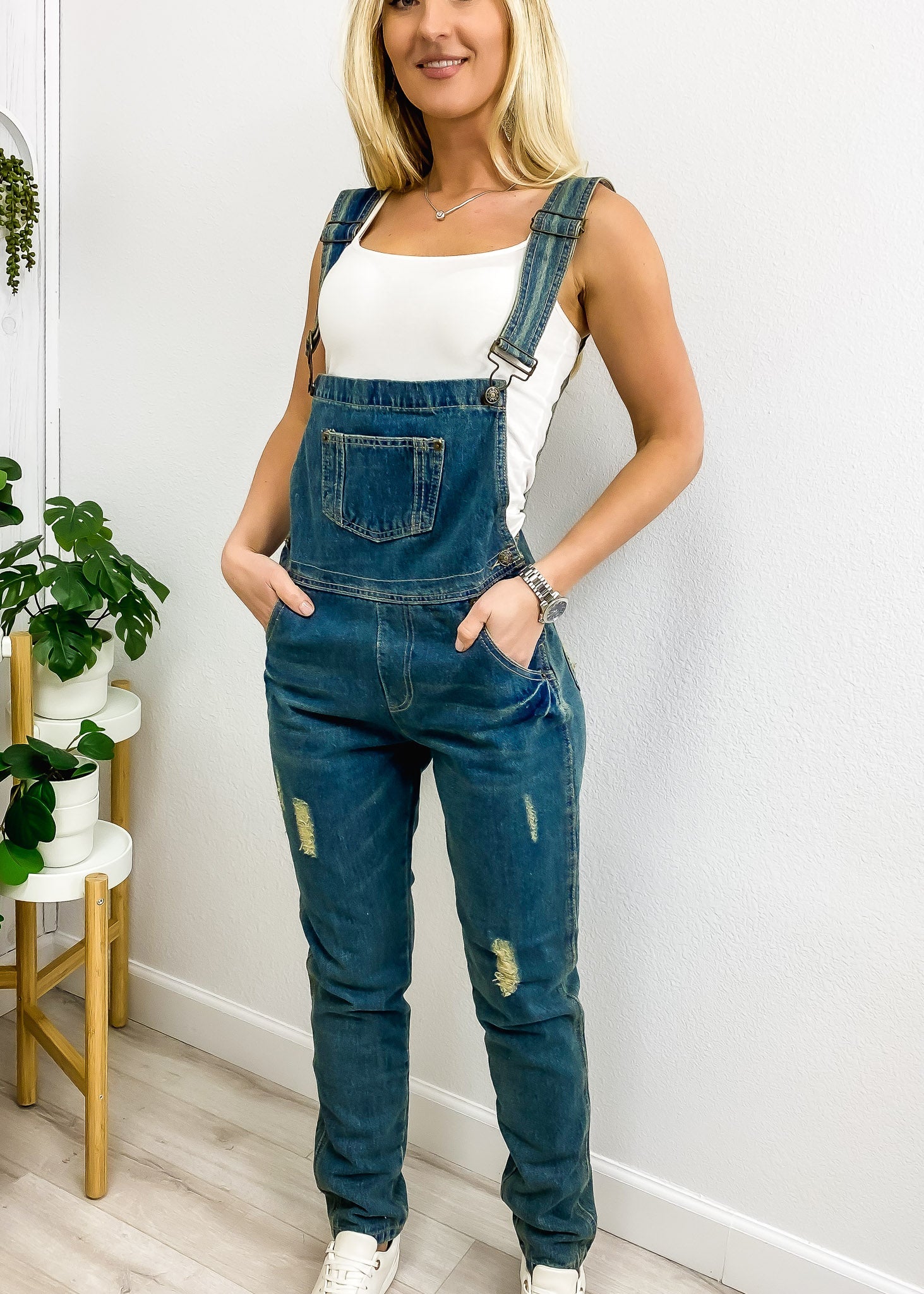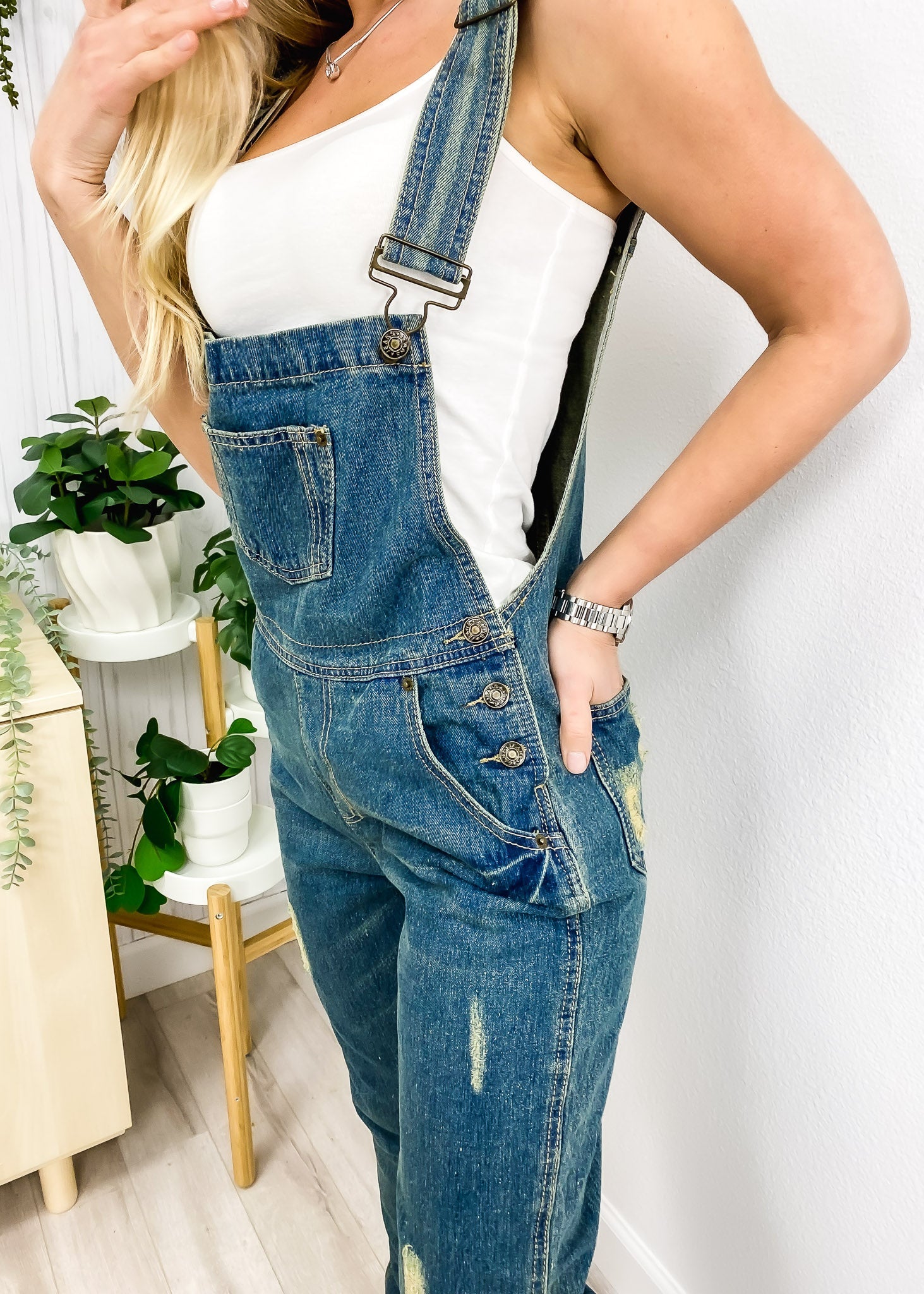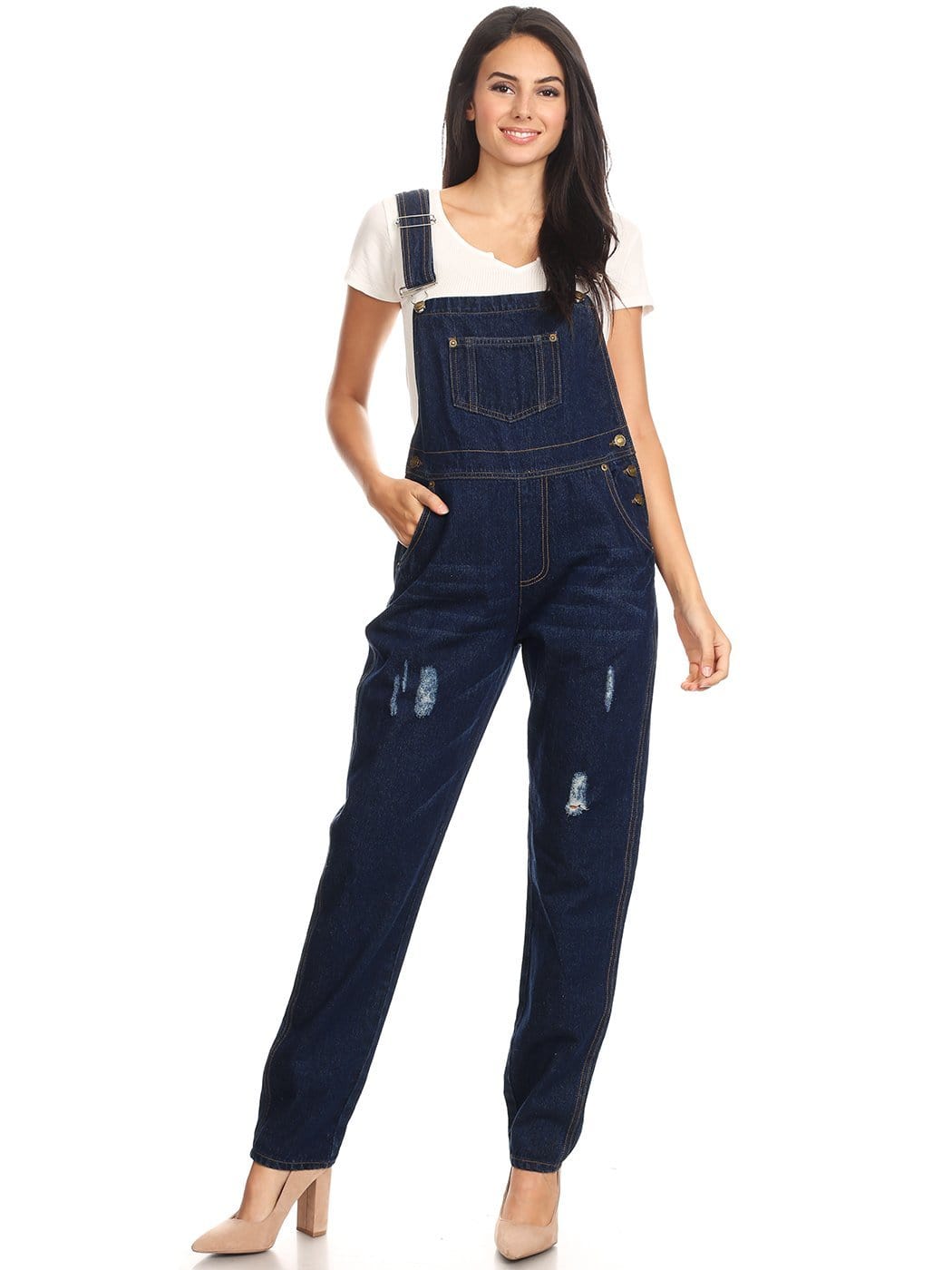 - DISTRESSED DENIM FOR A VINTAGE LOOK. Just one of those classic pieces that you need in every wardrobe. These cute bib style overalls have a distressed finish to give it a fun, worn look while still being durable due to the high quality cotton used.