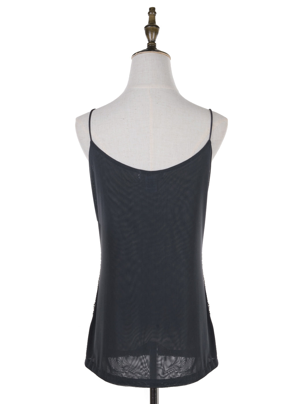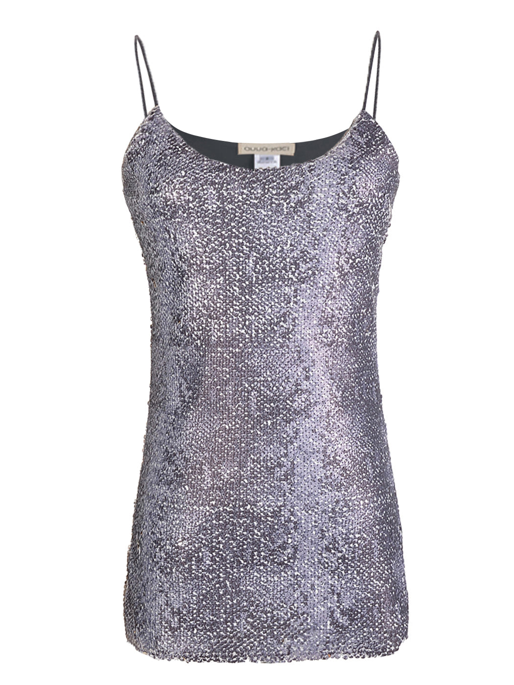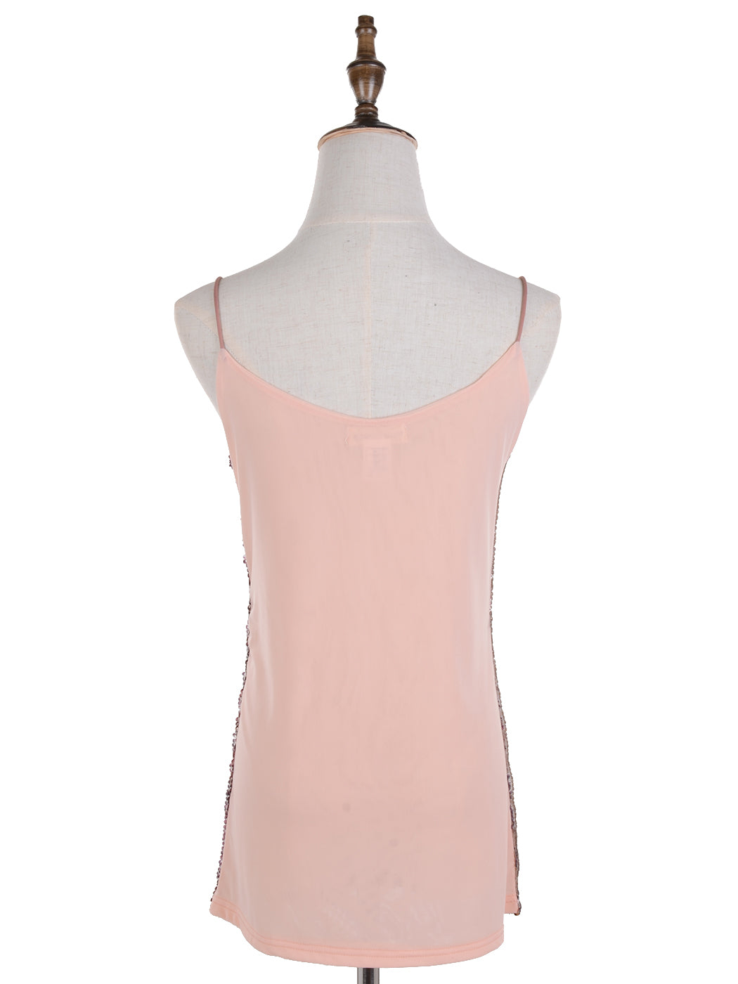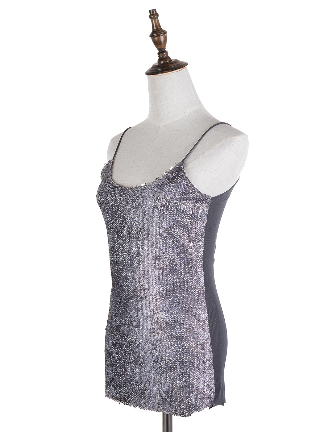 - Sexy tank top featuring spaghetti strap, scoop neck, all over round sequin on the front and semi sheer lightweight fabric at back.