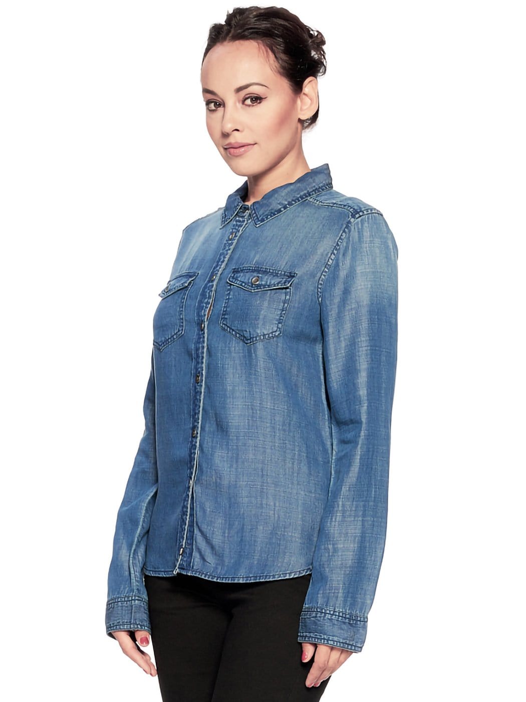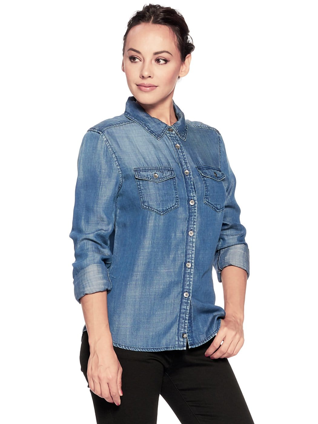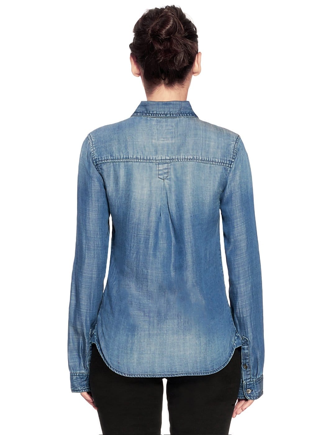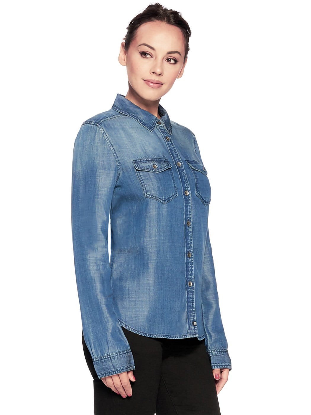 - ICONIC WESTERN SHIRT A straight up classic this washed denim top is make from a comfy fabric of 100% Tencel Lyocell. Lightweight & soft the slim fit silhouette and premium blue jean inspired textile make it breathable to wear and move around in.