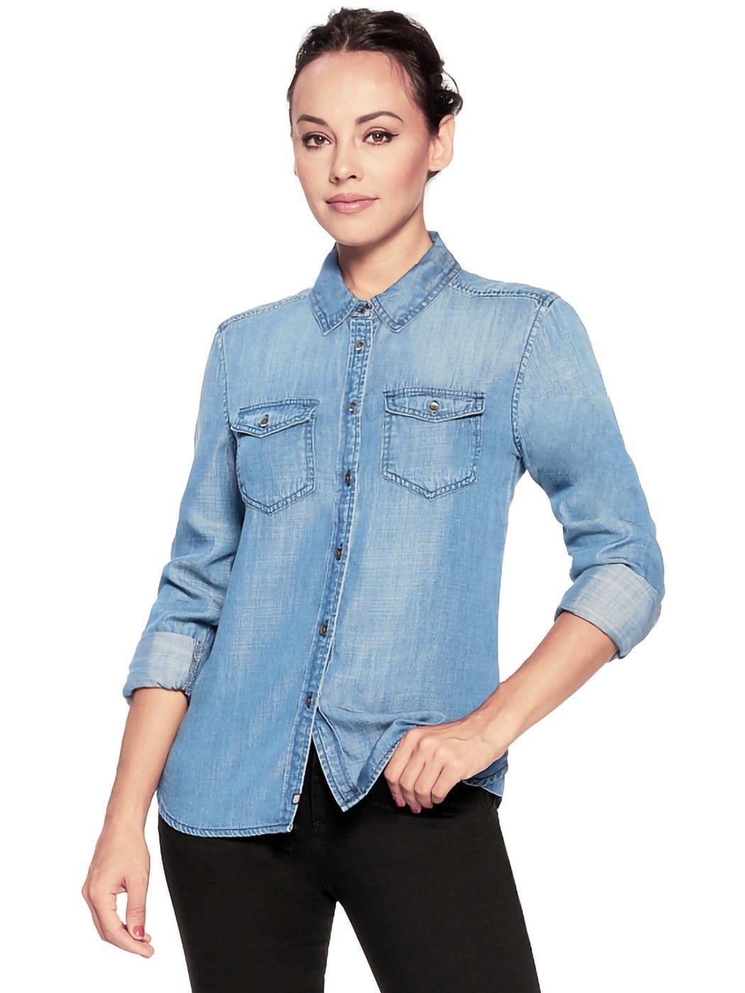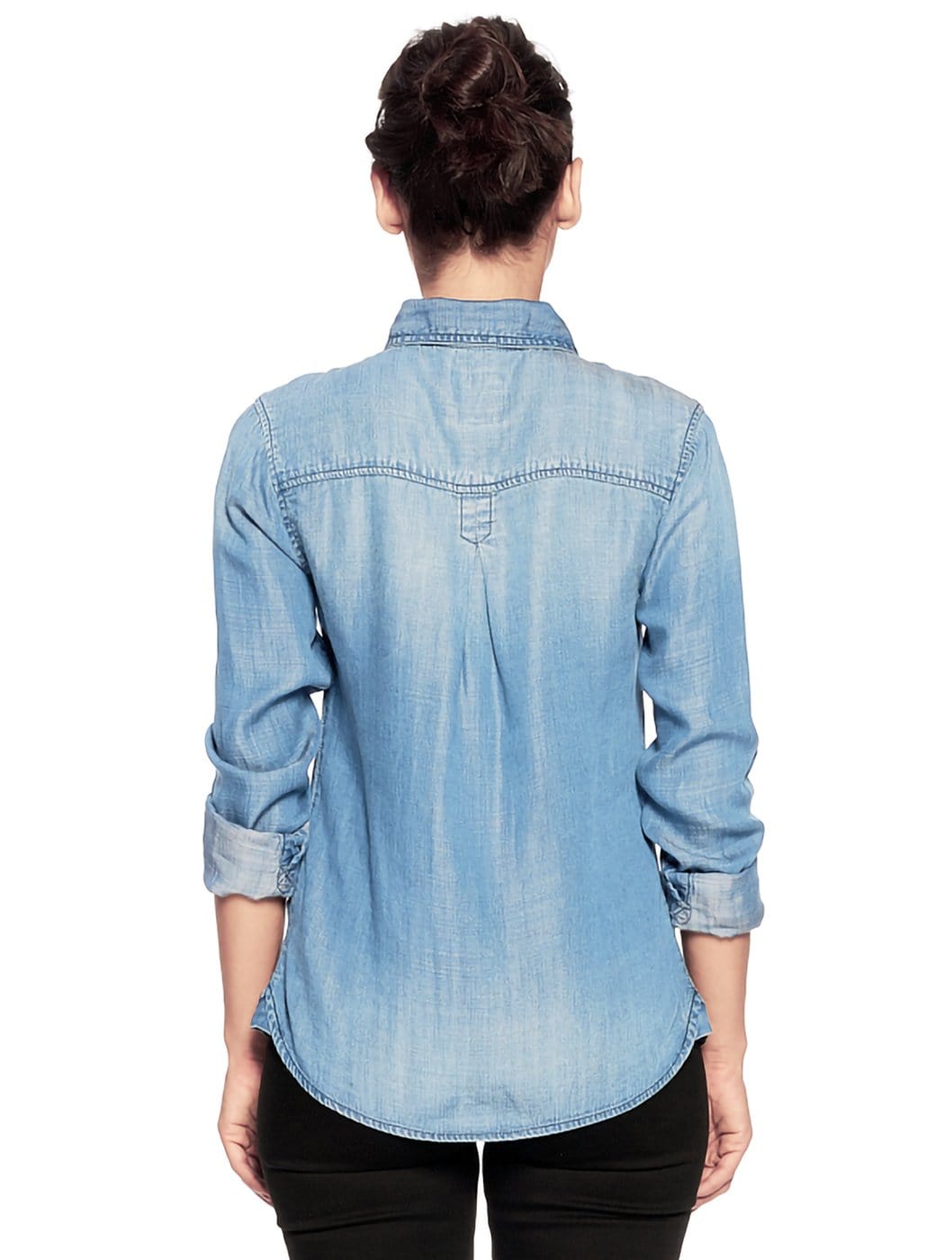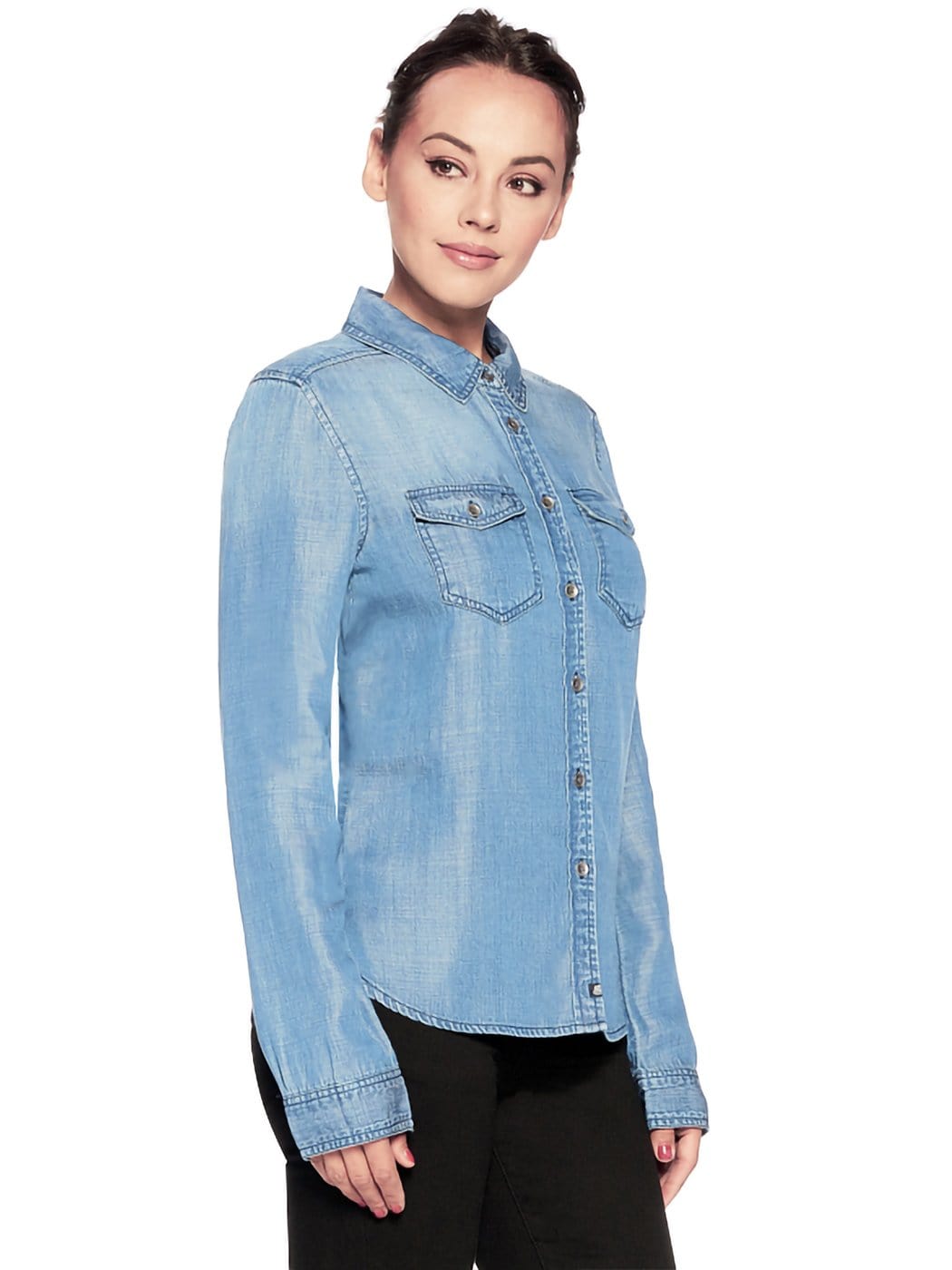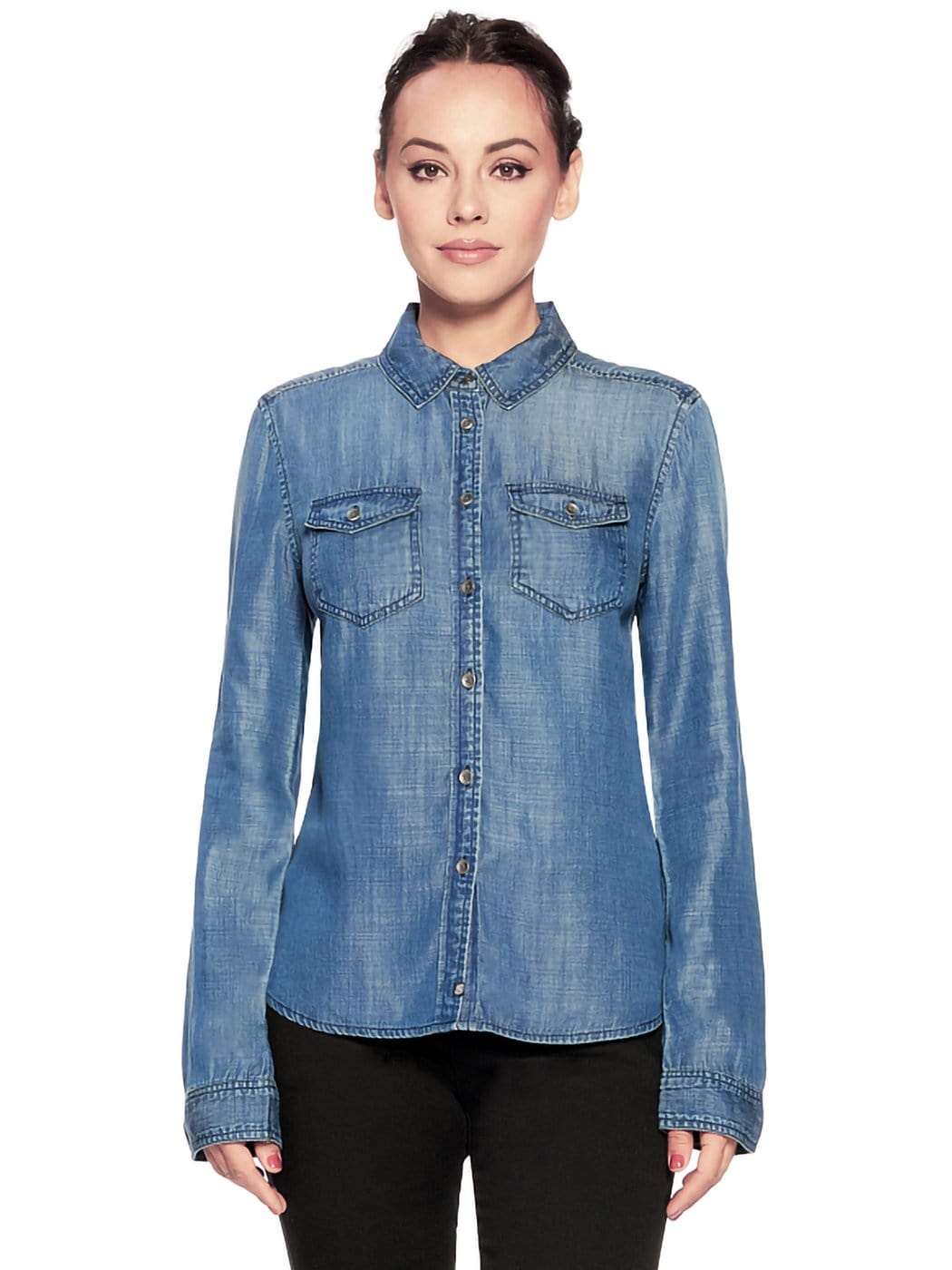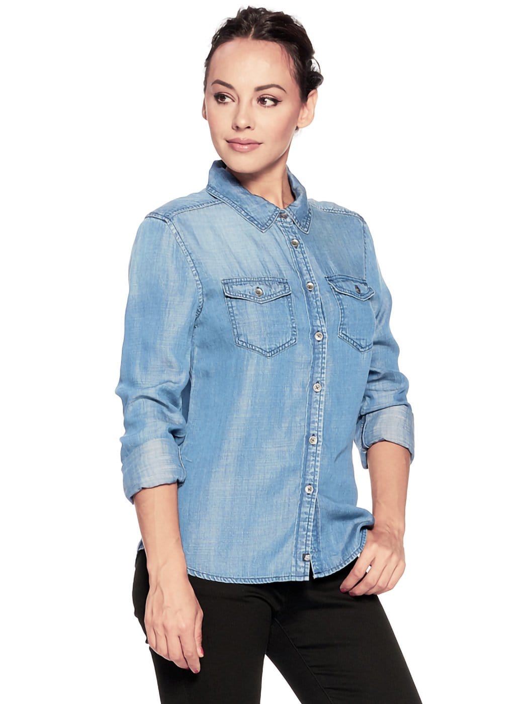 - ICONIC WESTERN SHIRT A straight up classic this washed denim top is make from a comfy fabric of 100% Tencel Lyocell. Lightweight & soft the slim fit silhouette and premium blue jean inspired textile make it breathable to wear and move around in.