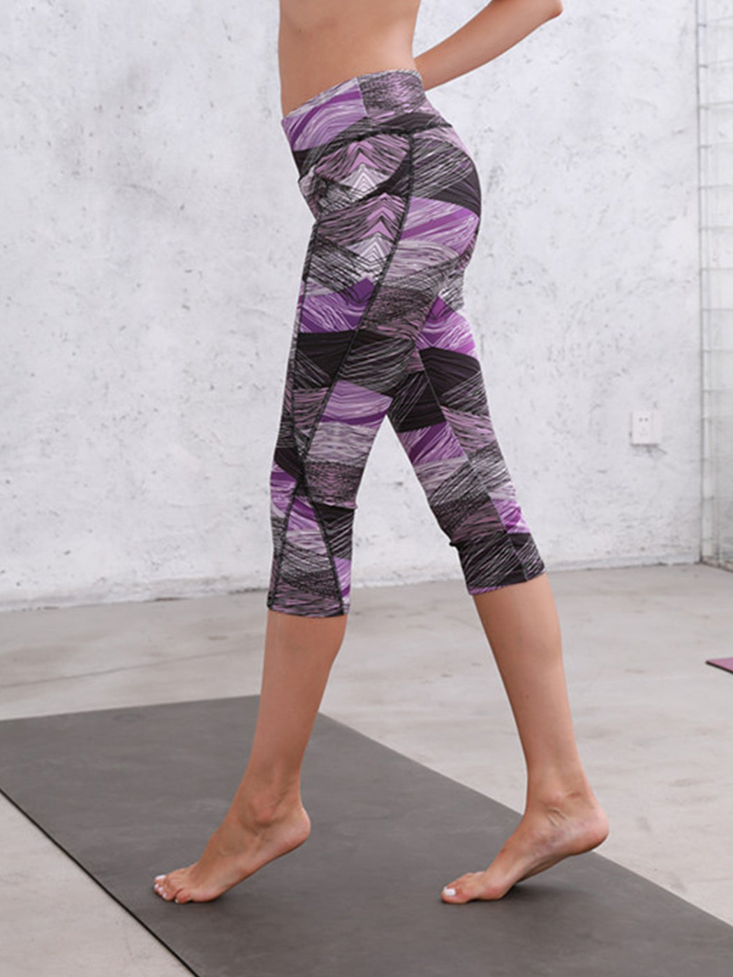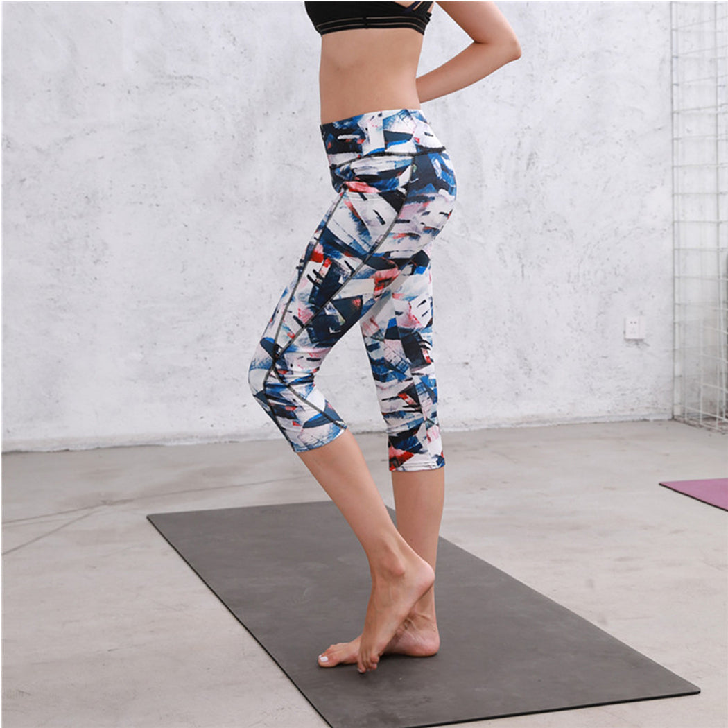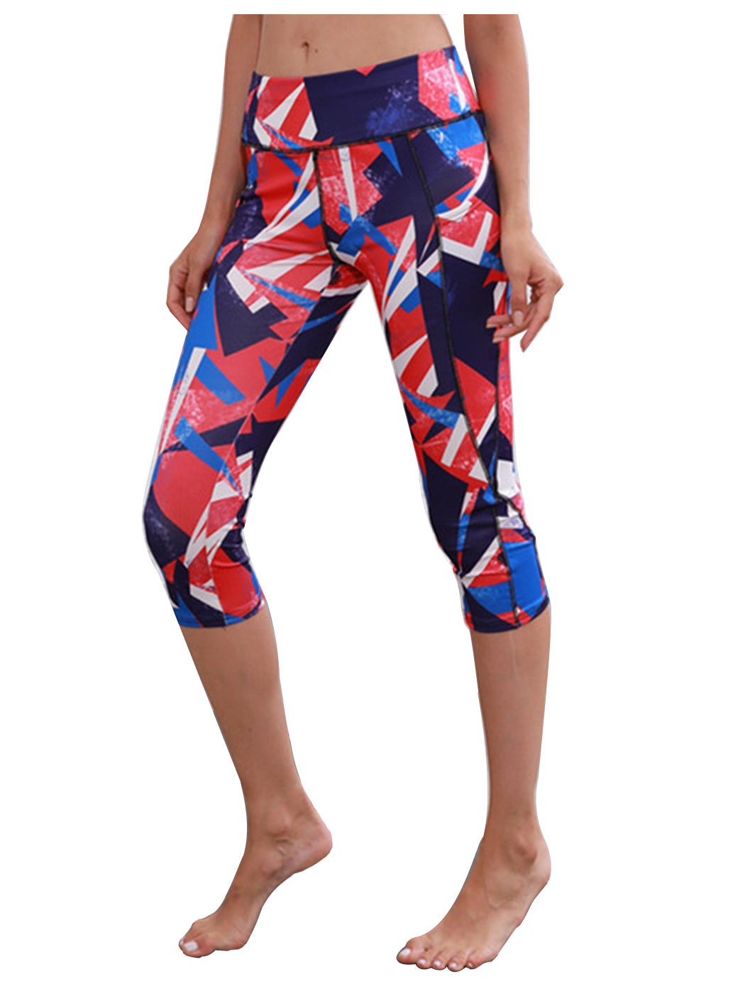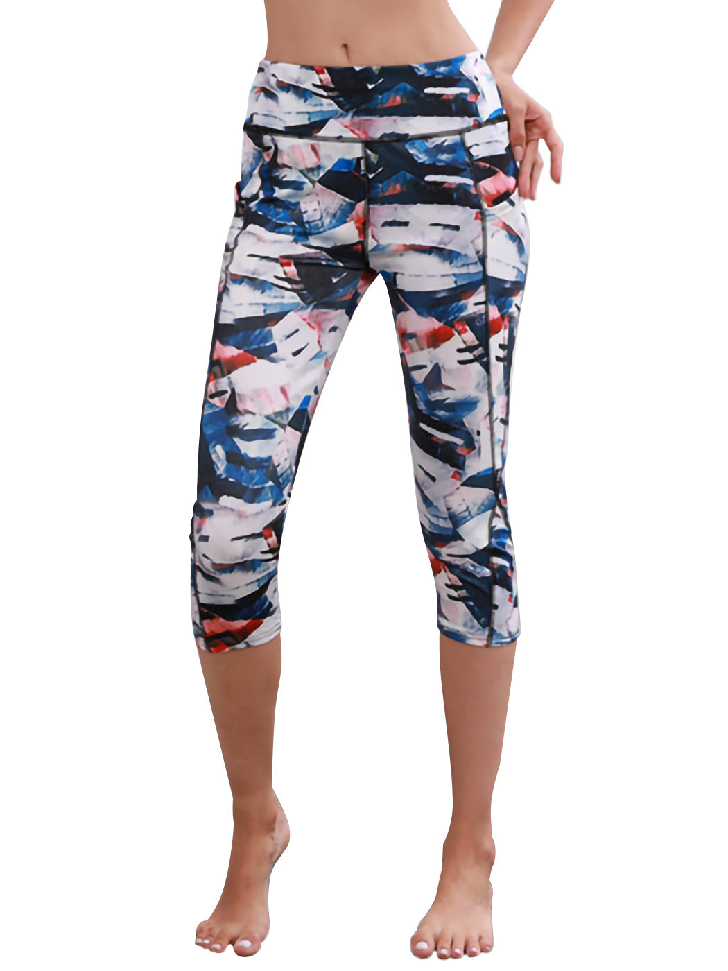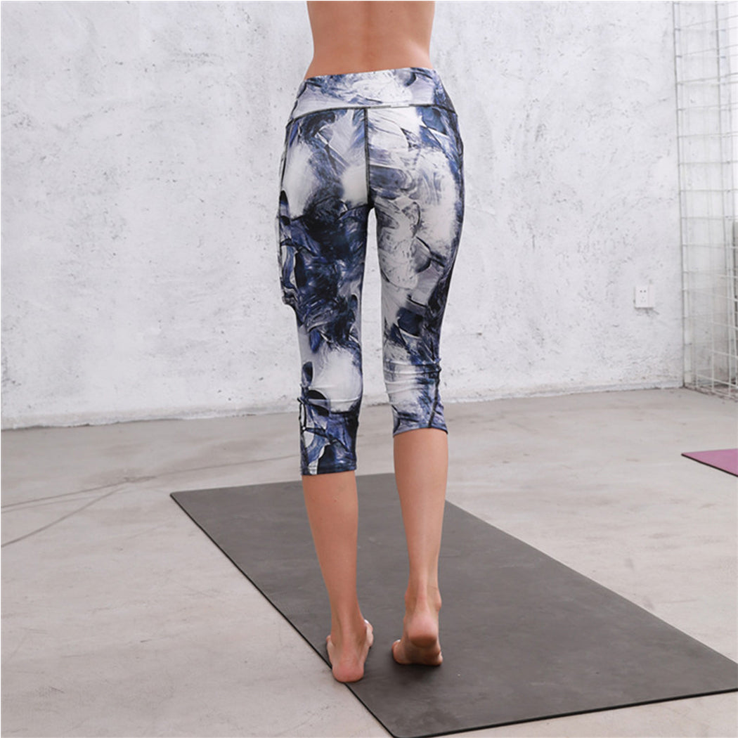 Printed High Waisted Blue White Yoga Gym Stretchy Capri Pants Leggings