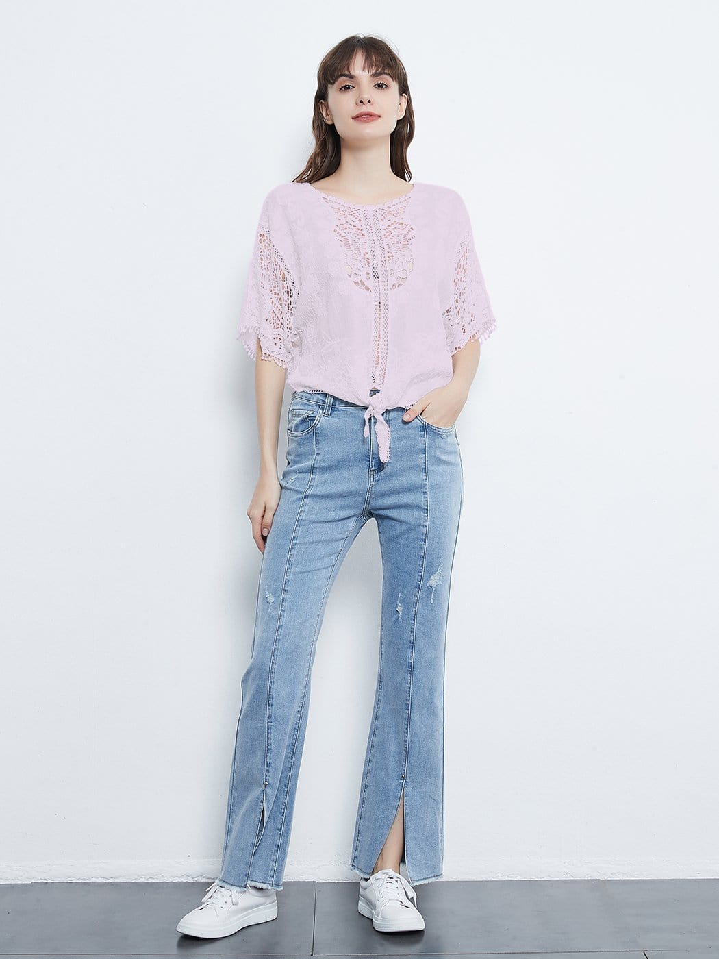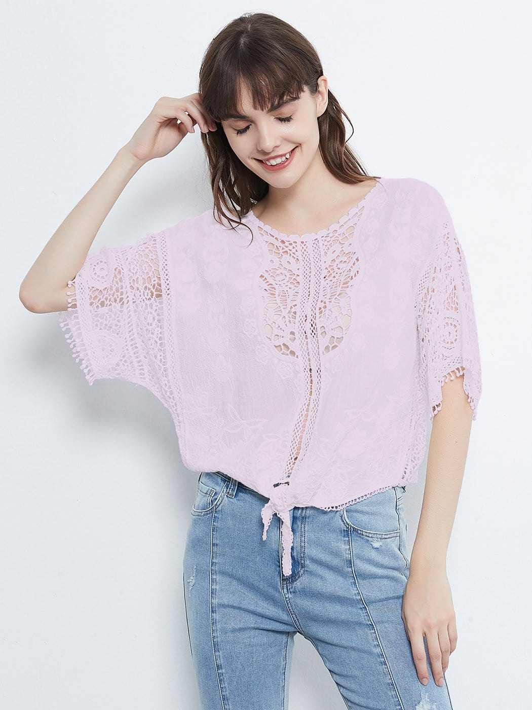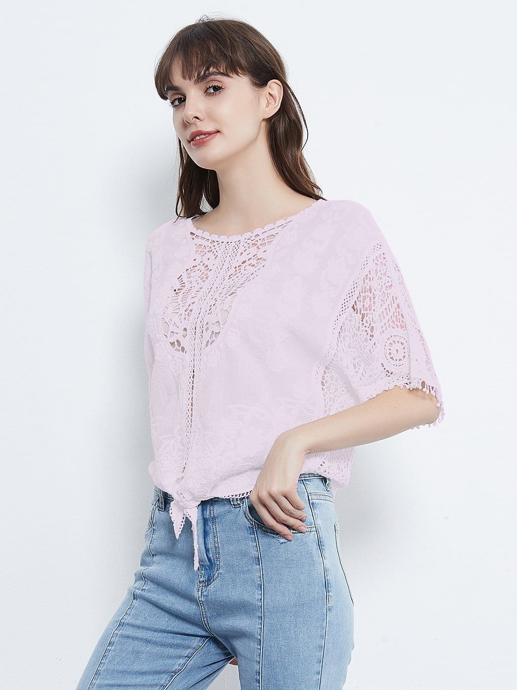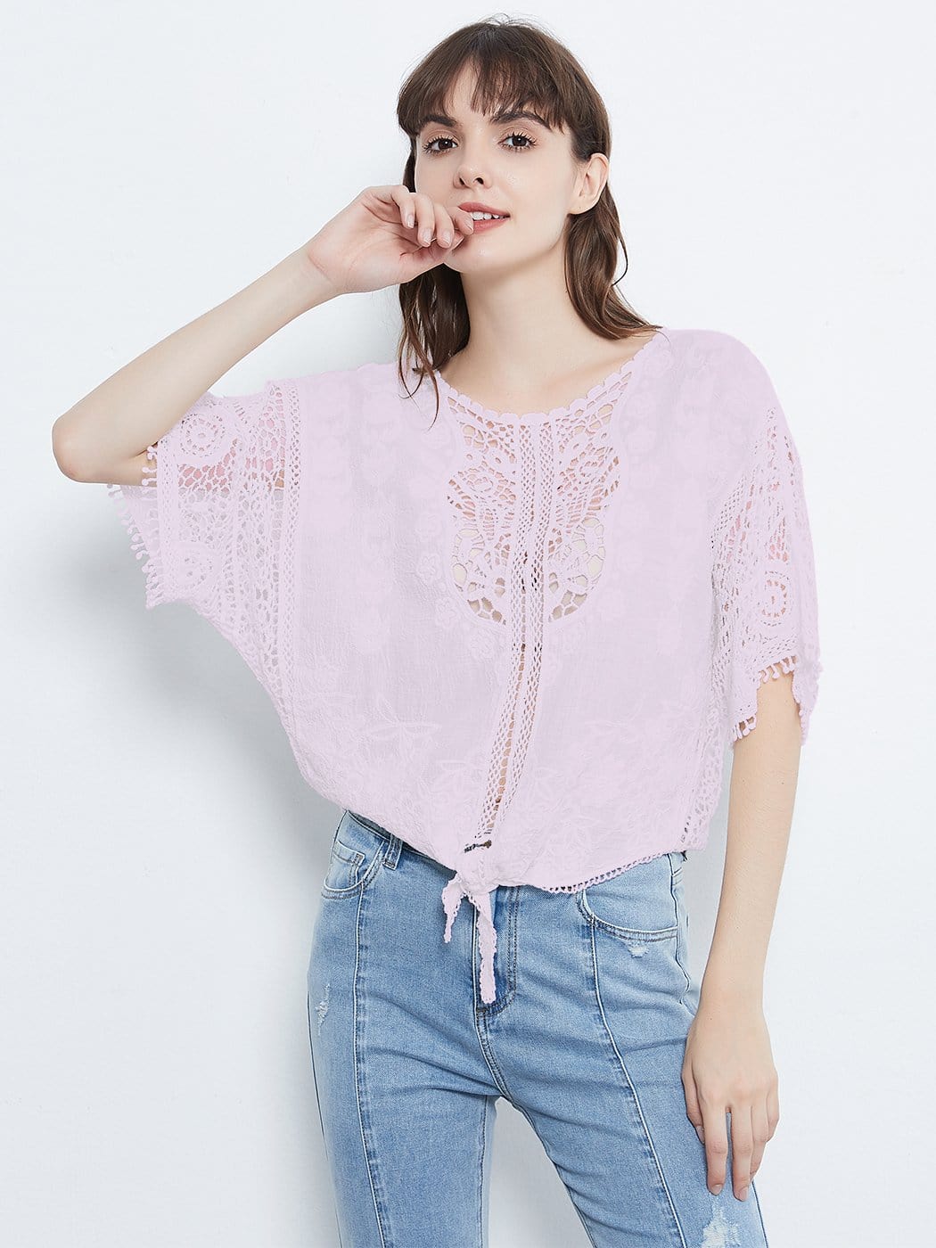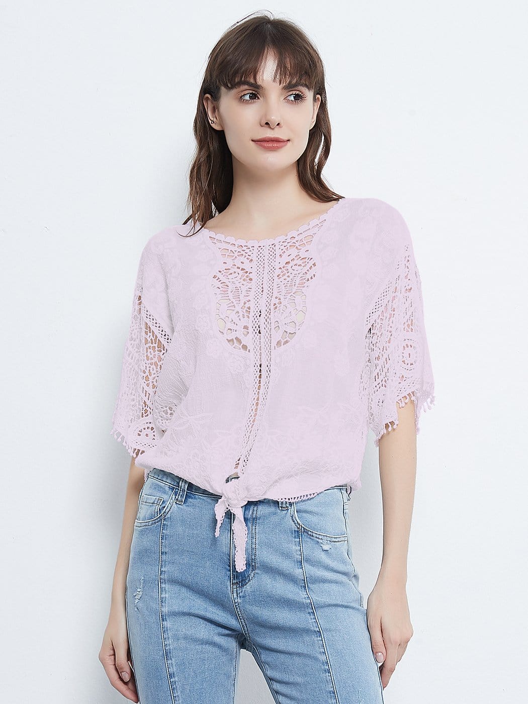 - [Unique Design]----Stylish crochet printed shirt, O-Neck, half sleeve, tie knot T-shirt blouses look very nice. Summer crochet printed blouses with tie knot front, meet your fashion taste!