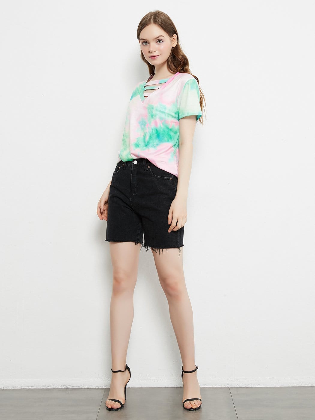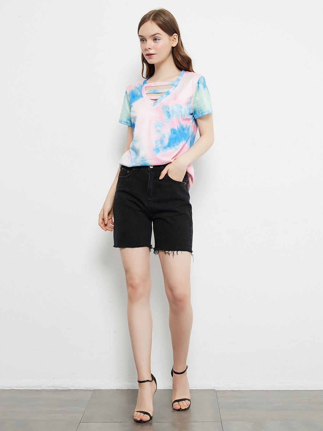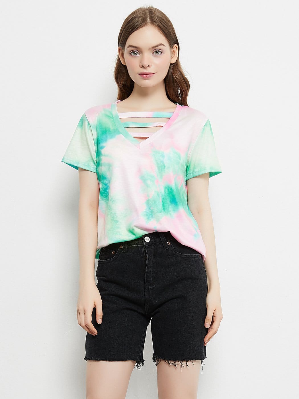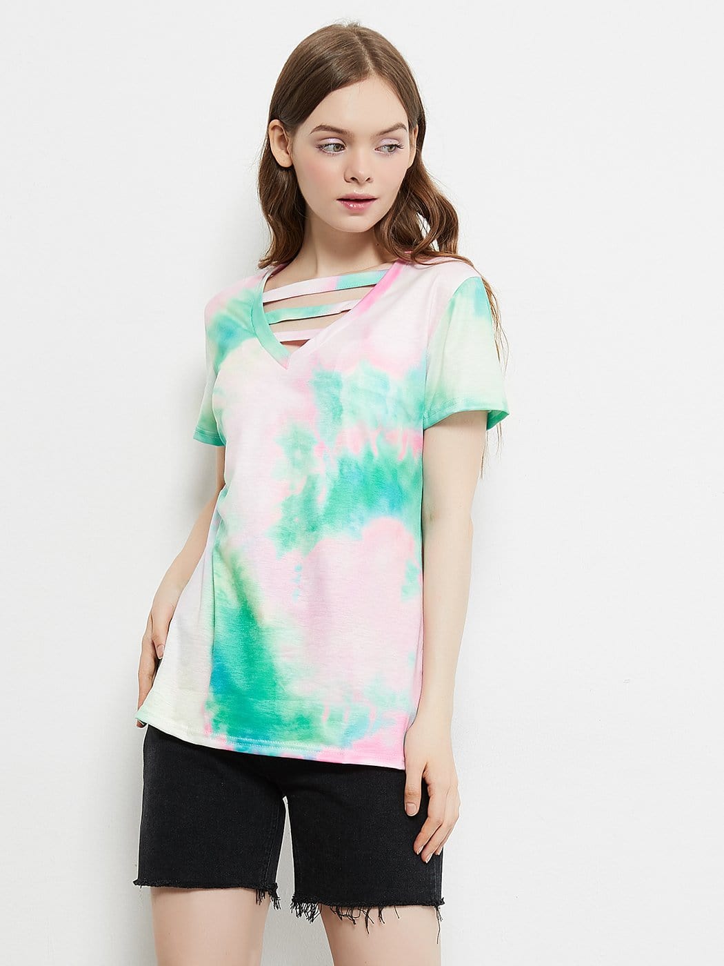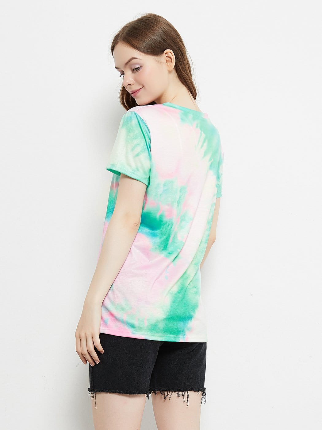 Tie Dye Printed Stripe V-Neck Stretch Short Sleeve Casual Loose Tops T-shirts