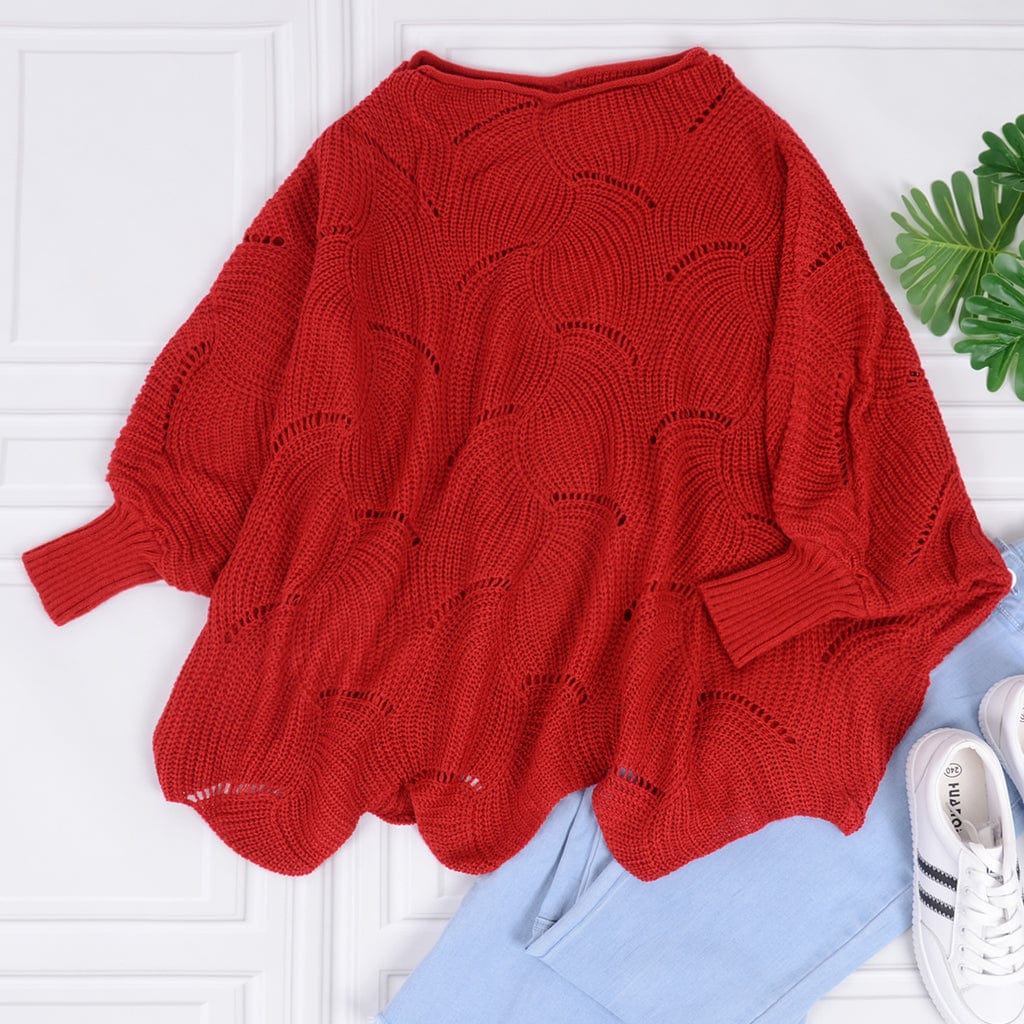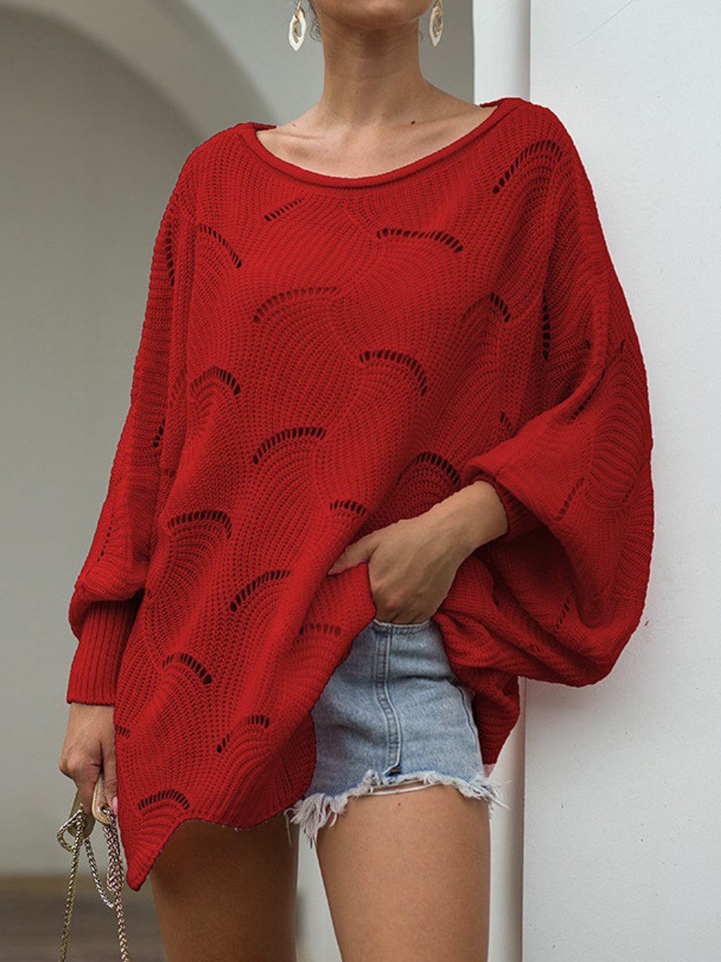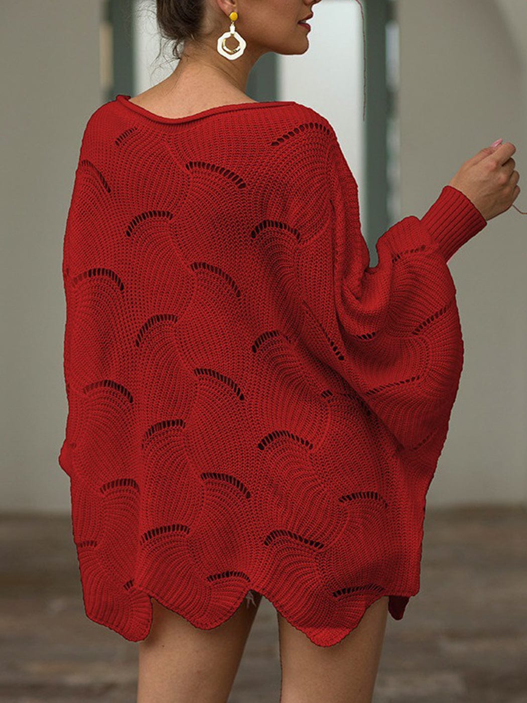- FEATURES - Eyelet hollow out, batwing sleeve, long sleeve, oversized, boat neck, casual loose, off shoulder, irregular scallop hem, solid color, pullover sweater with tightened cuff.