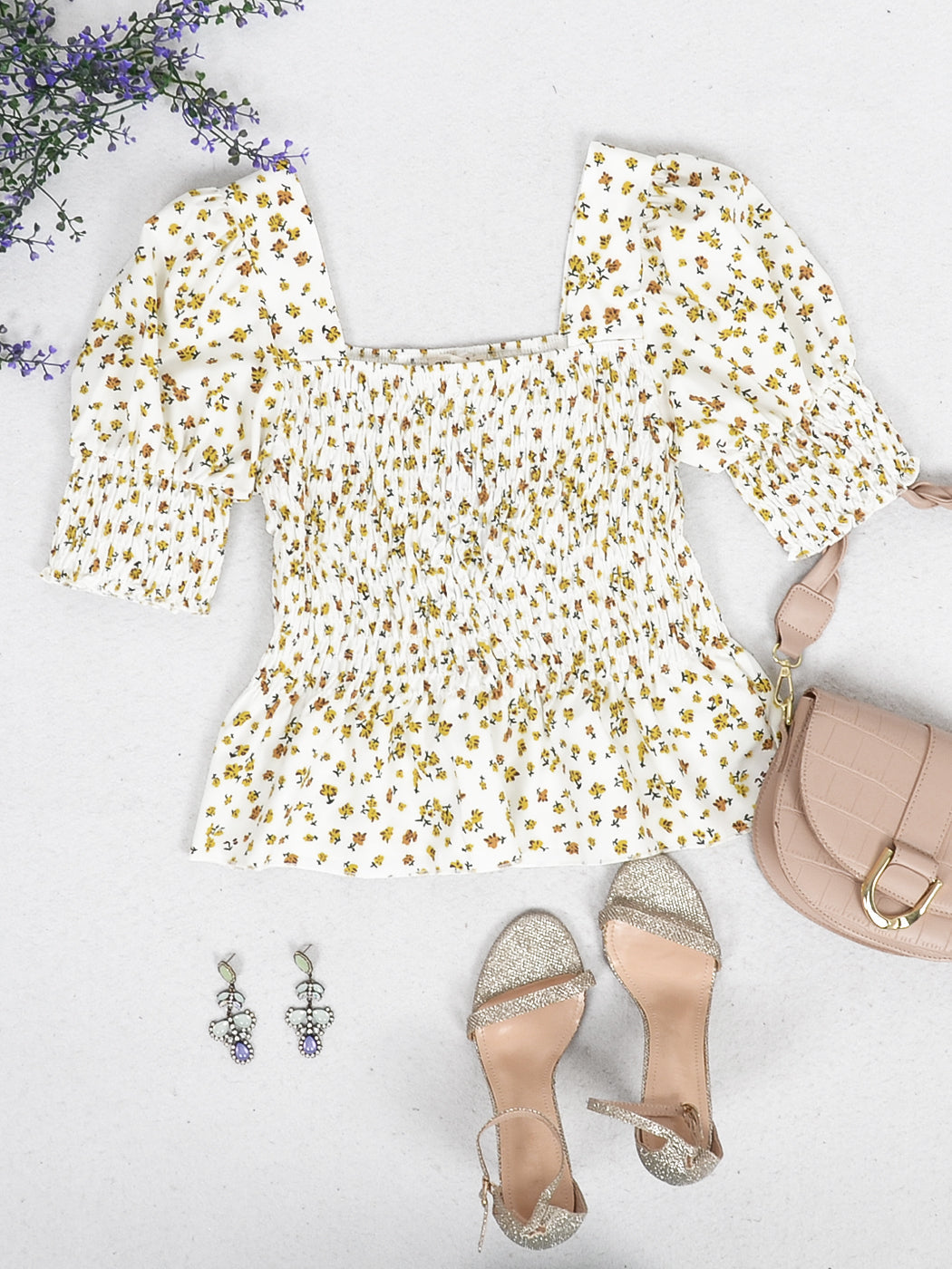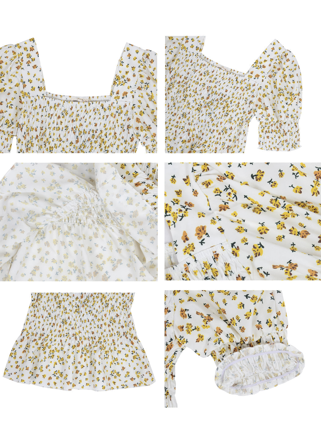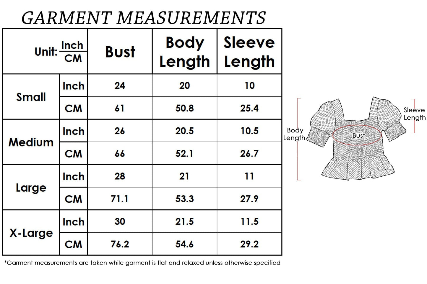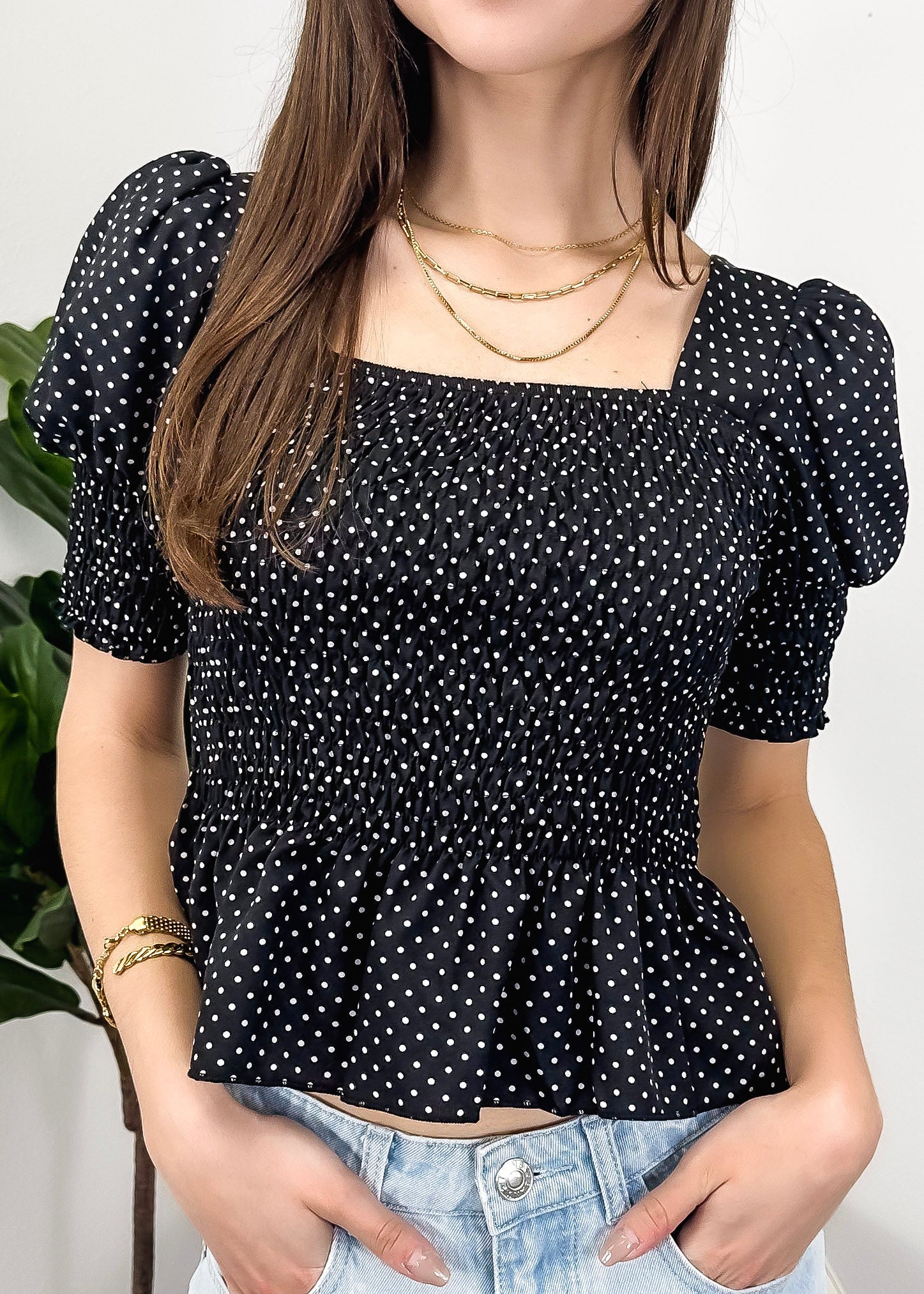 FEATURES - Polka dots smocked crop top, ruffle bottom, square neck, regular fit, puff short sleeve top.