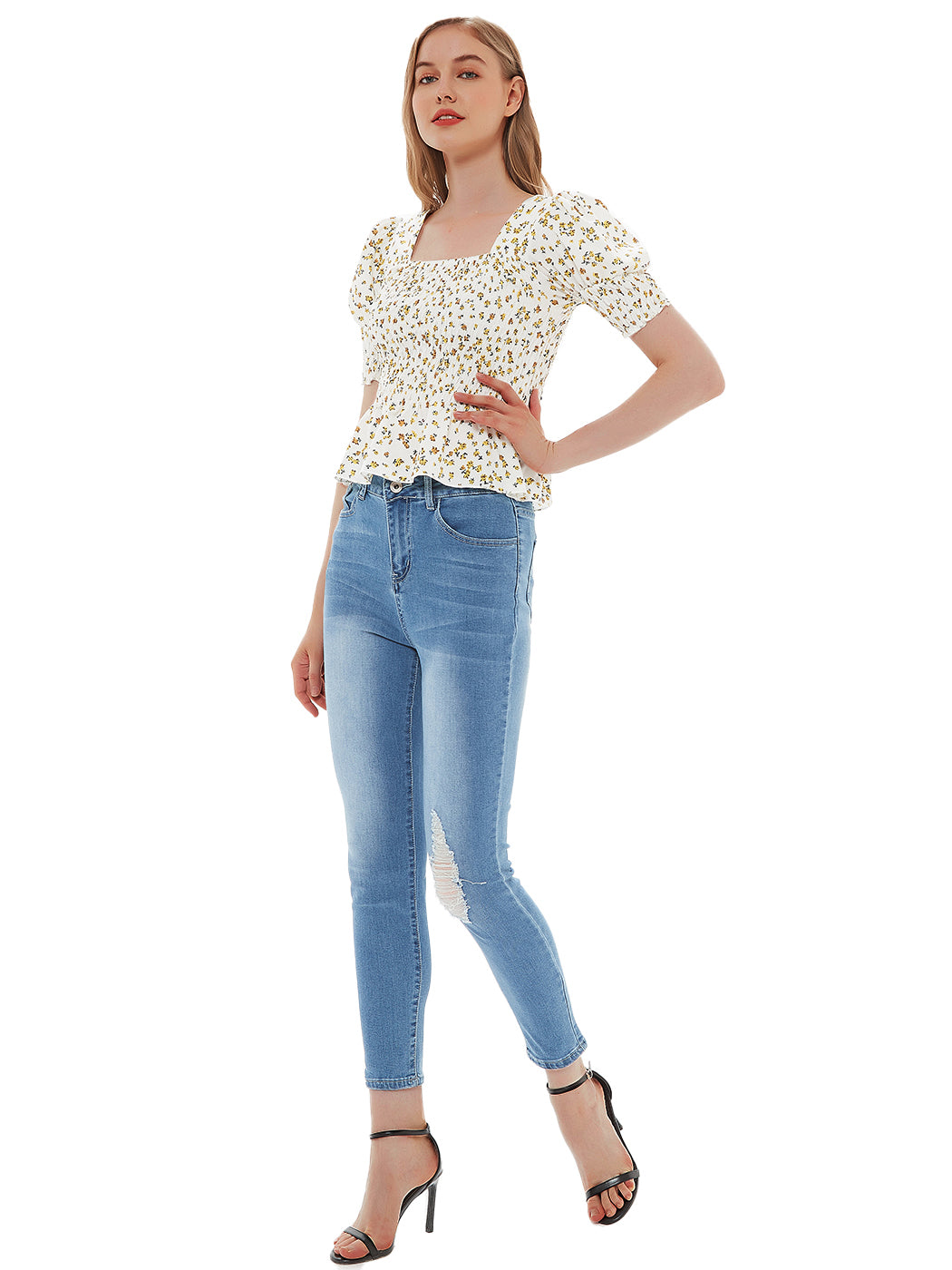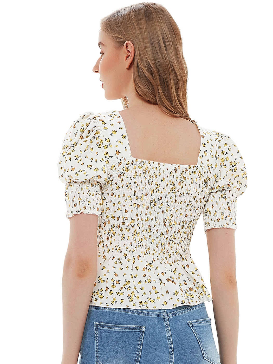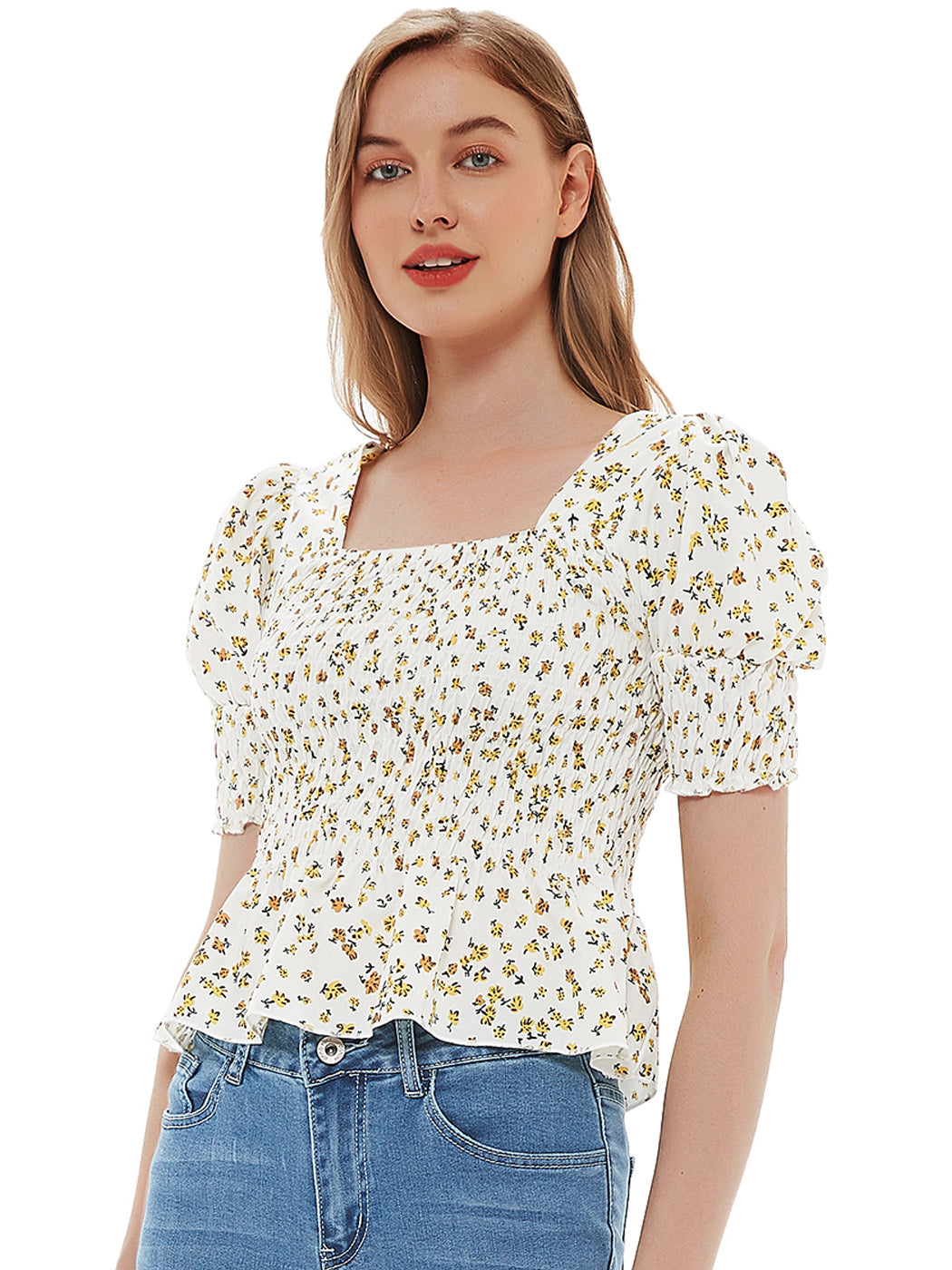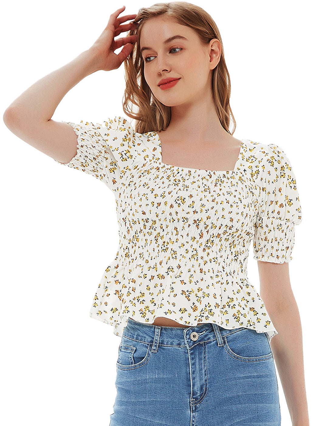 Anna-Kaci Women Ruffle Sleeve Smocked Square Neck Puffy Print Top