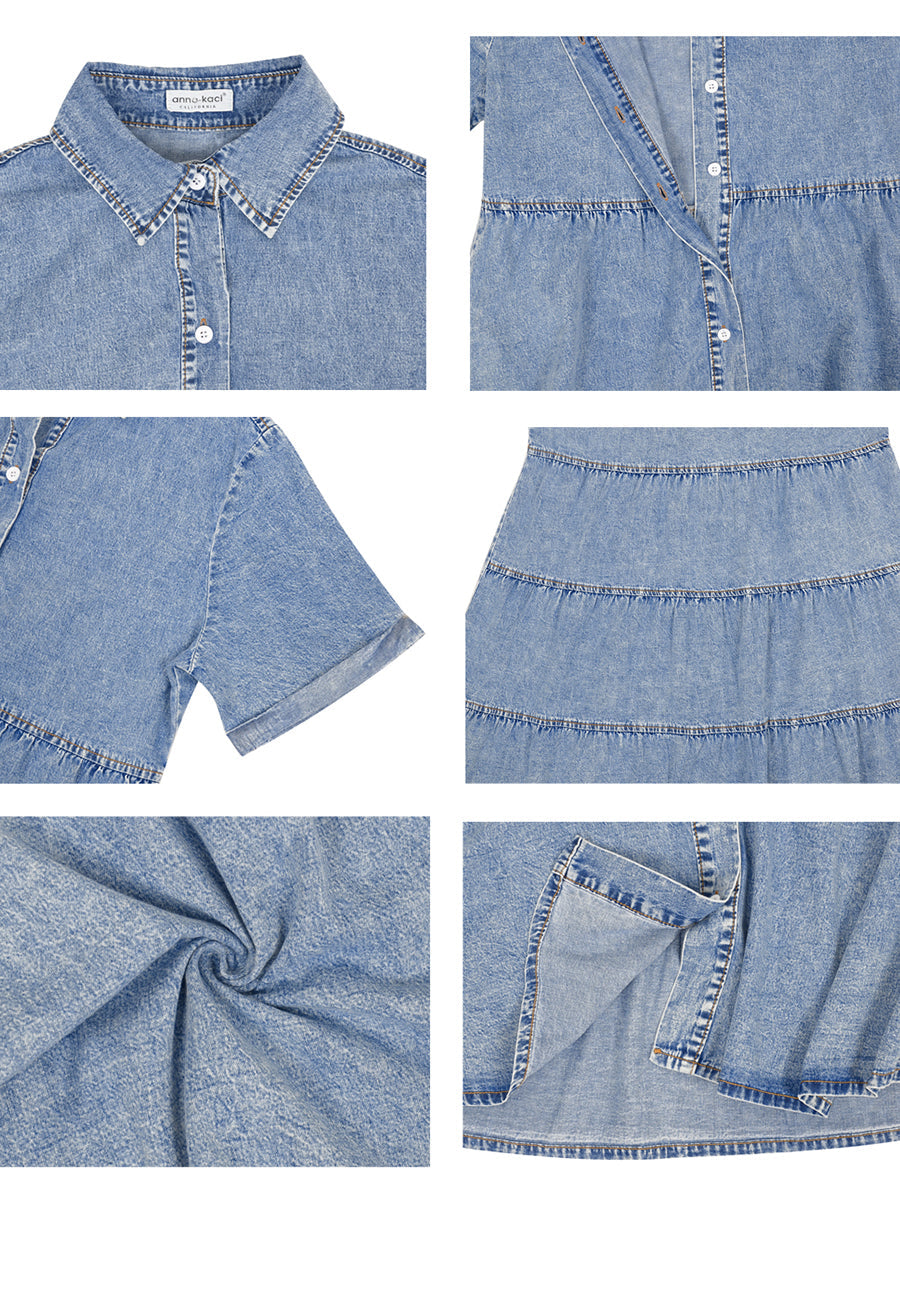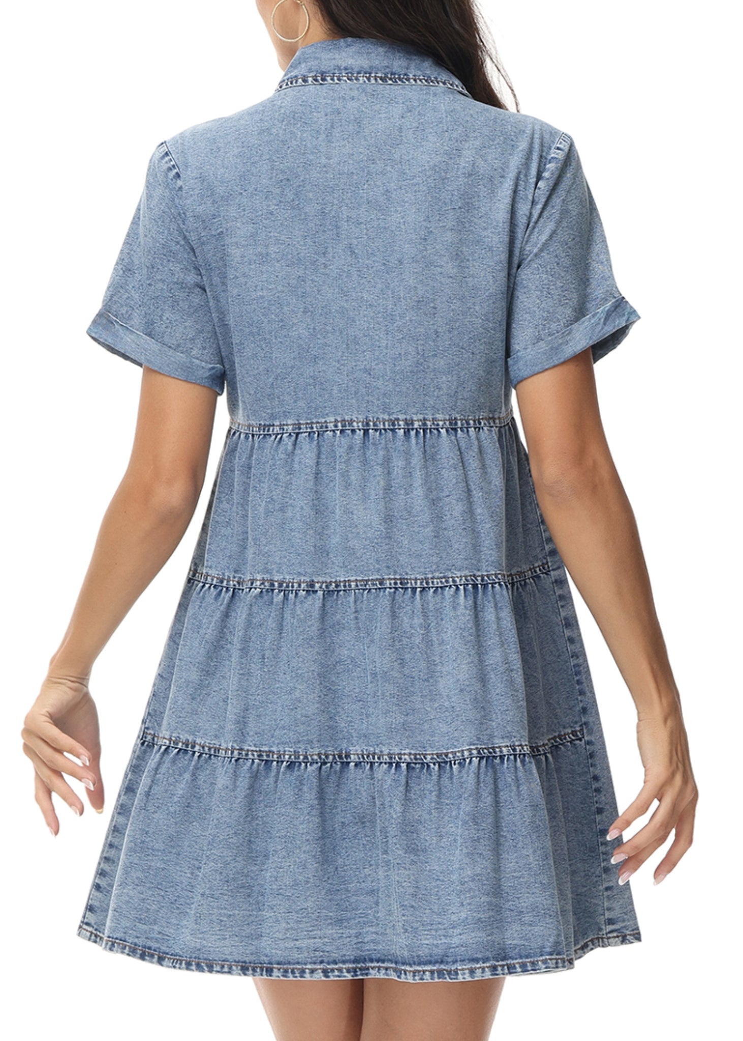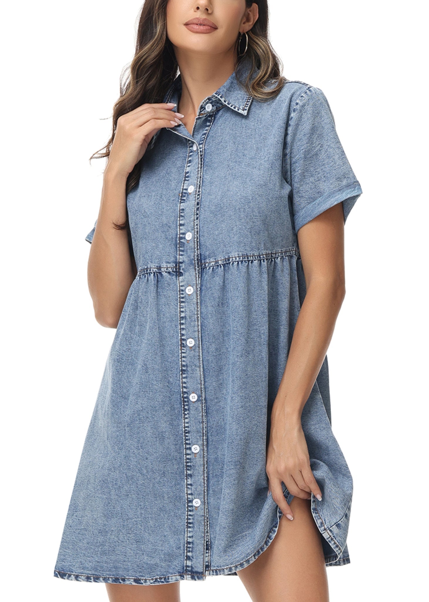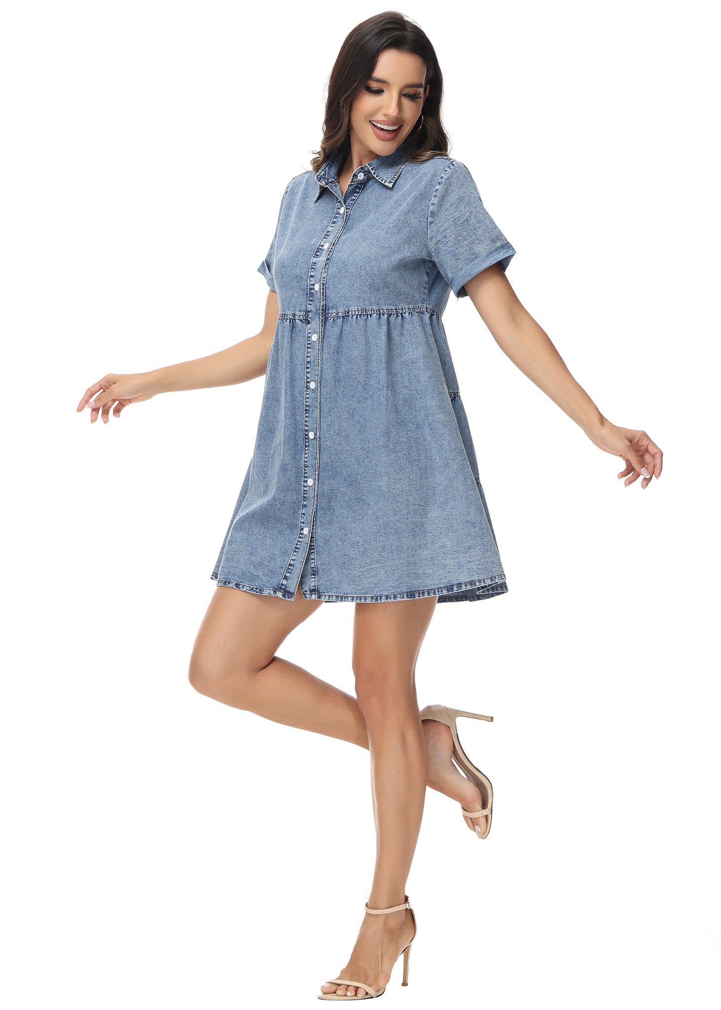 Lapel collar denim dress/ short sleeve shirt denim dress for women/ womens button down jean dress/ back tiered shirt dress/ denim babydoll dress for women/ high waist babydoll dress/ above knee length jean dress/ summer casual denim dress