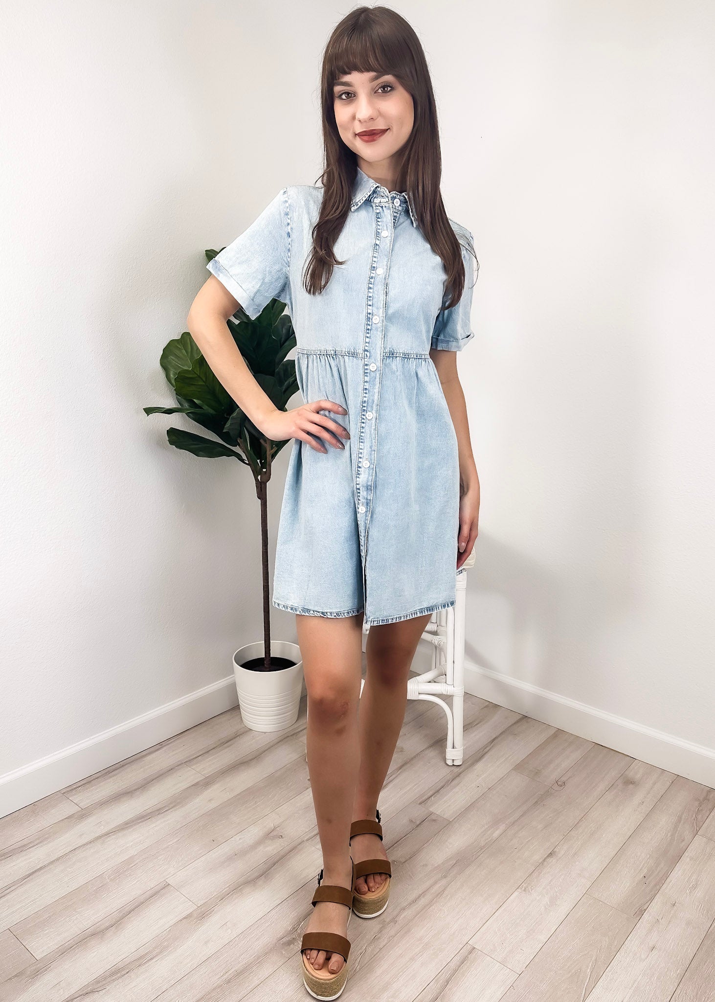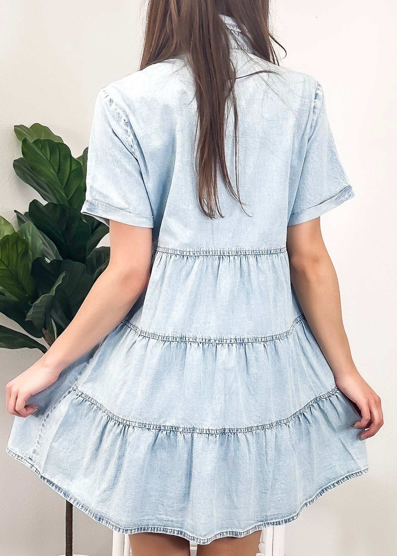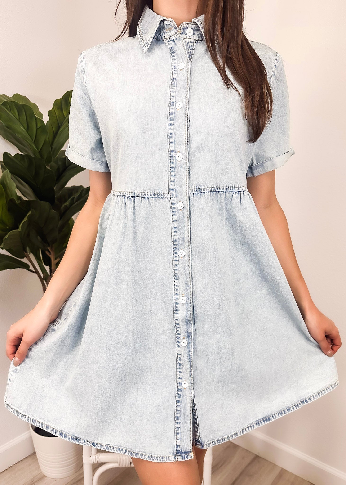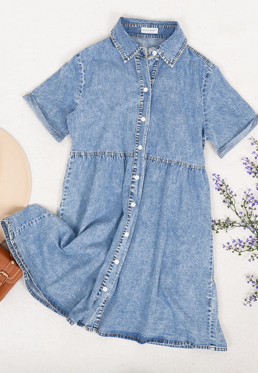 Lapel collar denim dress/ short sleeve shirt denim dress for women/ womens button down jean dress/ back tiered shirt dress/ denim babydoll dress for women/ high waist babydoll dress/ above knee length jean dress/ summer casual denim dress