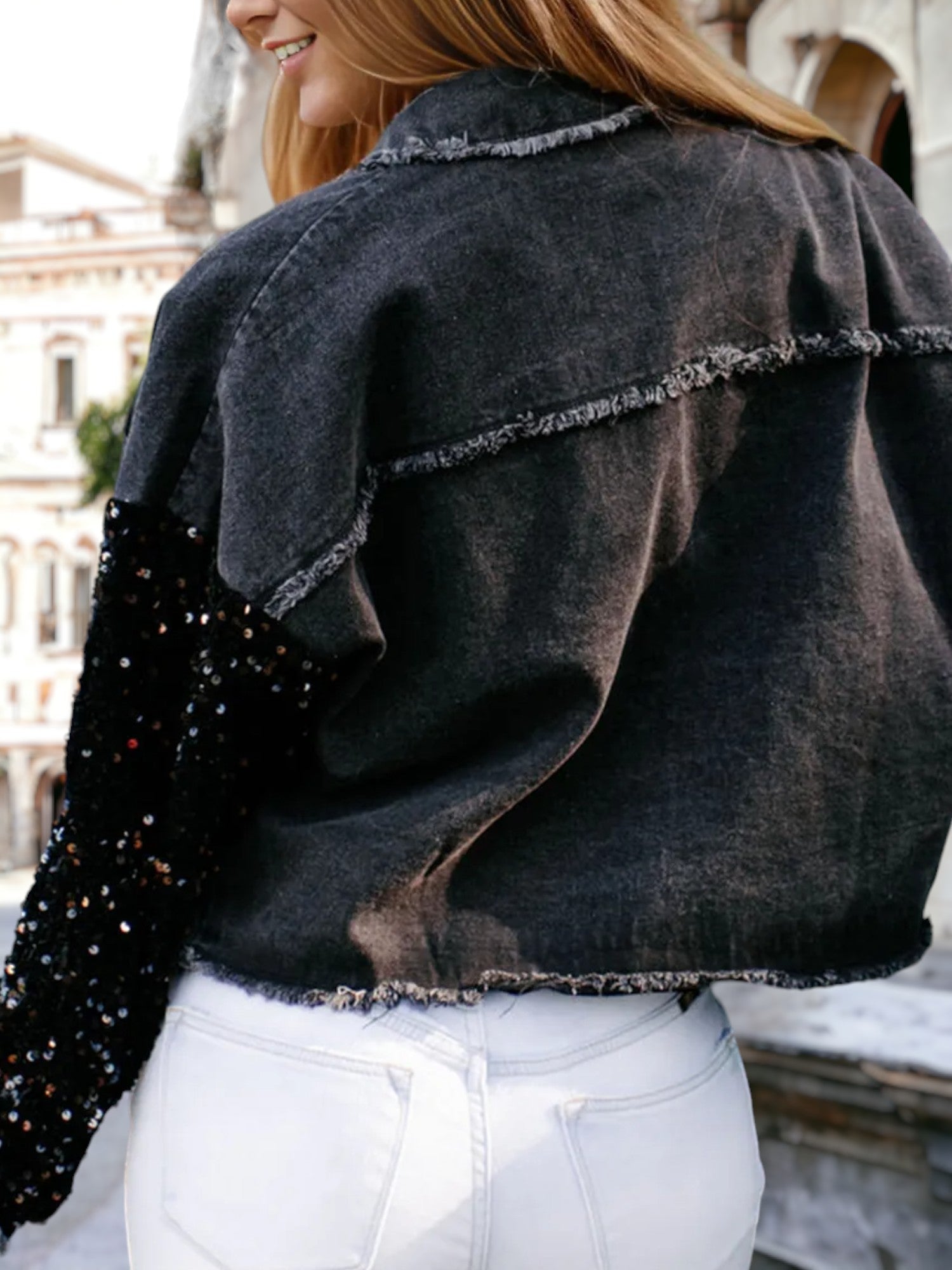 Sequin Long Sleeve Button Down Cropped Denim Jacket