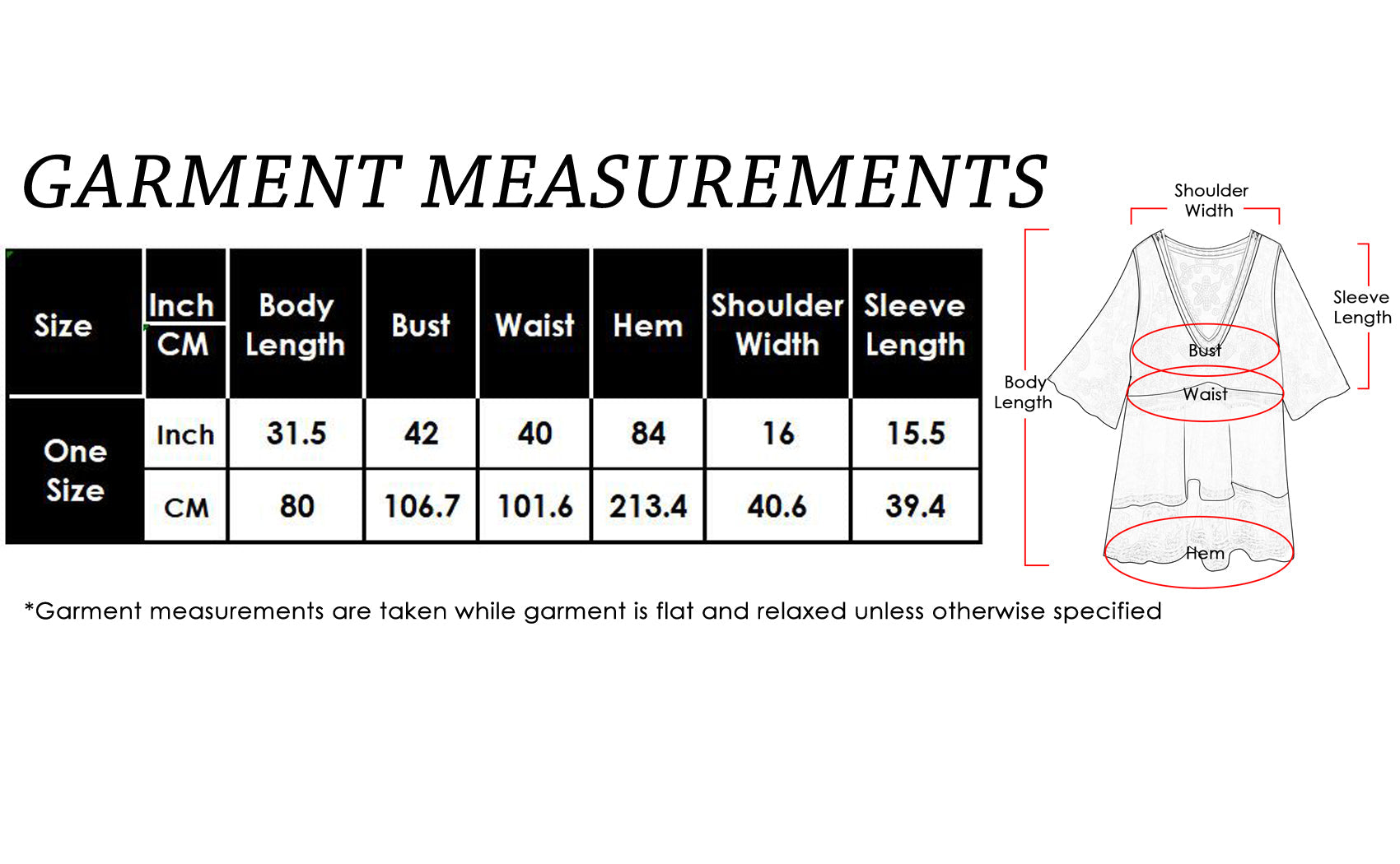 ONE SIZE. Bust: 42" | Body Length: 31.5" | Sleeve Length: 15.5" | Waist: 40" | Hem: 84" | Shoulder Width: 16"