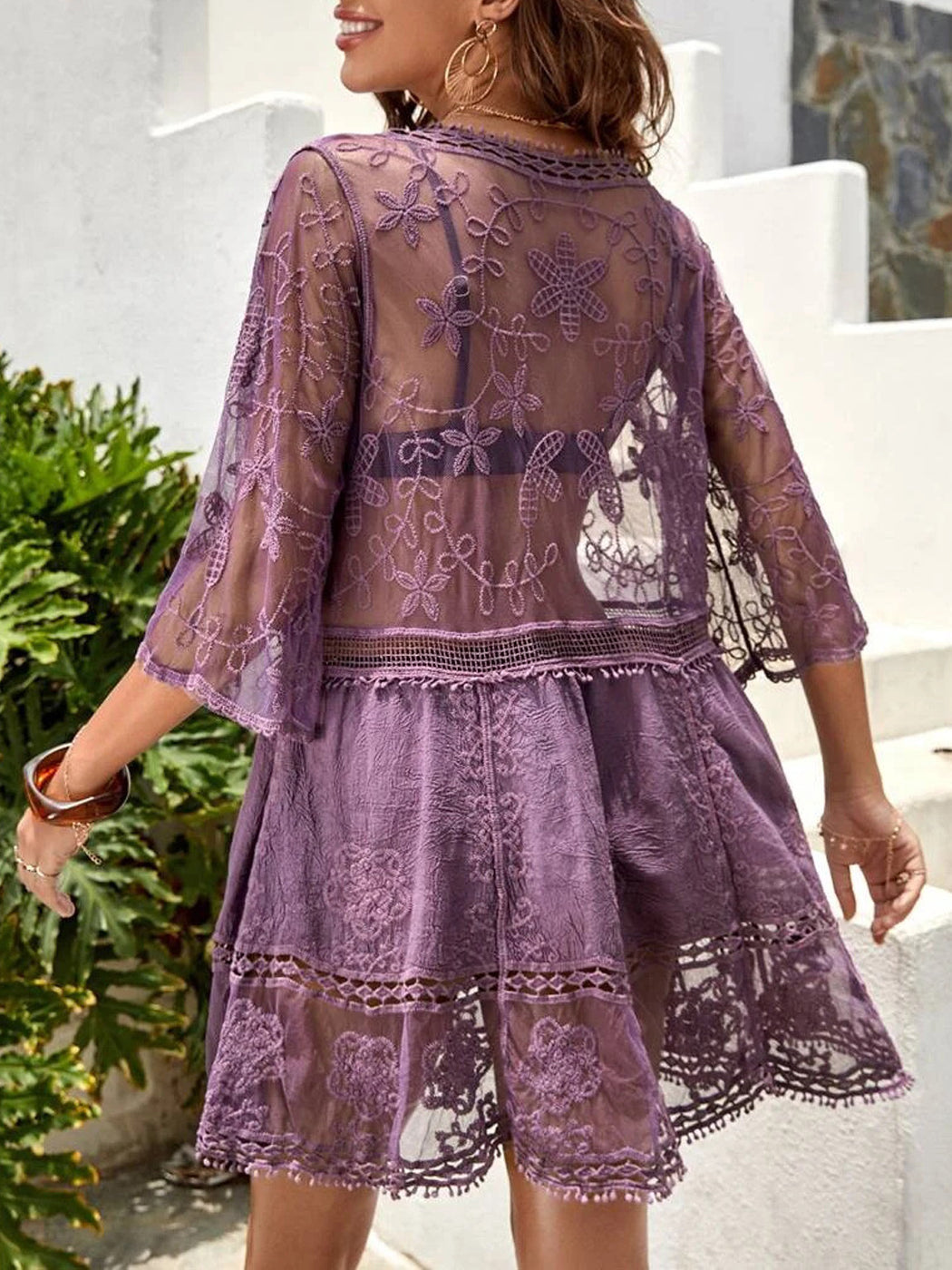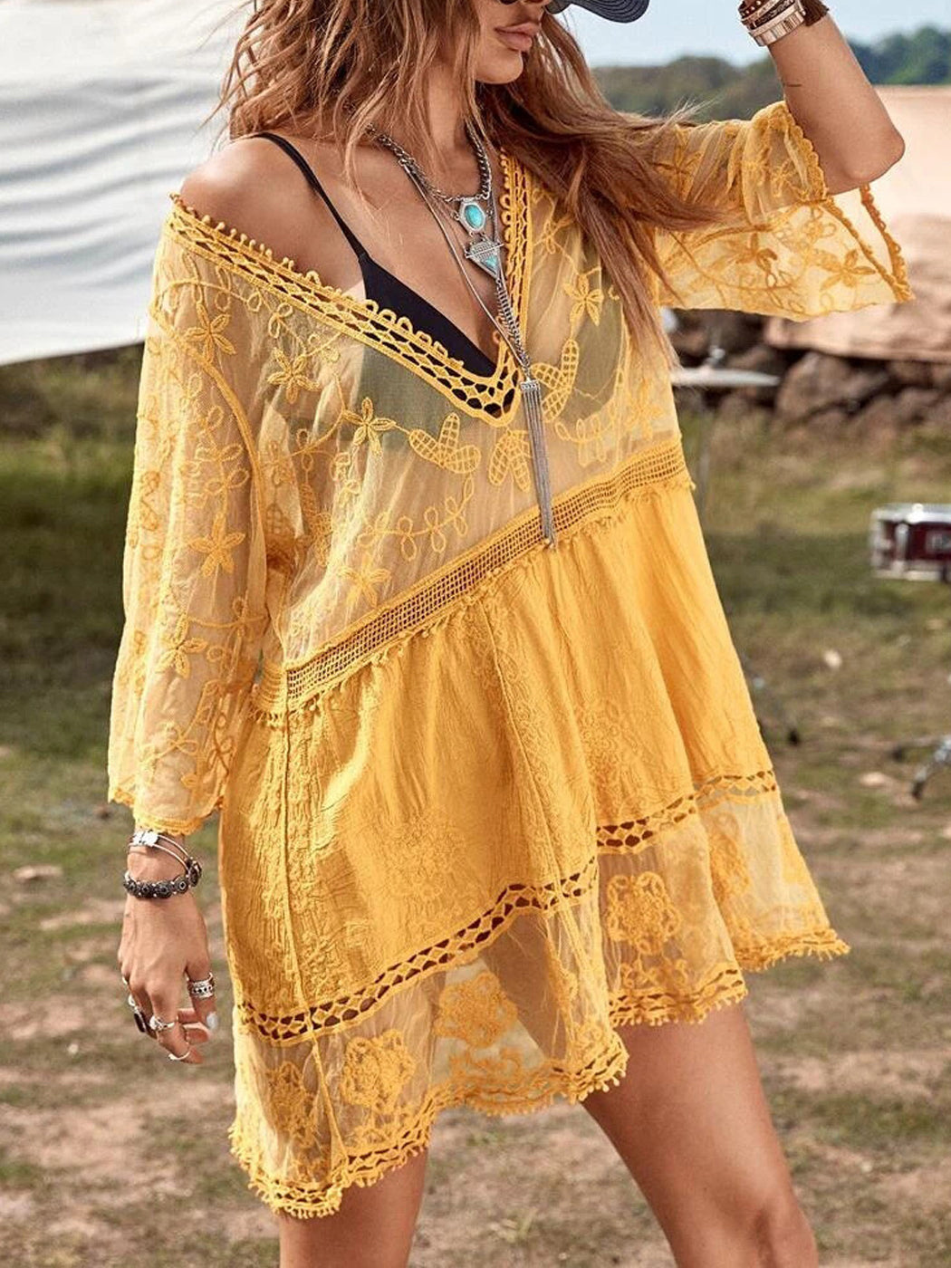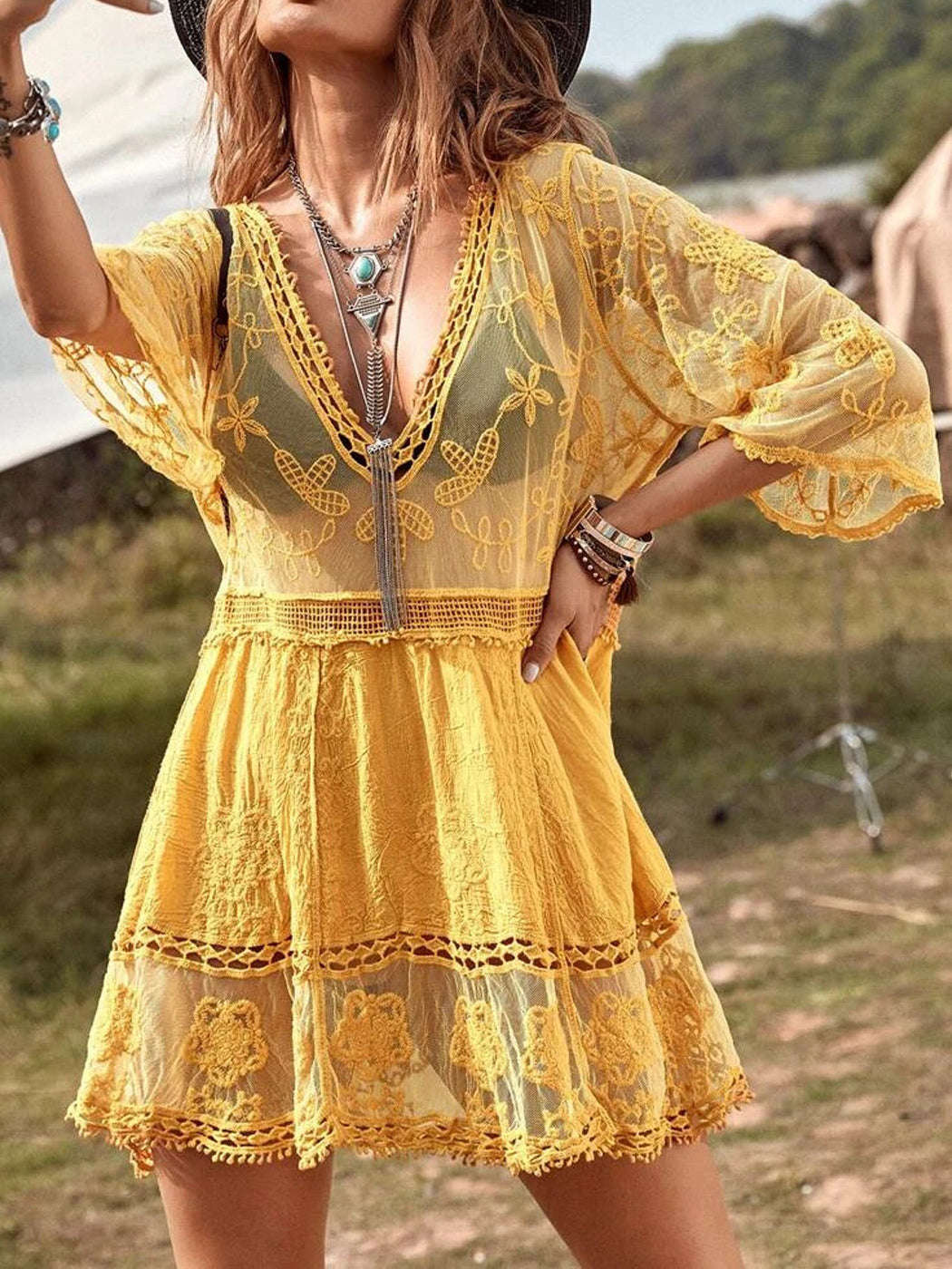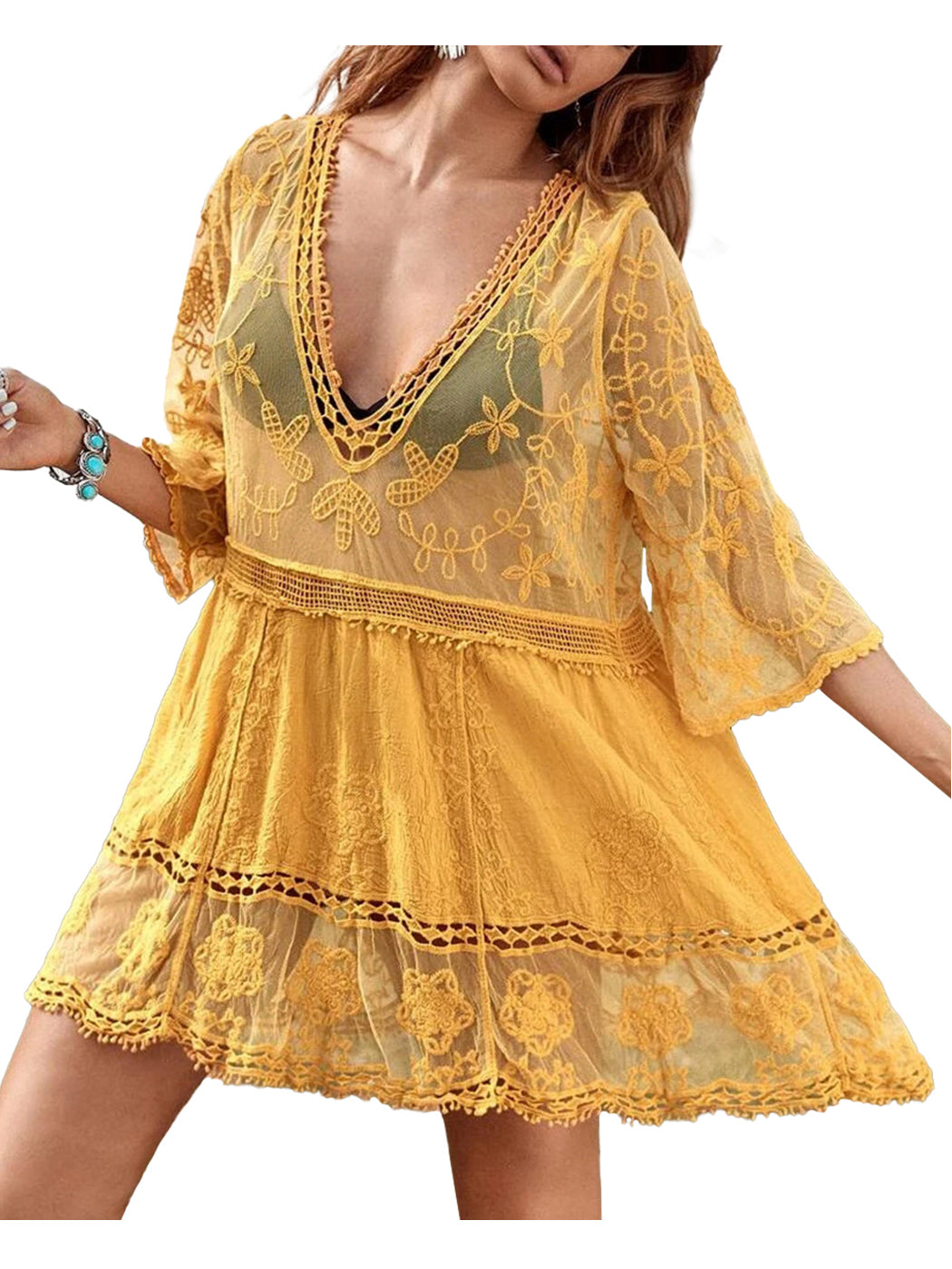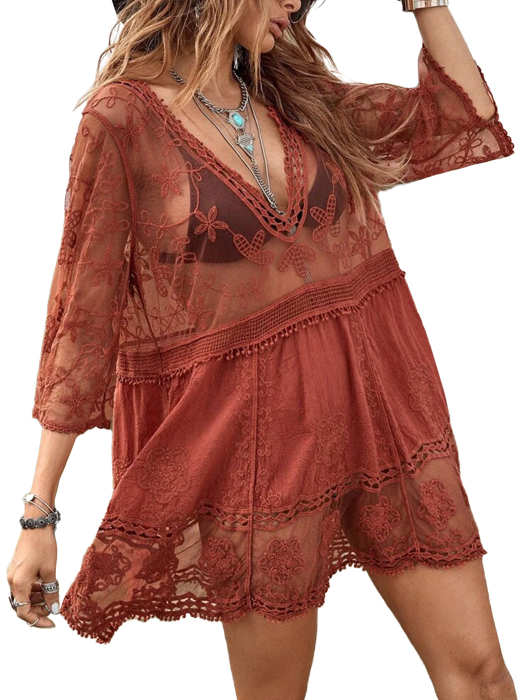 MATERIAL. Made of soft breathable and lightweight fabric, very comfortable, slight stretch. FEATURE. Crochet, contrast lace plunging cover-up, hollow out, v neck, 3/4 sleeve, mesh, mini length, See Through, embroidered romantic leafy floral design, hem flowy babydoll beach dress.