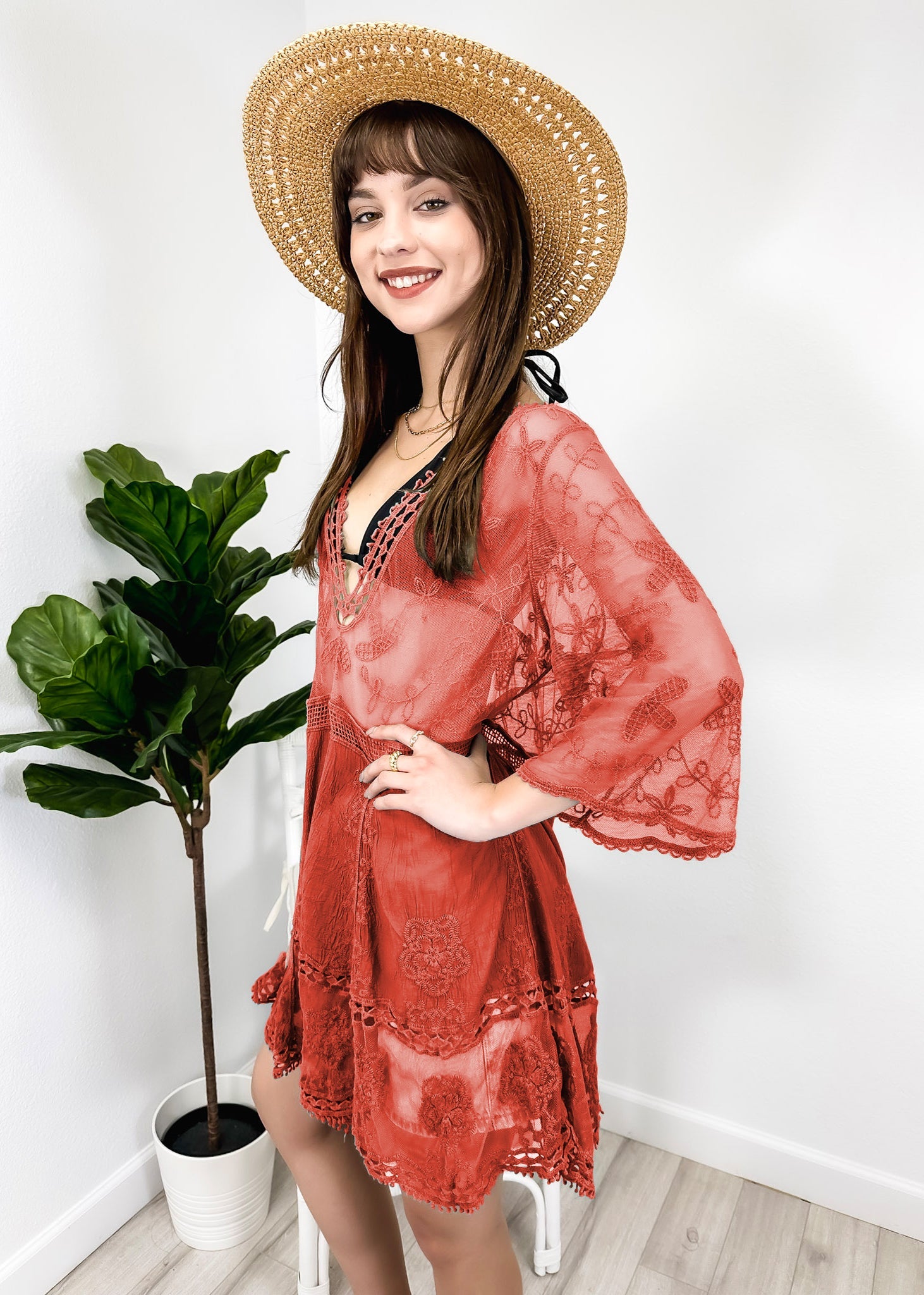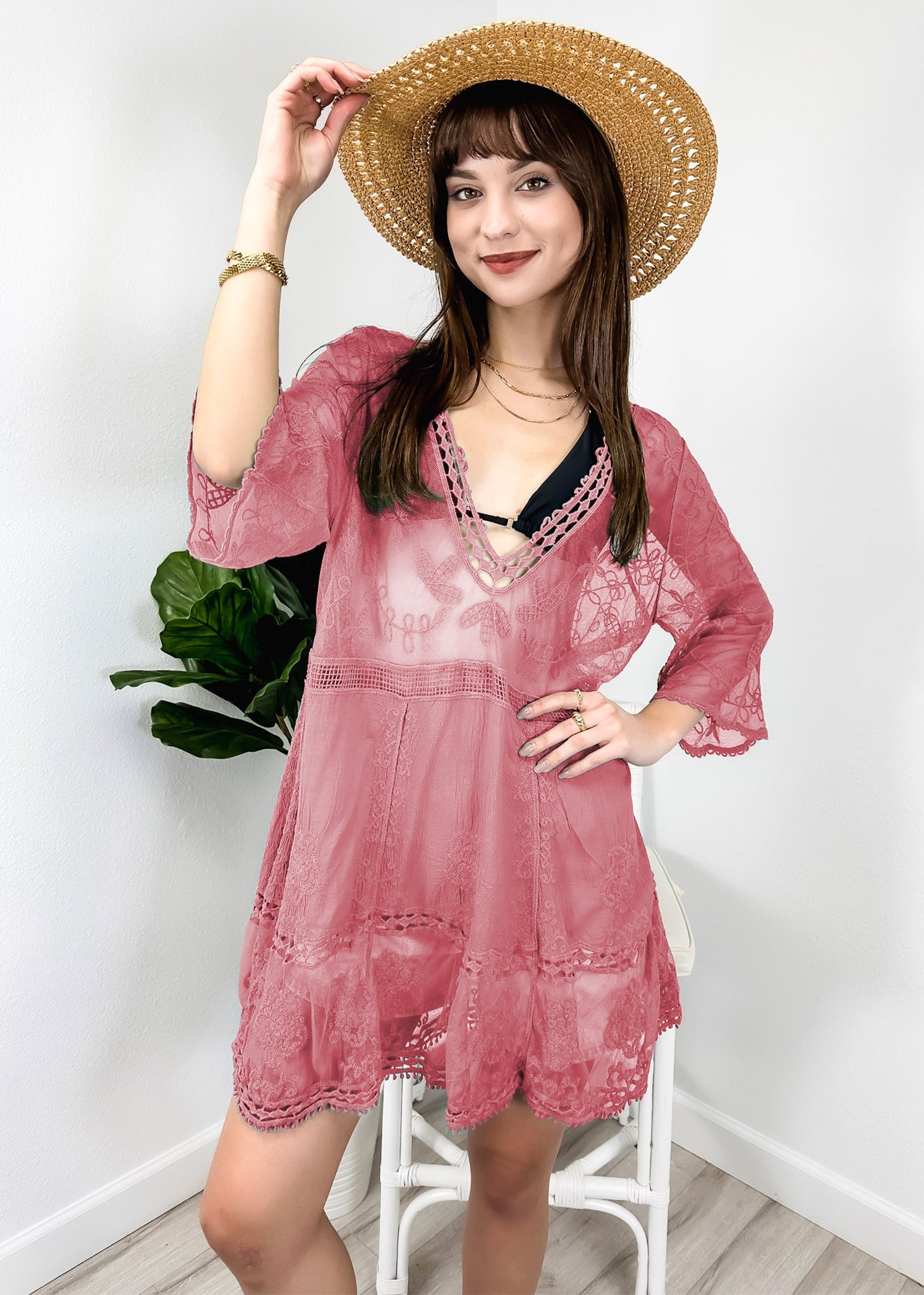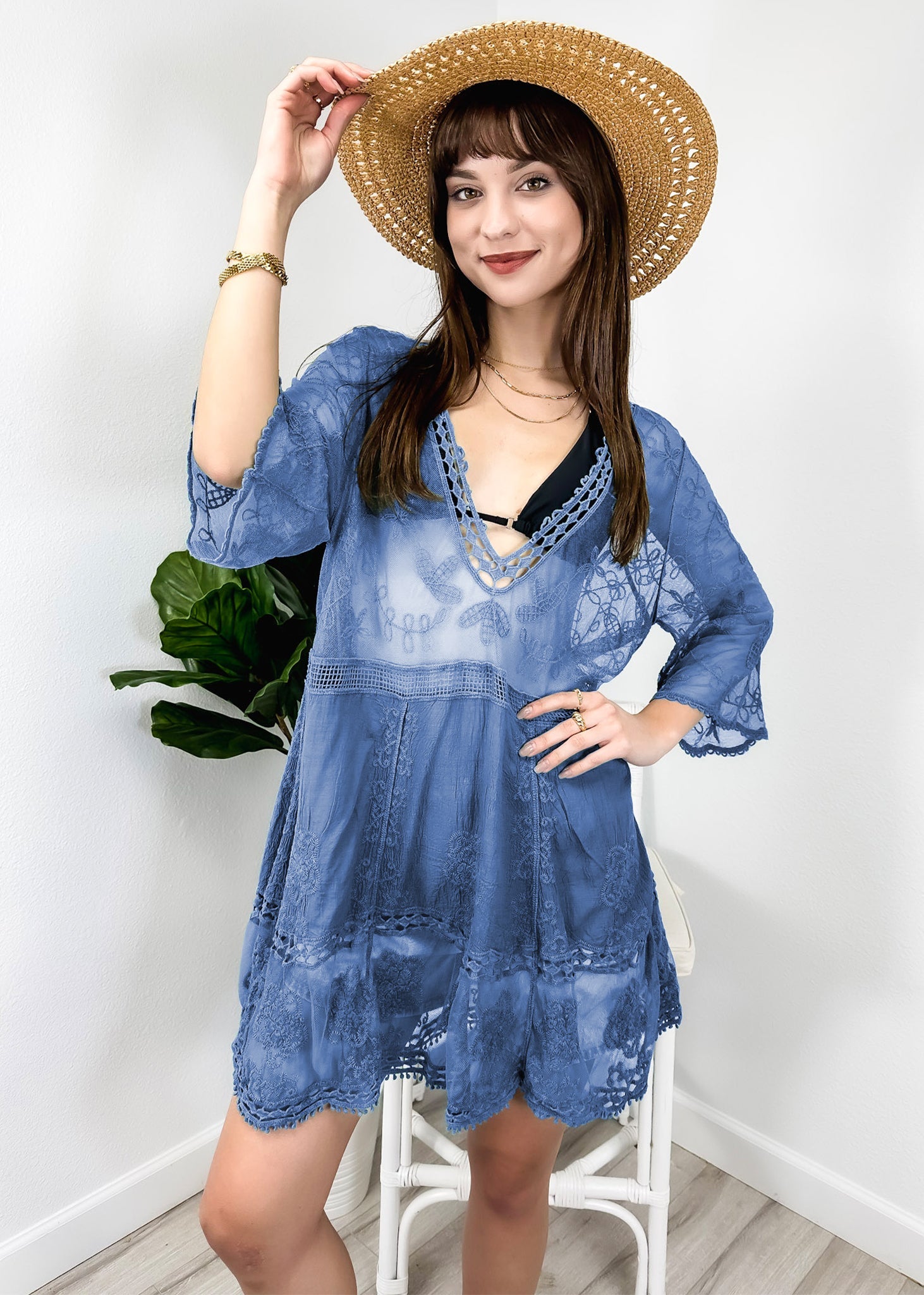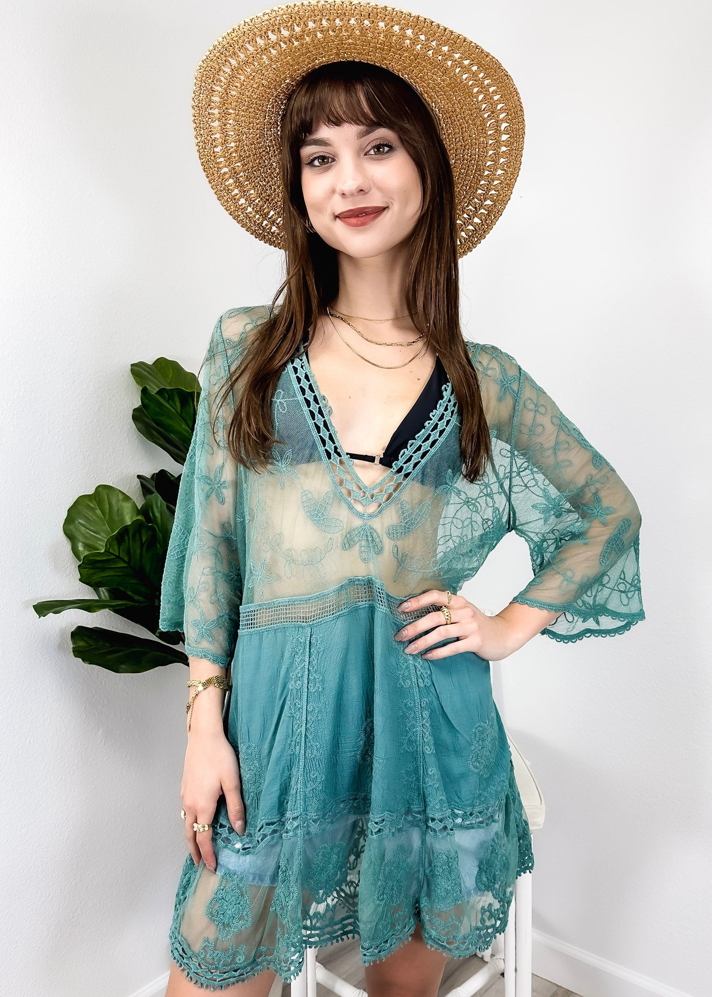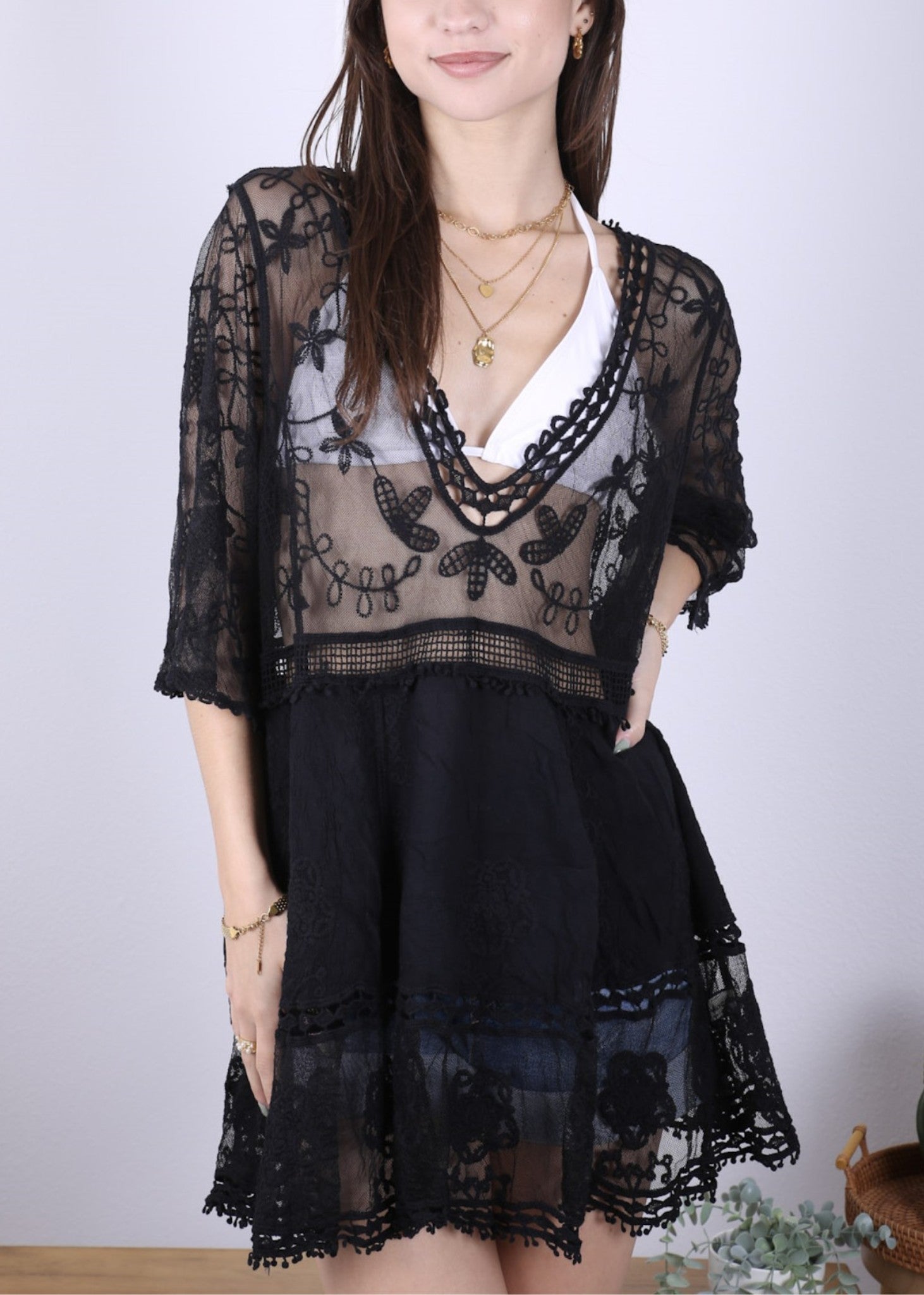 MATERIAL. Made of soft breathable and lightweight fabric, very comfortable, slight stretch. FEATURE. Crochet, contrast lace plunging cover-up, hollow out, v neck, 3/4 sleeve, mesh, mini length, See Through, embroidered romantic leafy floral design, hem flowy babydoll beach dress.