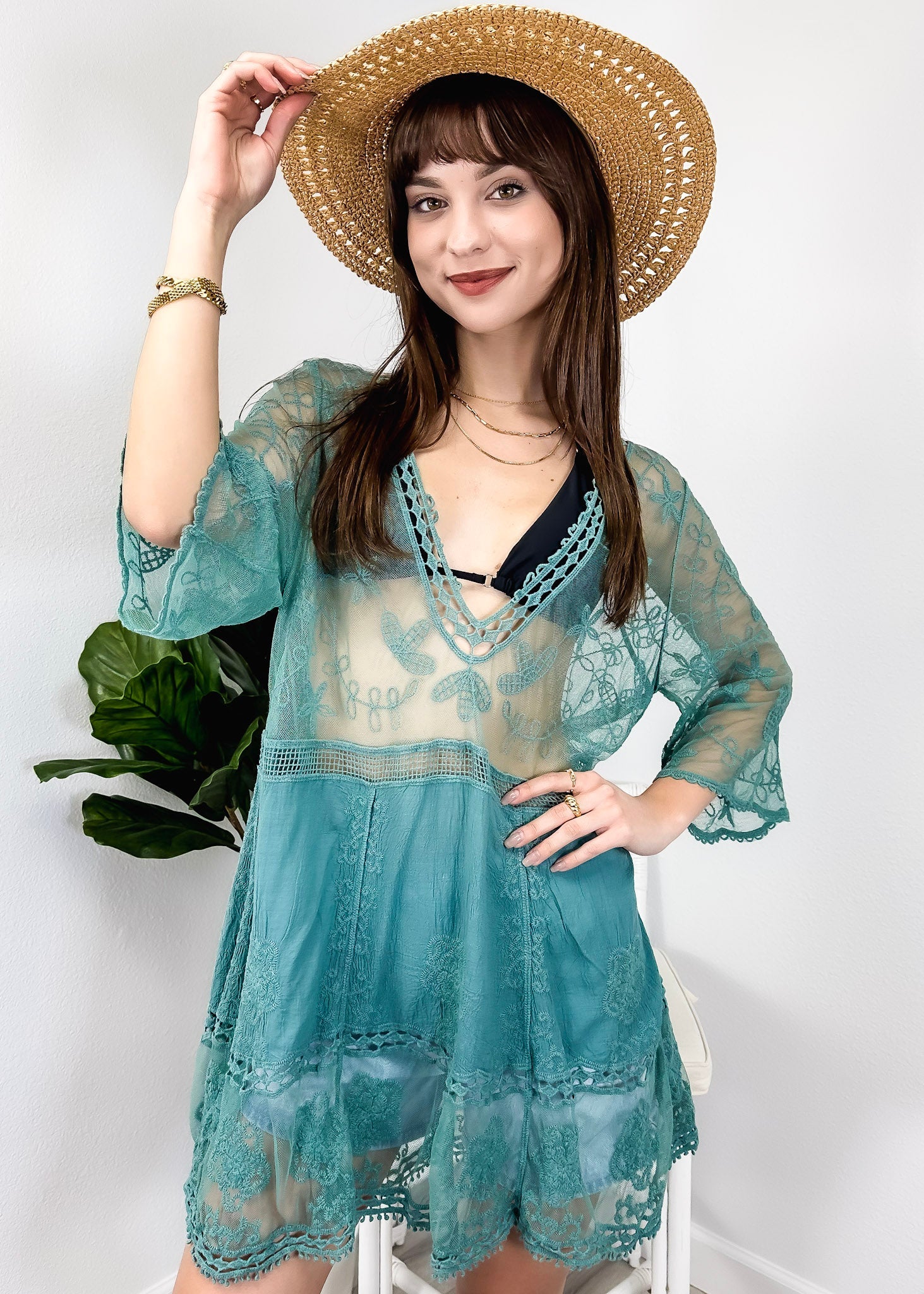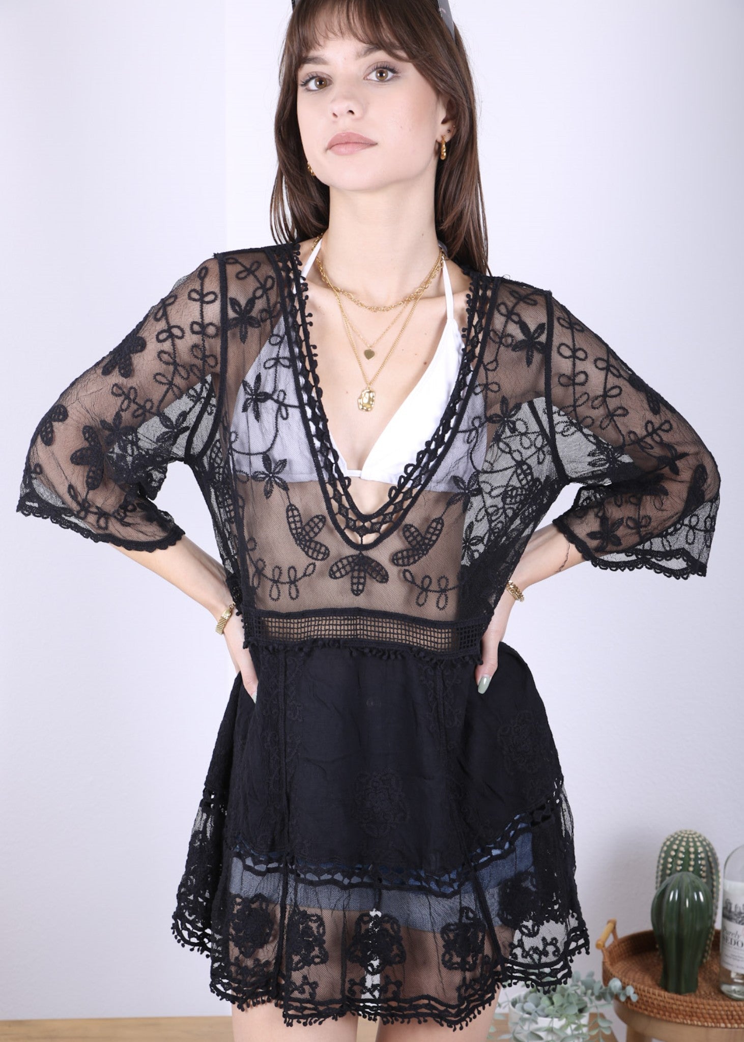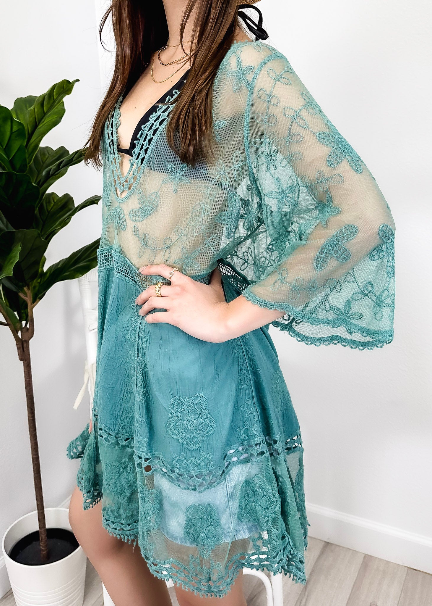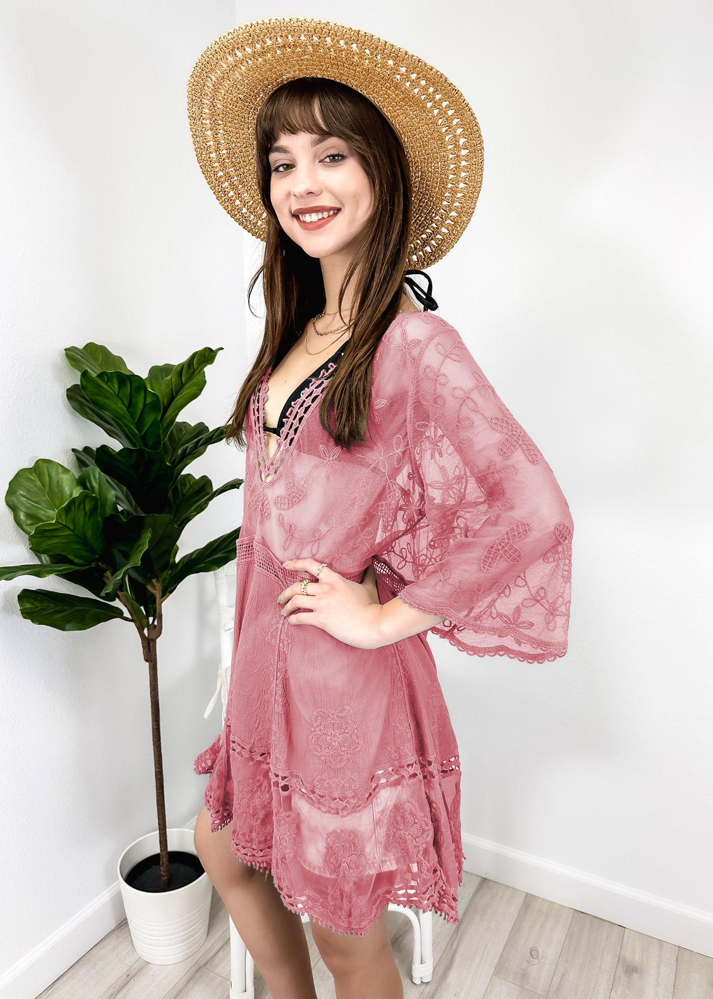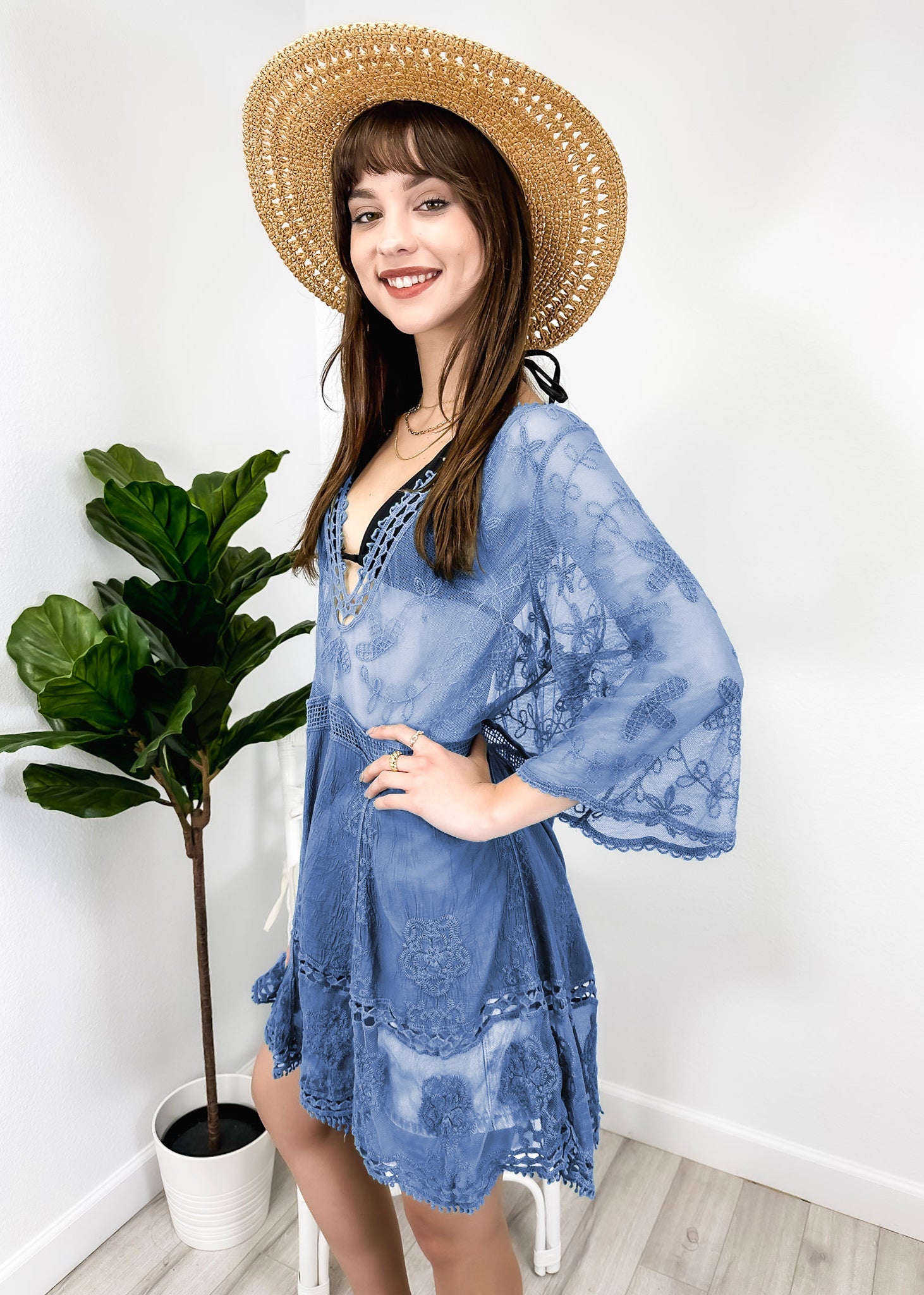 MATERIAL. Made of soft breathable and lightweight fabric, very comfortable, slight stretch. FEATURE. Crochet, contrast lace plunging cover-up, hollow out, v neck, 3/4 sleeve, mesh, mini length, See Through, embroidered romantic leafy floral design, hem flowy babydoll beach dress.