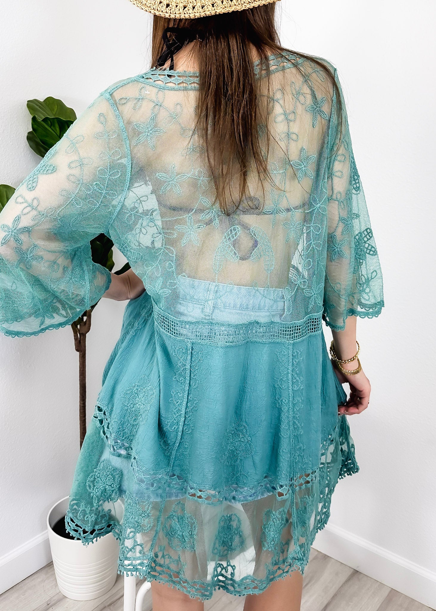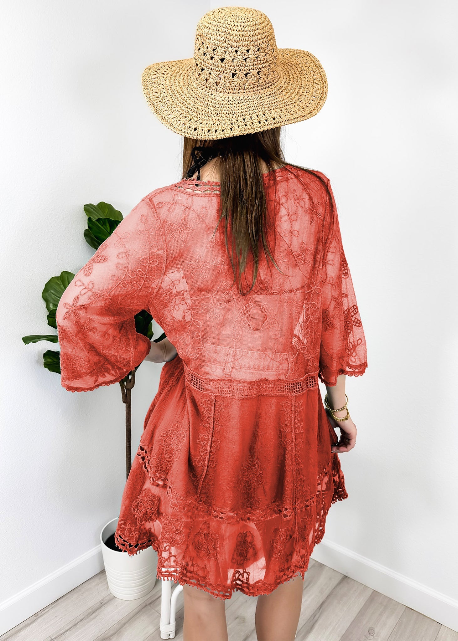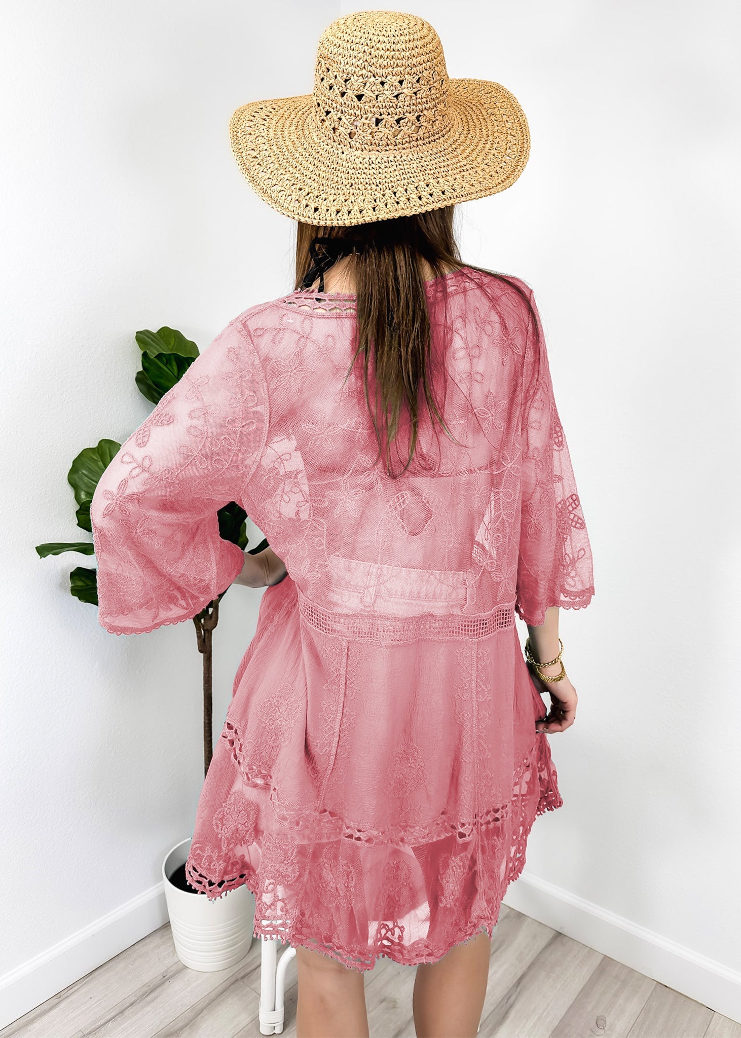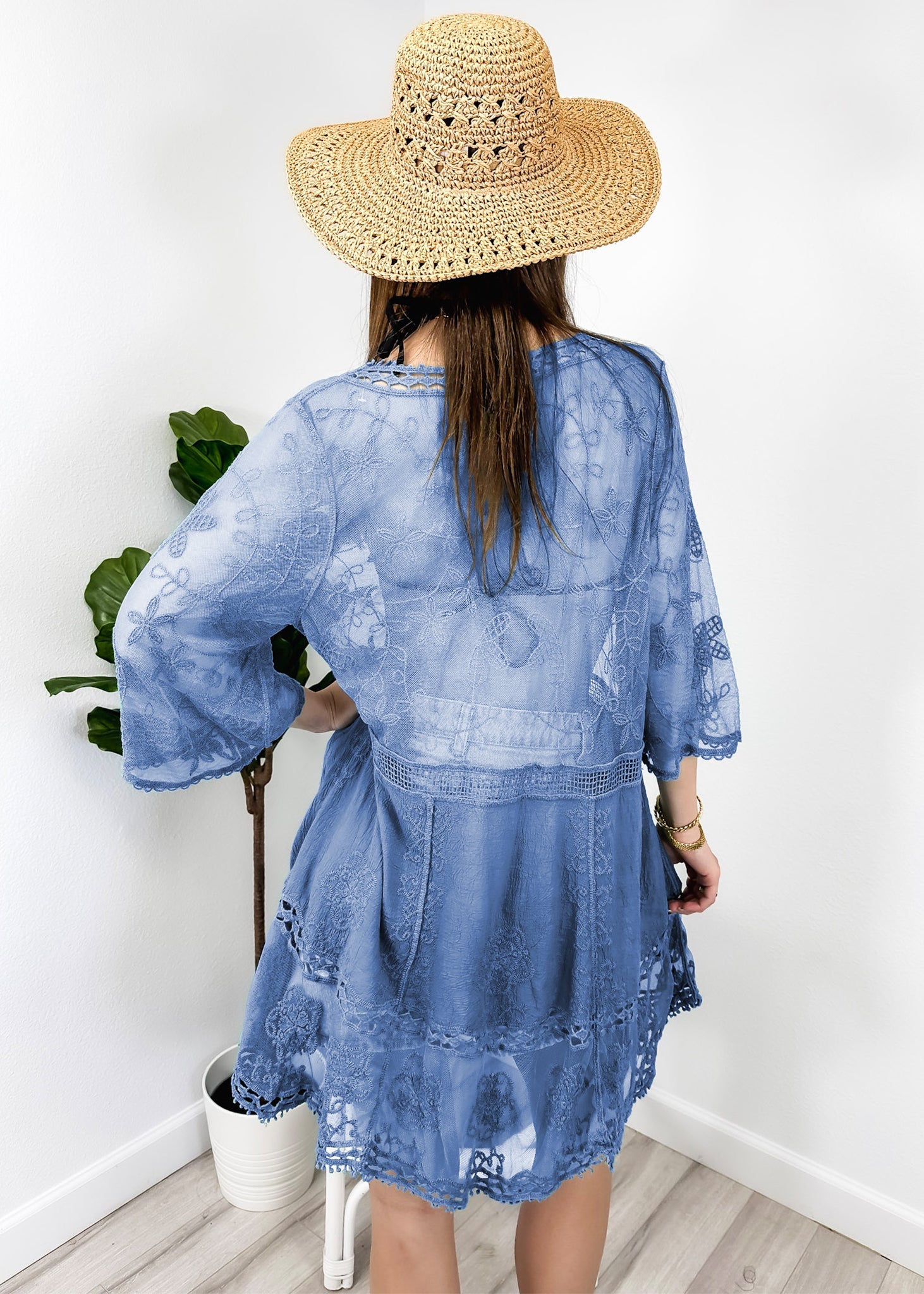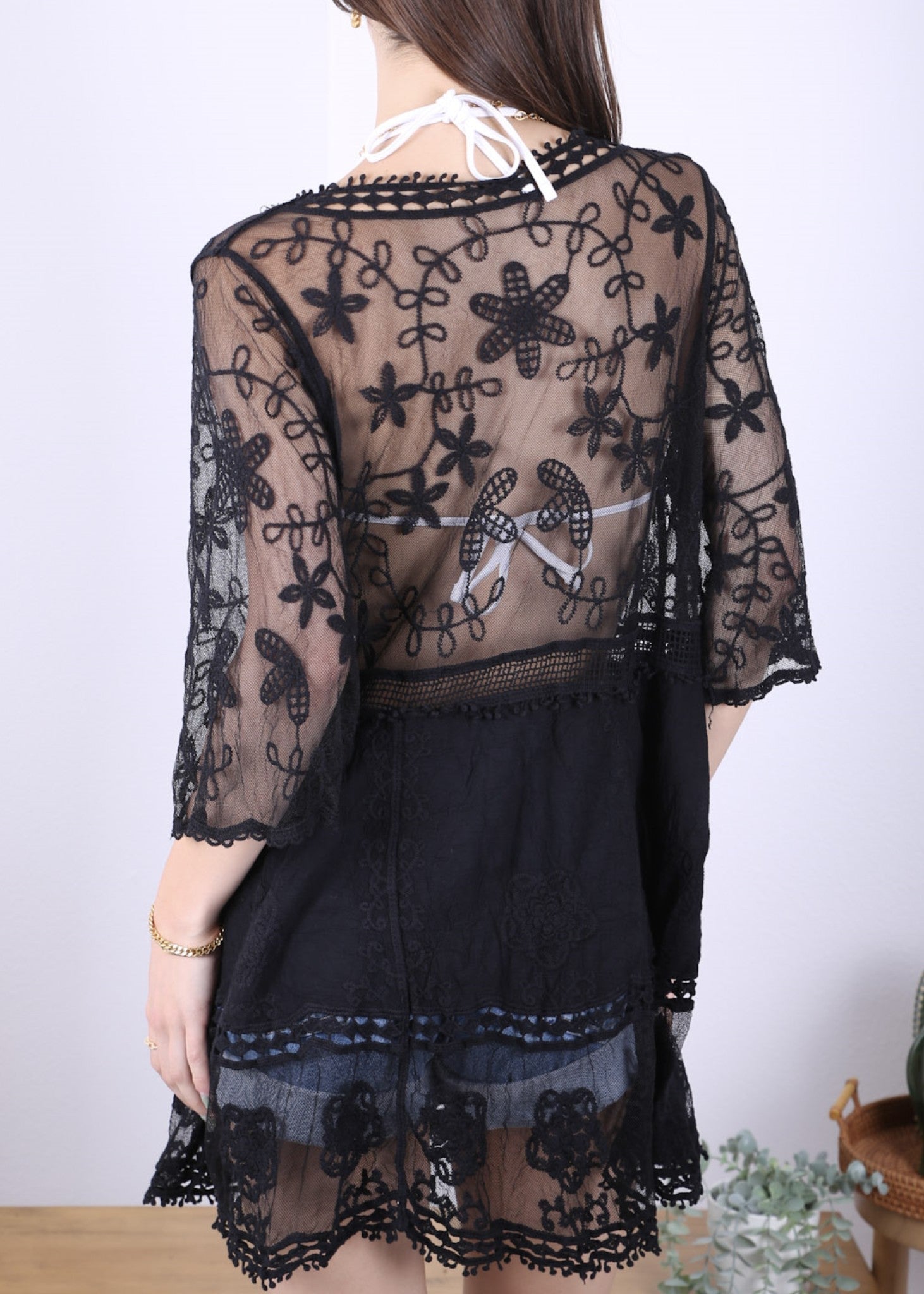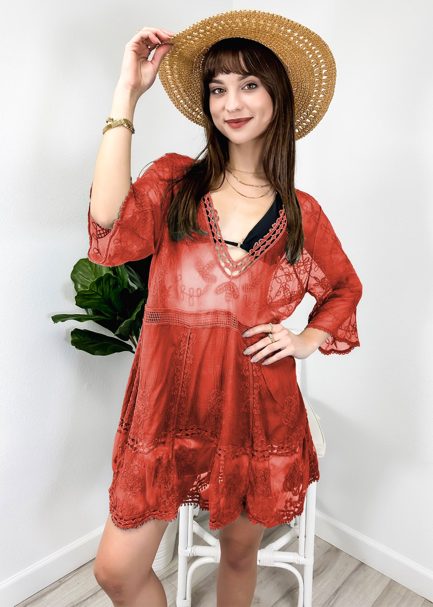 MATERIAL. Made of soft breathable and lightweight fabric, very comfortable, slight stretch. FEATURE. Crochet, contrast lace plunging cover-up, hollow out, v neck, 3/4 sleeve, mesh, mini length, See Through, embroidered romantic leafy floral design, hem flowy babydoll beach dress.