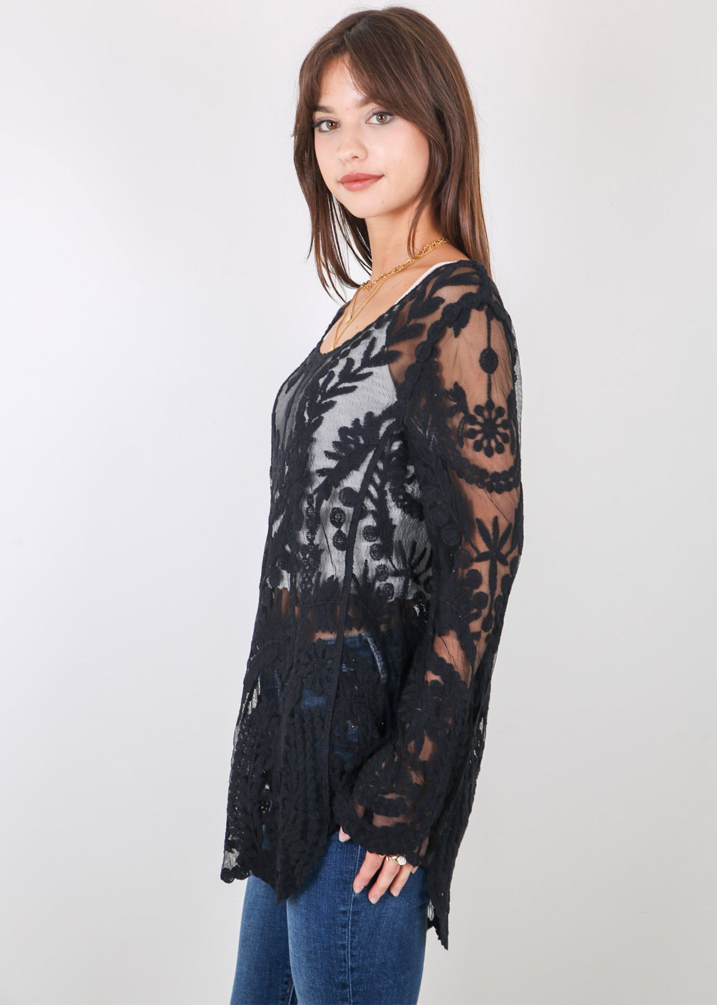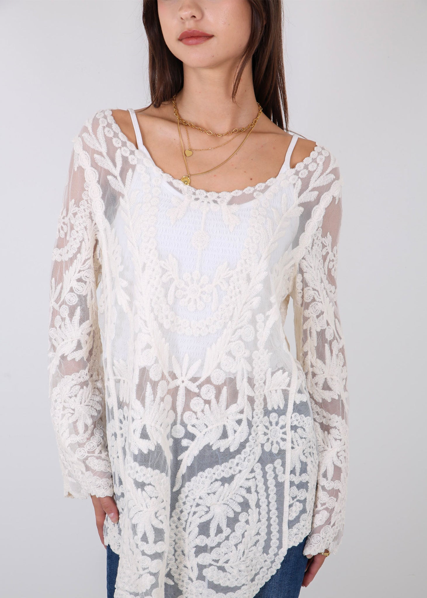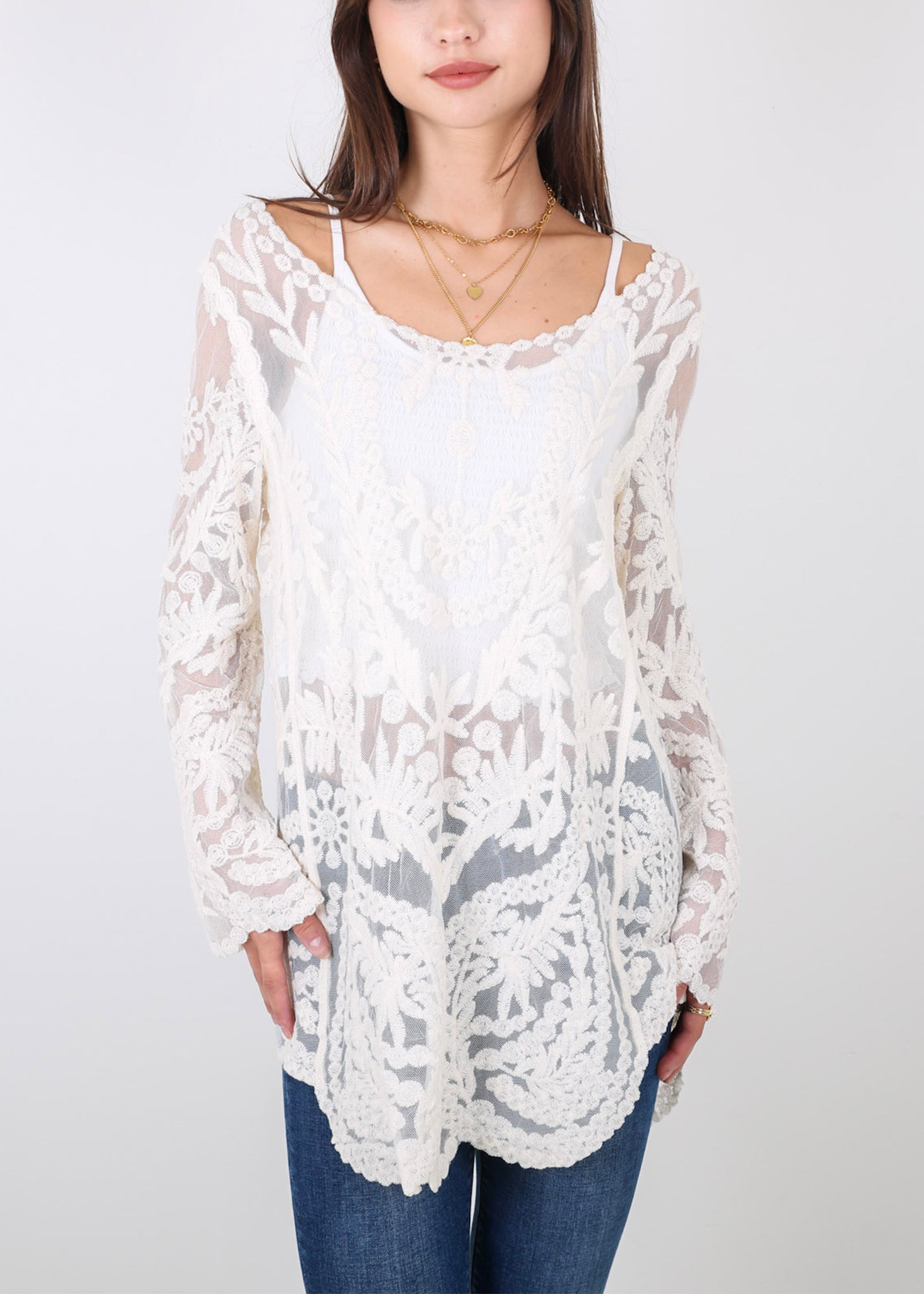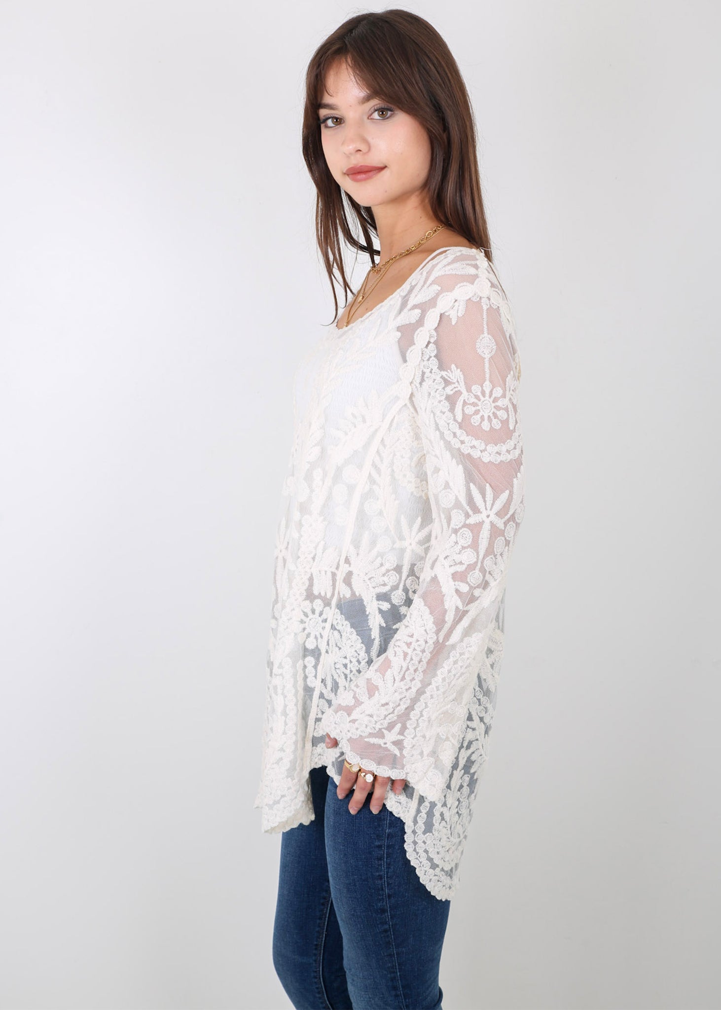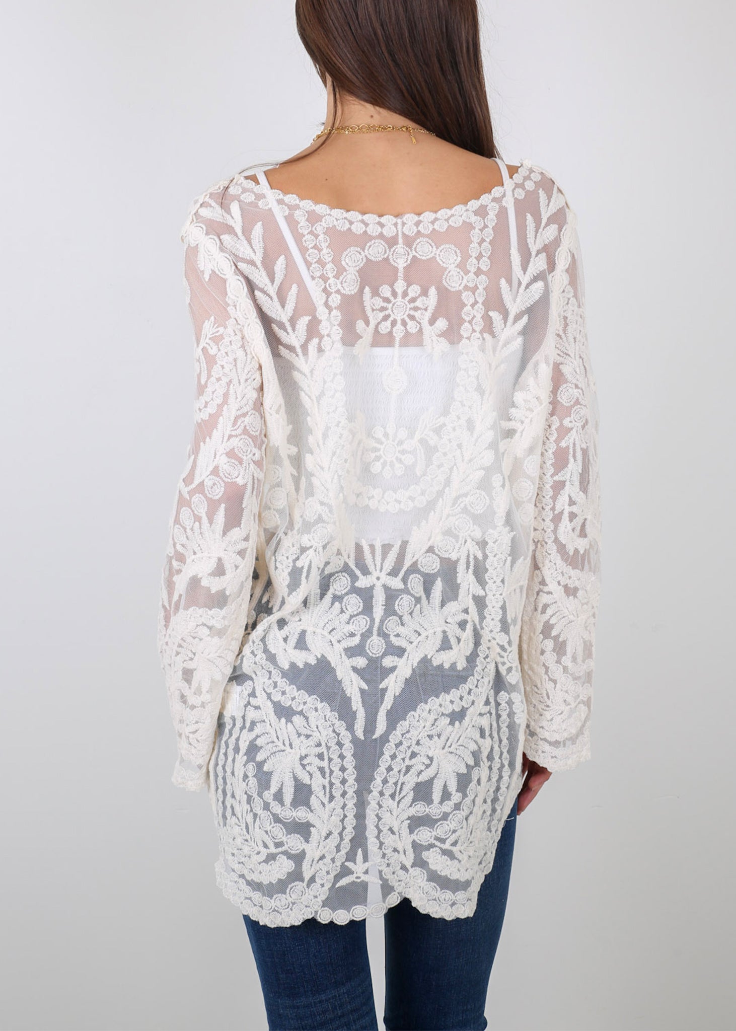 MATERIAL. Made of soft breathable and lightweight fabric, very comfortable, slight stretch. FEATURE. Crochet, contrast lace plunging cover-up, hollow out, v neck, 3/4 sleeve, mesh, mini length, See Through, embroidered romantic leafy floral design, hem flowy babydoll beach dress.